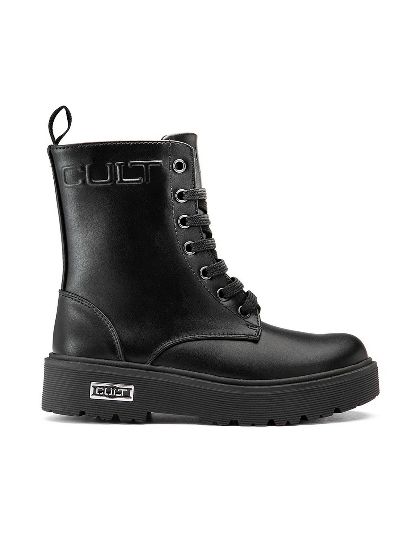 Realizzati in pelle nera di alta qualità, presentano una tomaia liscia con logo CULT in rilievo sul lato e dettagli metallici che ne esaltano il carattere urban-rock. La chiusura con lacci frontali e zip laterale rende la calzata pratica e sicura.