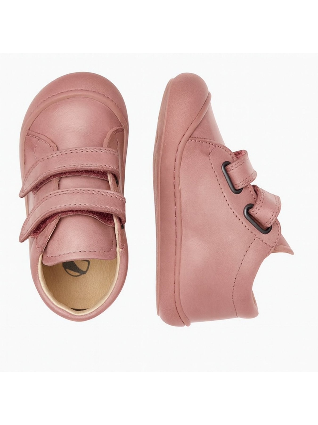 Realizzata in morbida pelle rosa, è dotata di doppia chiusura a strappo che rende la calzata pratica, sicura e regolabile. La fodera interna traspirante mantiene il piede asciutto e confortevole, mentre il sottopiede anatomico sostiene la crescita naturale.