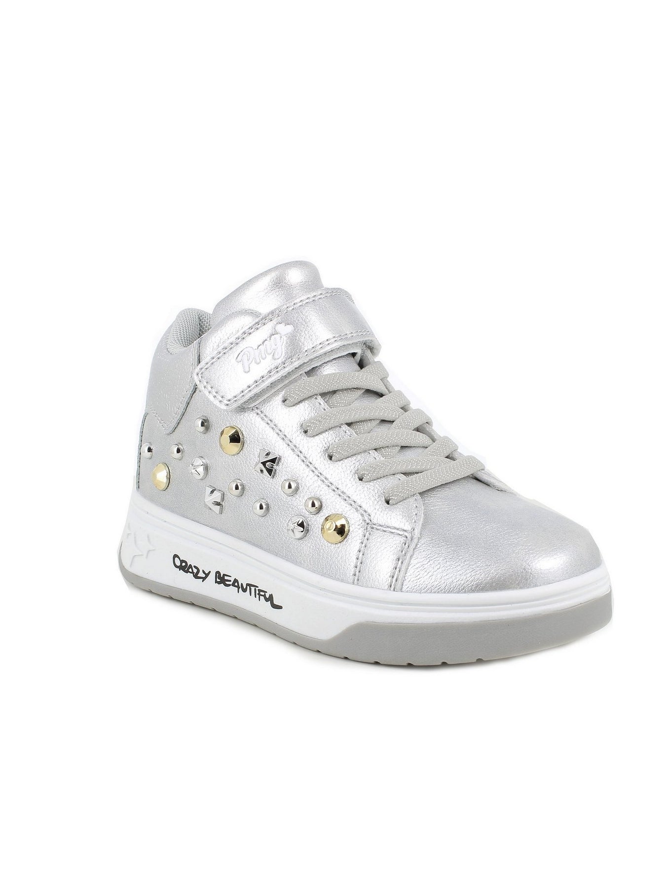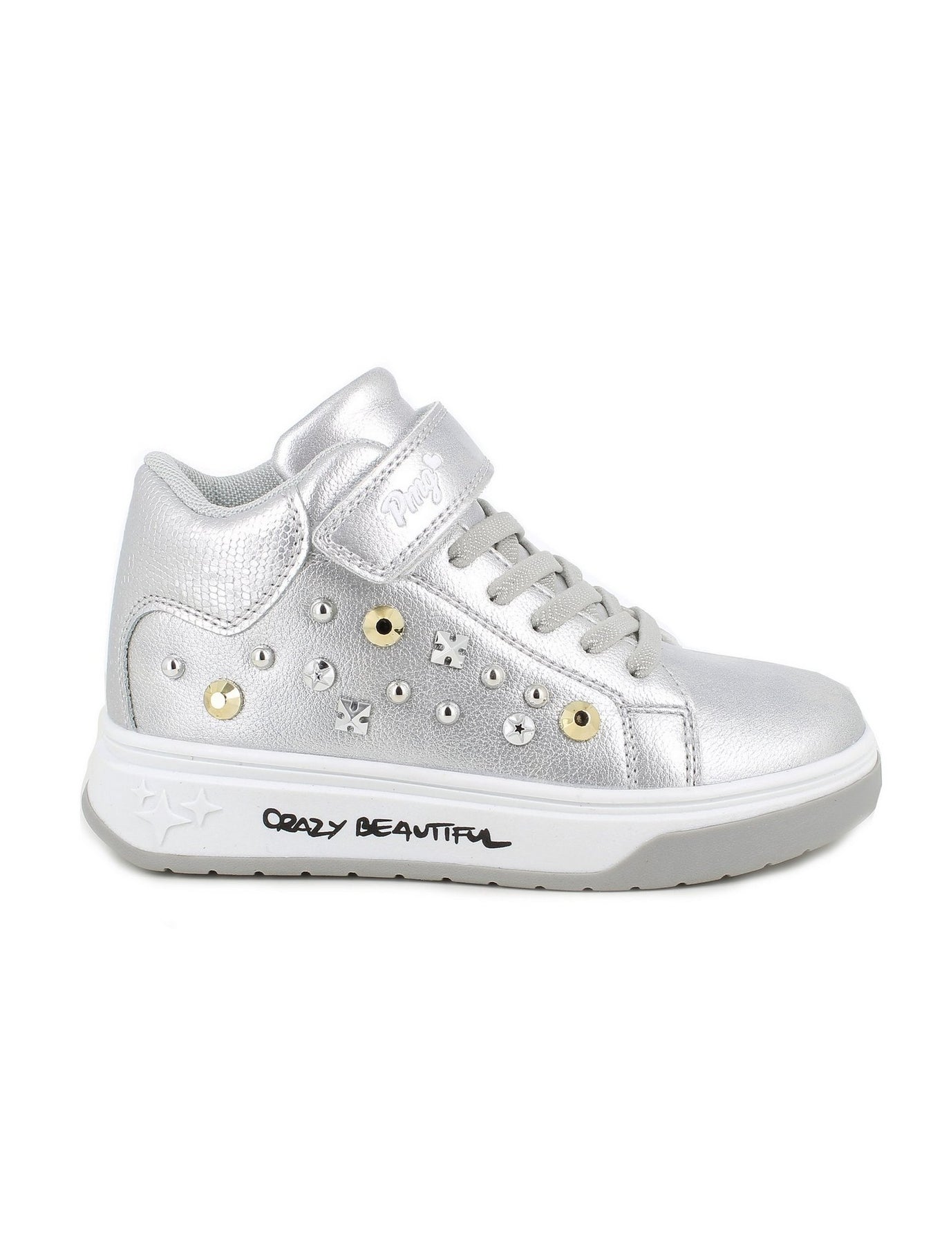 La sneaker PRIMIGI AVANT 89733 Argento è pensata per le bambine che vogliono brillare con stile. Realizzata in materiale effetto metallizzato argento, è arricchita da borchie dorate e argentate e dalla scritta “Crazy Beautiful” sulla suola, per un look originale e alla moda.