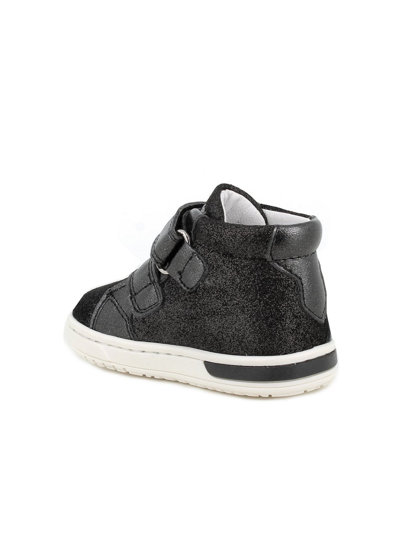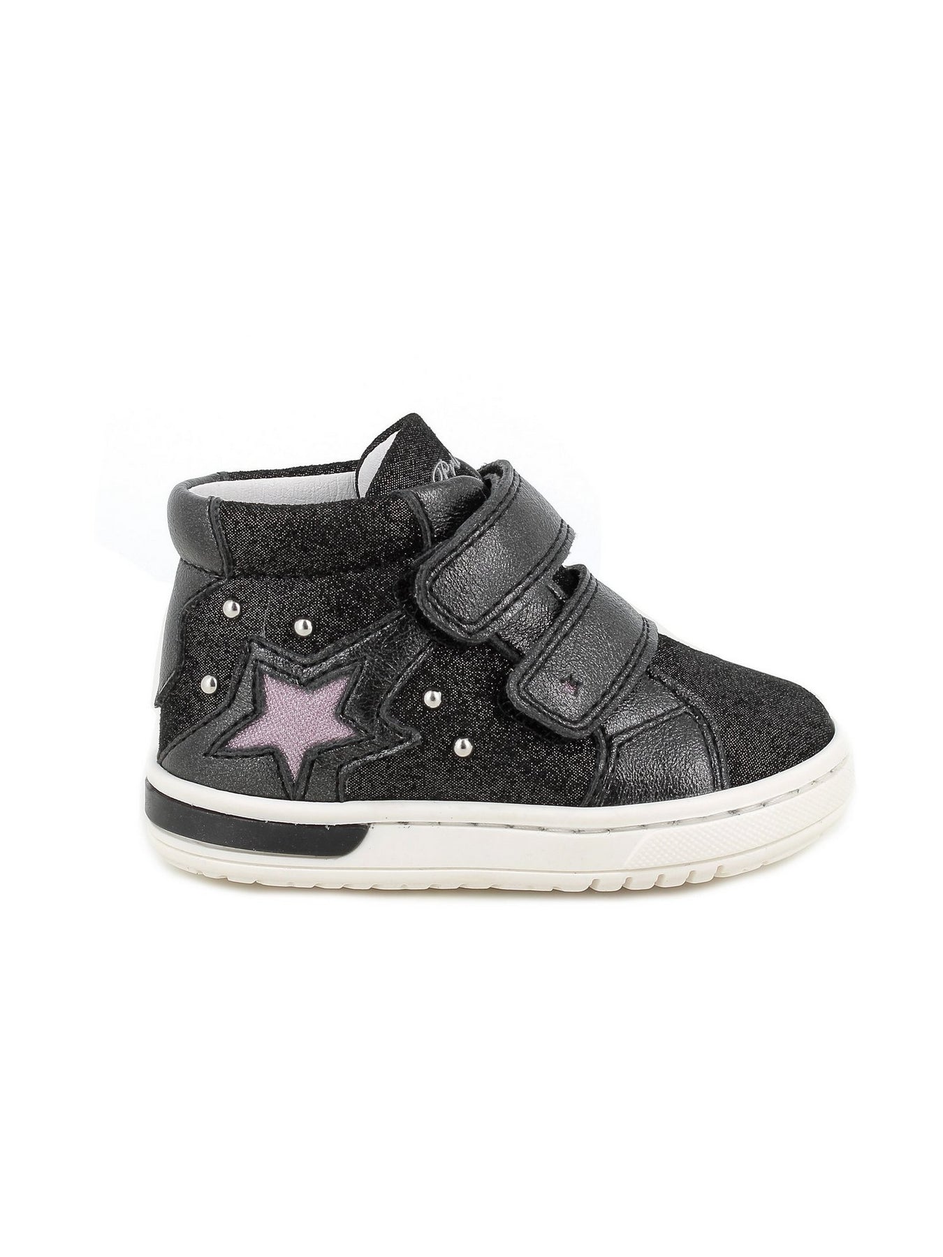 La sneaker PRIMIGI 89062 Nero è pensata per i primi passi con un mix di comfort e stile scintillante. Realizzata in materiale glitterato nero con inserti perlati, è decorata con una stella lilla laterale e piccoli dettagli luminosi che la rendono allegra e fashion.