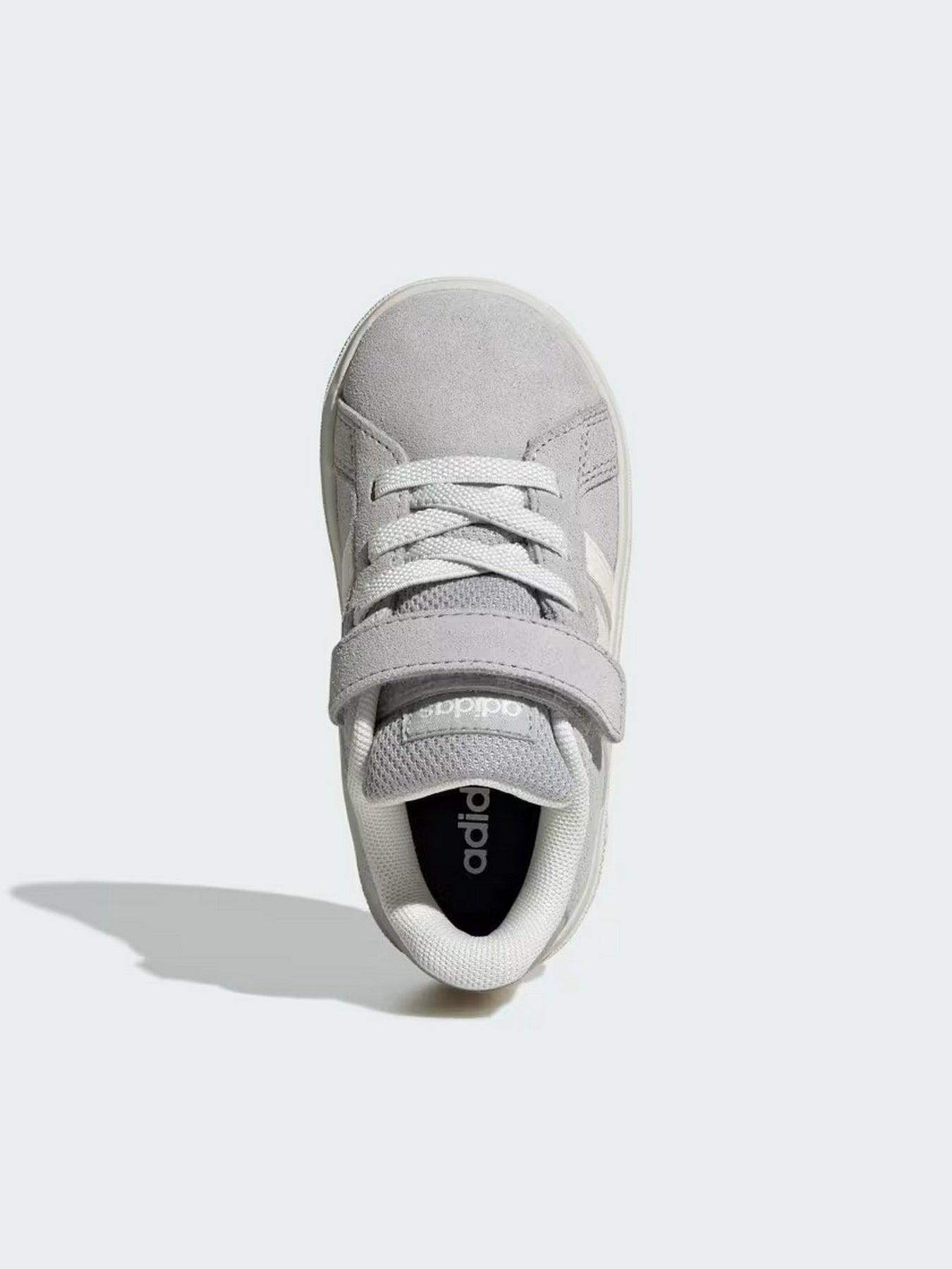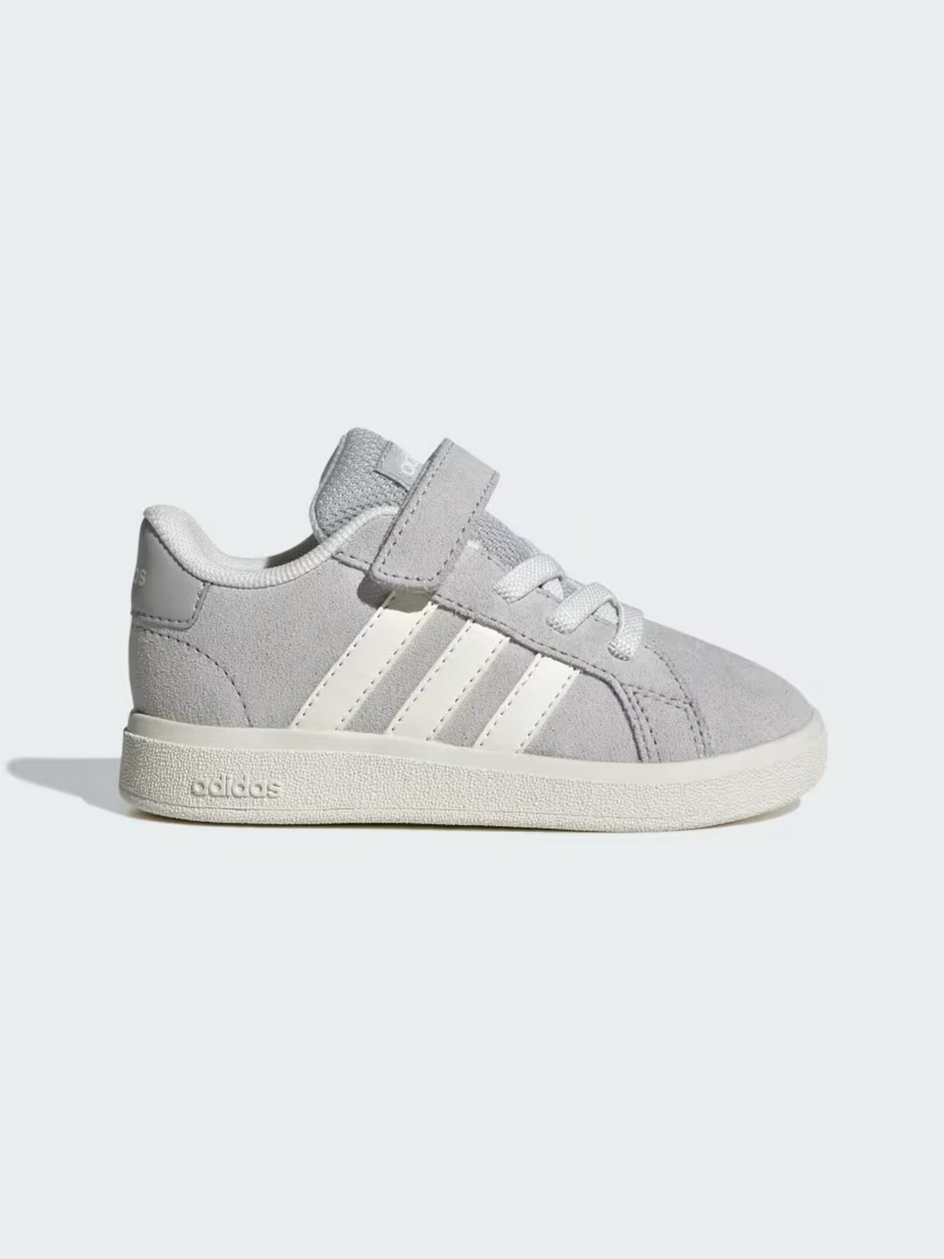 La sneaker ADIDAS Grand Court 2.0 da bambino, modello JR0782, propone uno stile essenziale e raffinato, ispirato al look delle classiche court shoes. La tomaia in suede grigio chiaro si abbina perfettamente alle 3 strisce bianche, creando un design pulito e senza tempo.