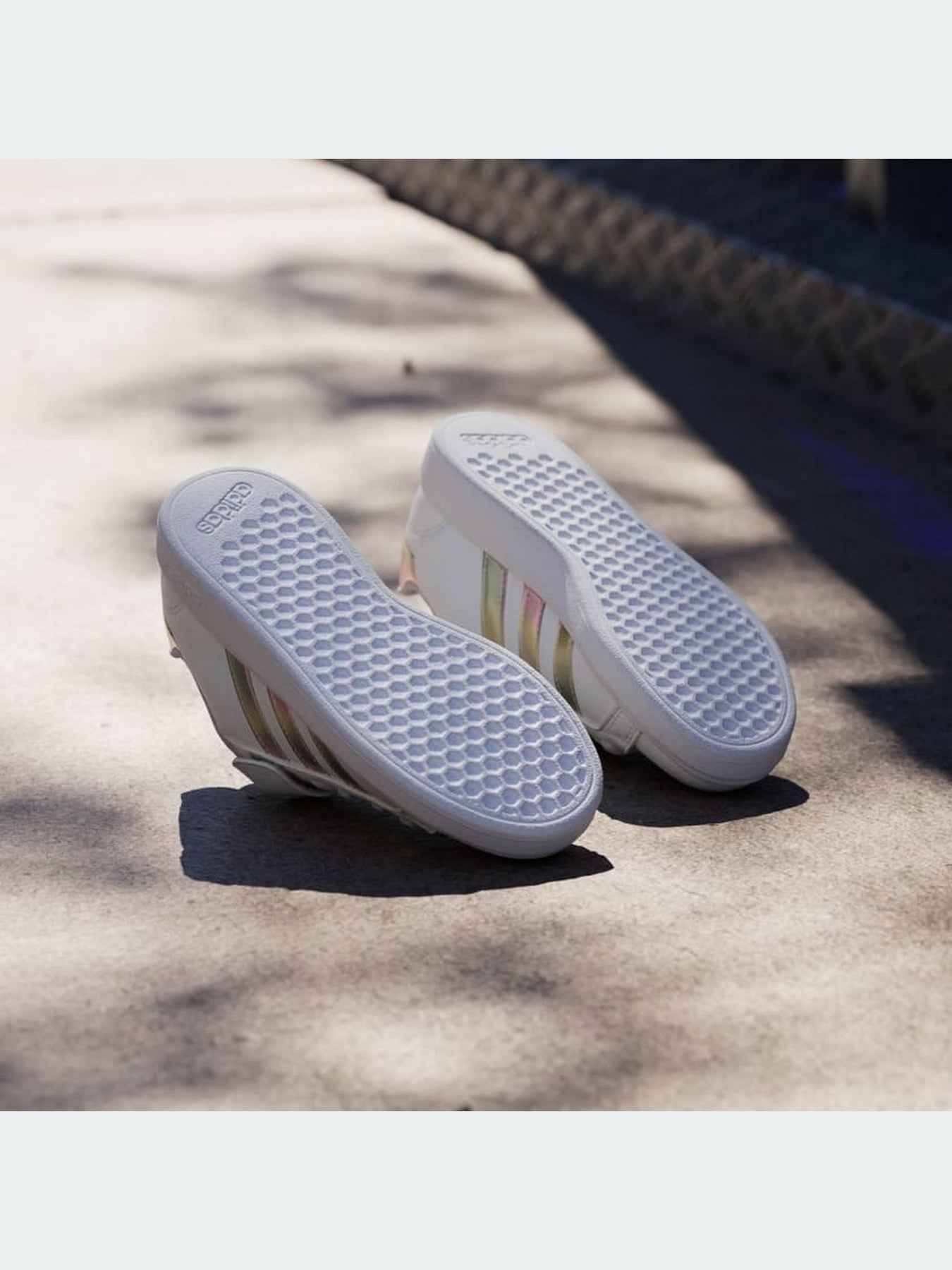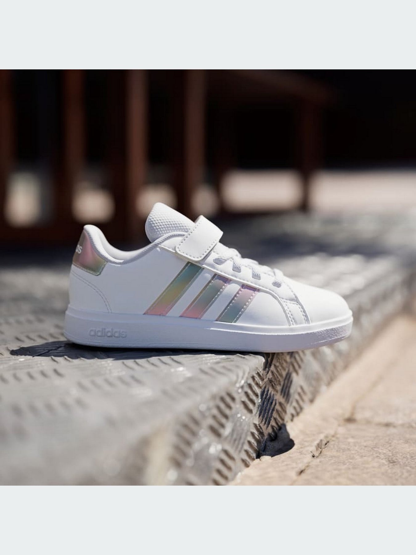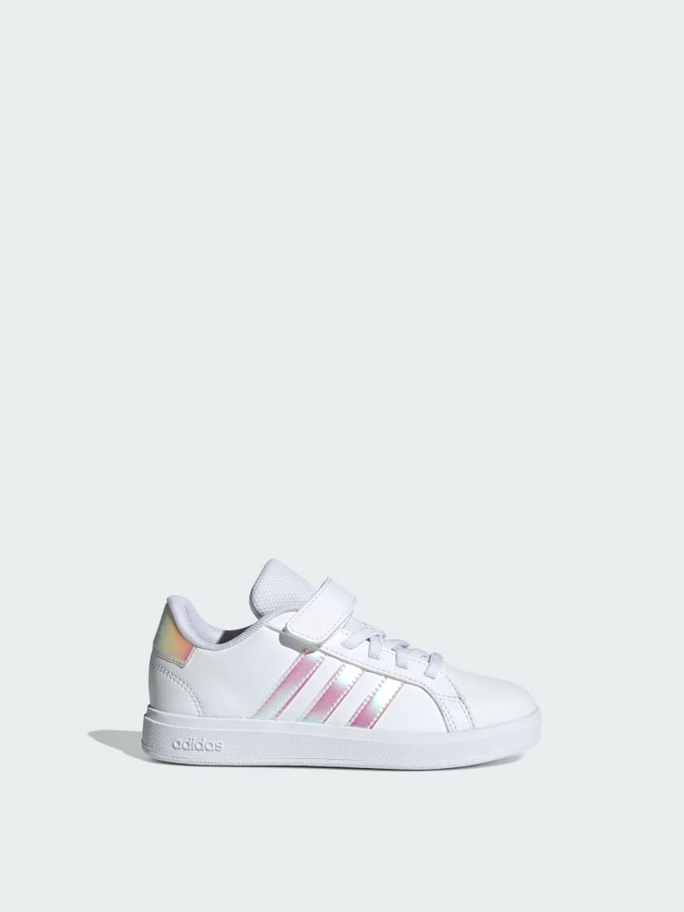 Realizzate in pelle sintetica bianca resistente, presentano le iconiche 3-Strisce adidas in versione iridescente e un tallone coordinato per un look luminoso e moderno. La chiusura con lacci elastici e strap a velcro rende la calzata facile, veloce e sicura, perfetta per le bambine.