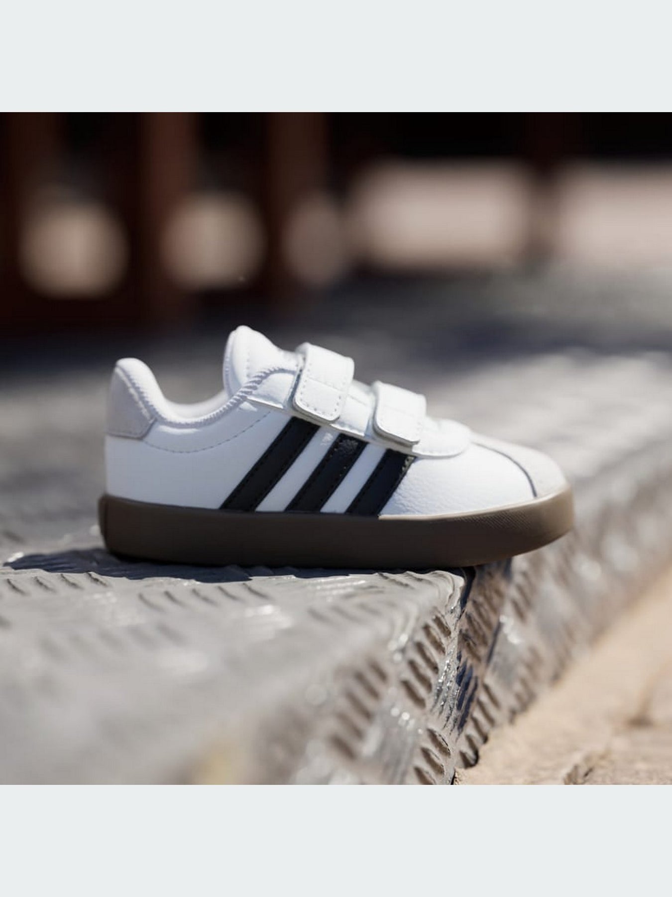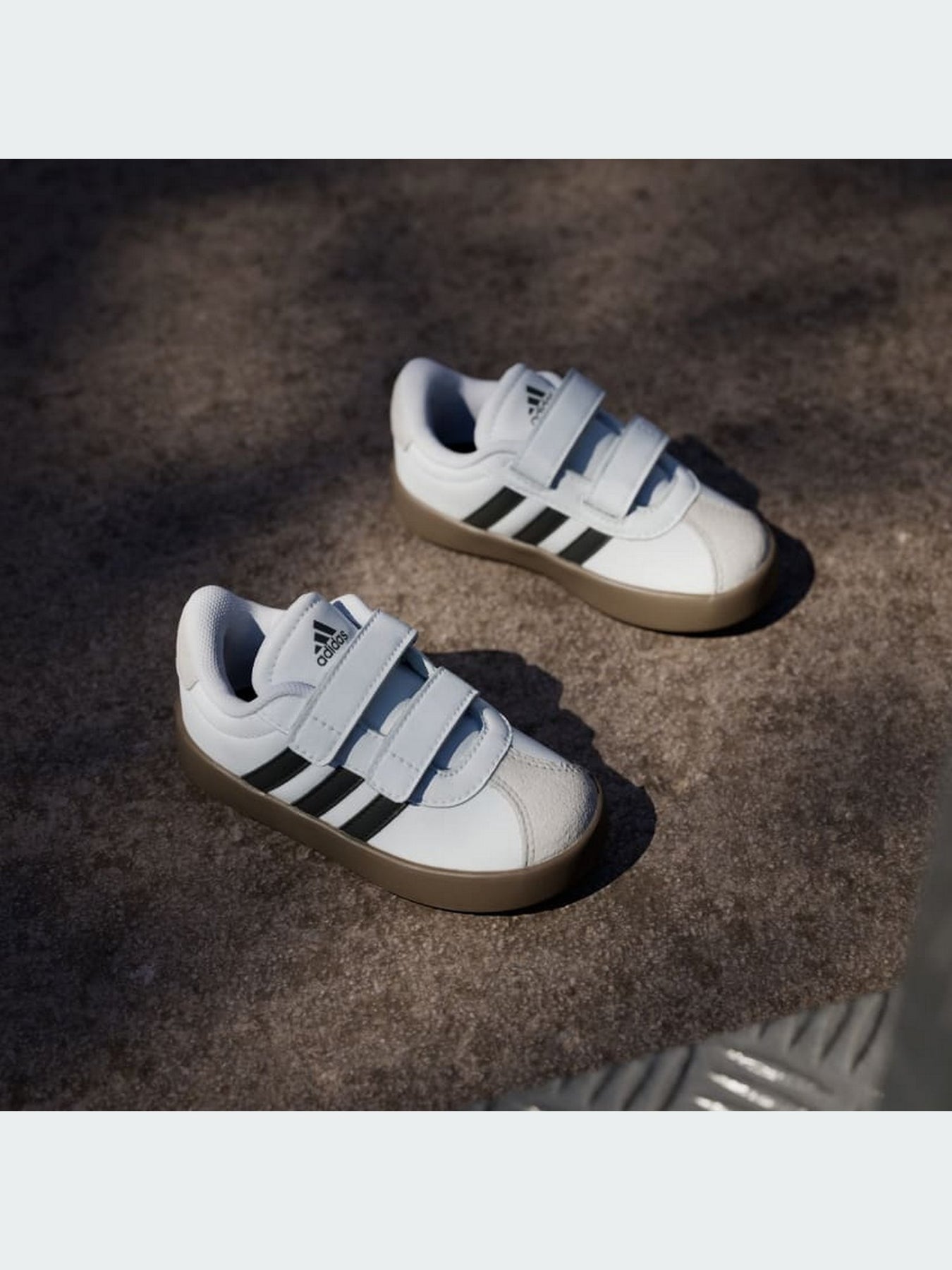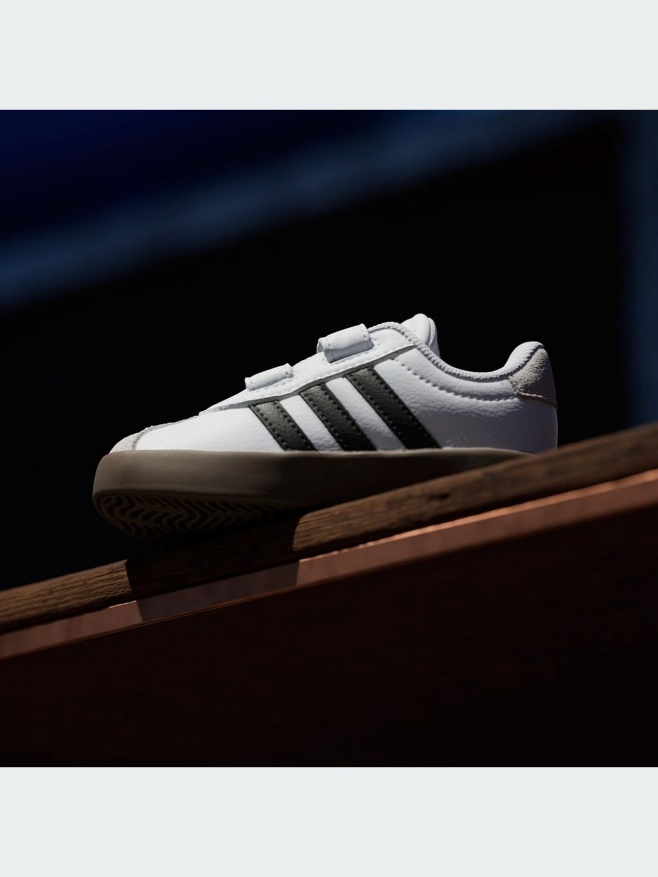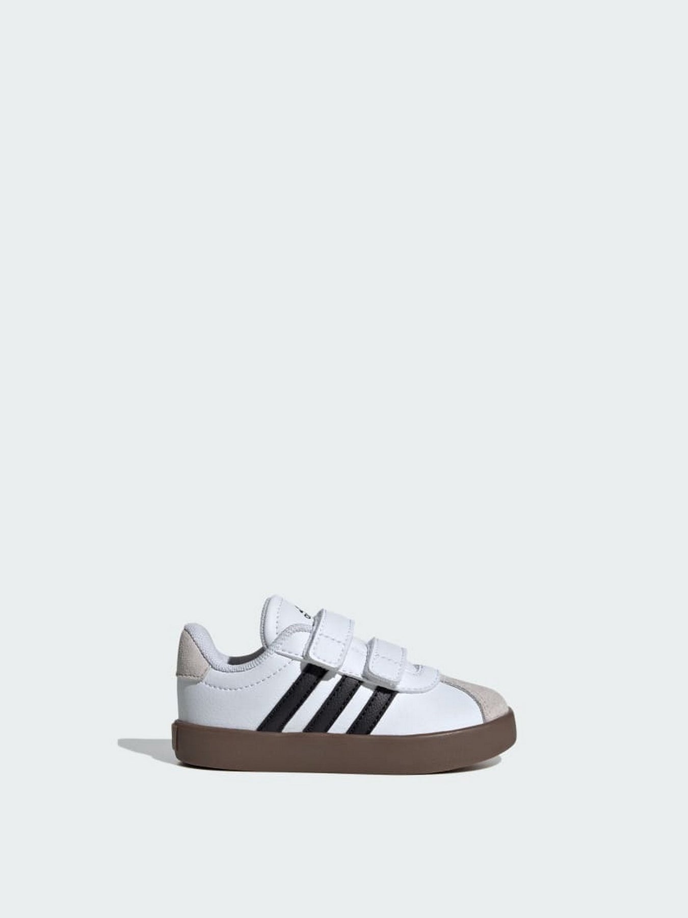 Realizzate in pelle sintetica bianca resistente, sono decorate con le iconiche 3-Strisce nere adidas e un dettaglio in suede beige sul tallone per un look casual e moderno. La chiusura con doppio strap a velcro assicura una calzata semplice, stabile e sicura, perfetta per bambini sempre in movimento.