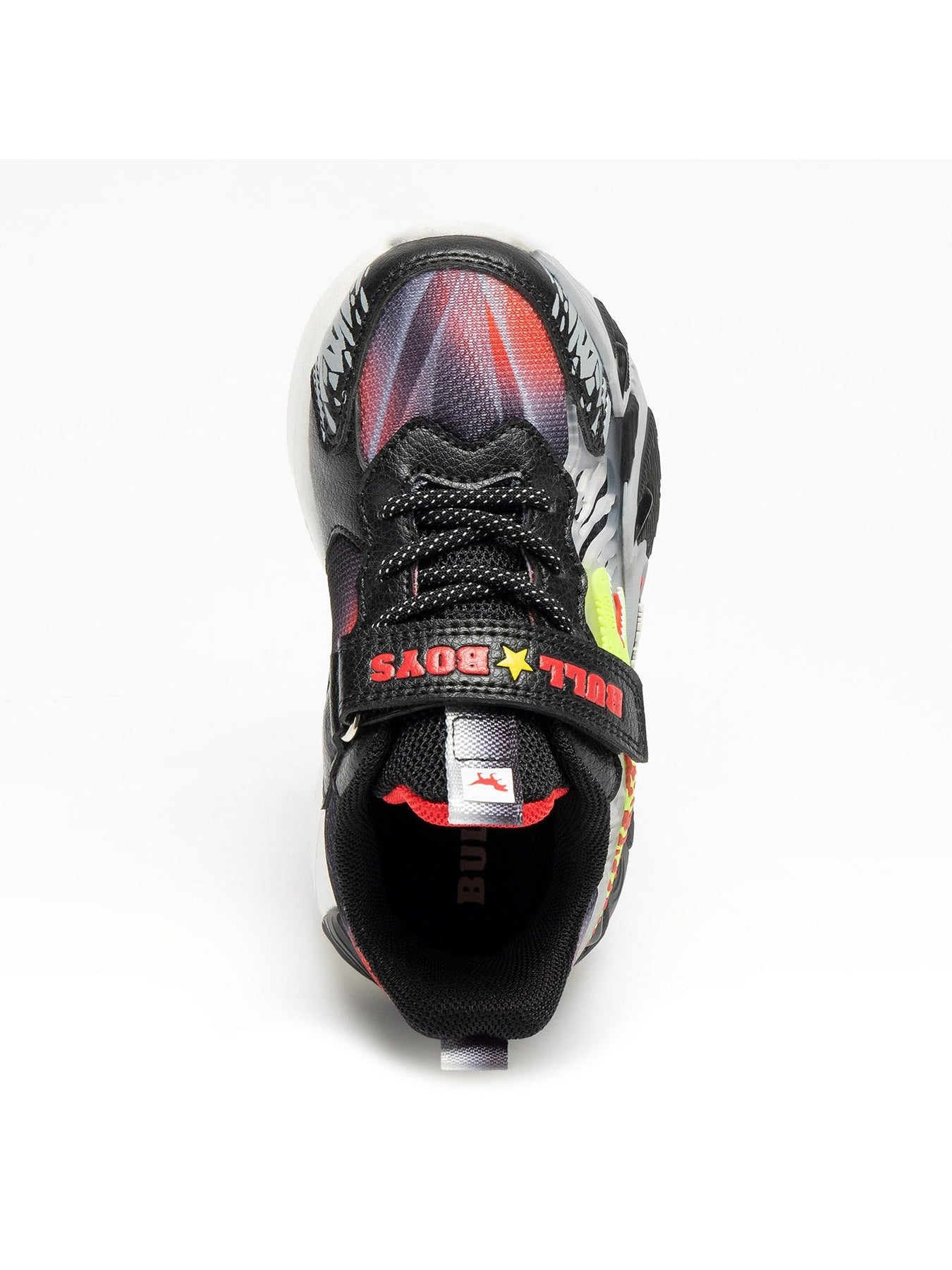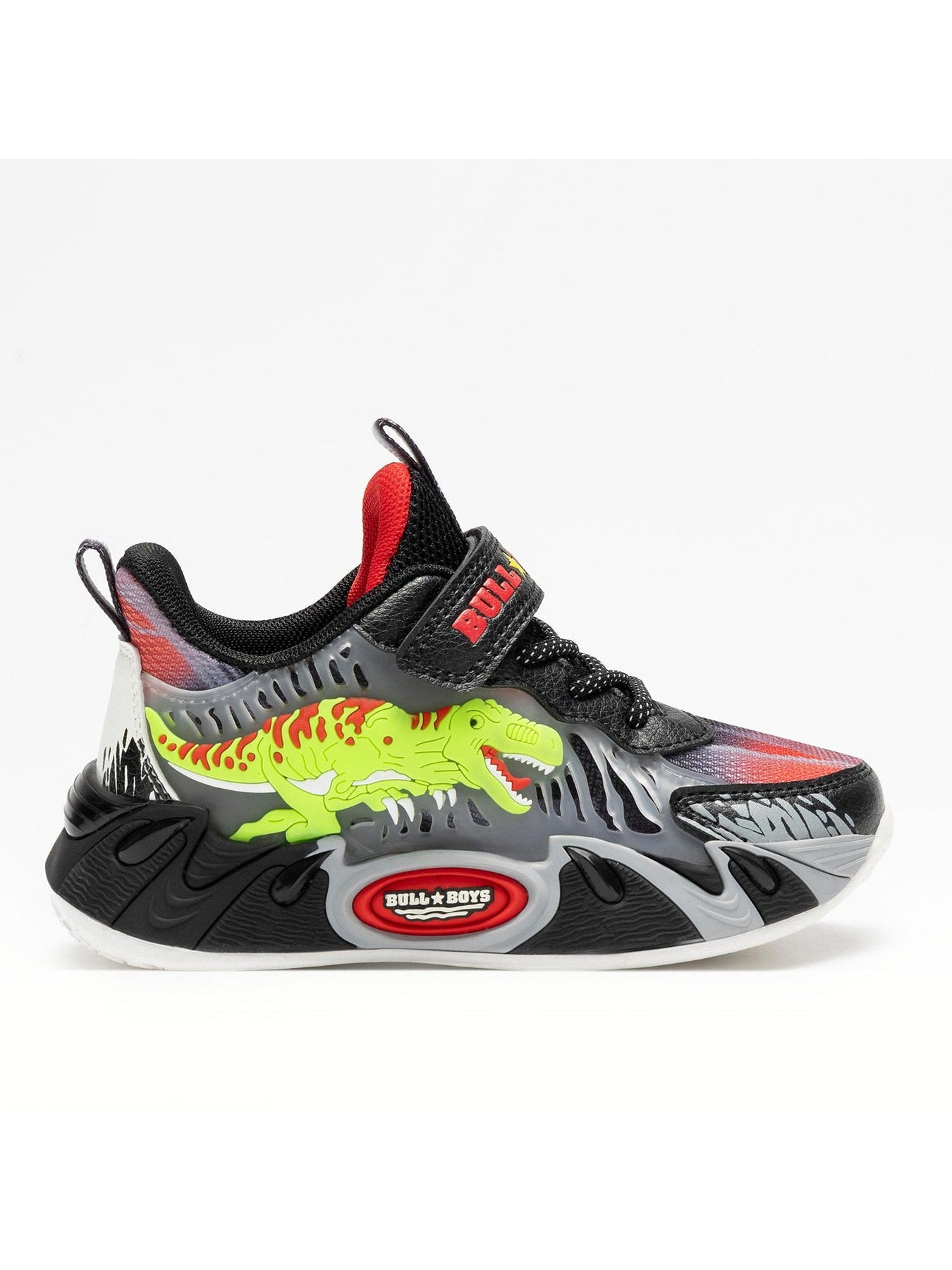 La sneaker BULL BOYS T-Rex DNAL5150B00 Nero è perfetta per i piccoli amanti dei dinosauri. La tomaia nera con sfumature rosse è arricchita da un dinosauro verde fluo in rilievo, che dona un look aggressivo e spettacolare.