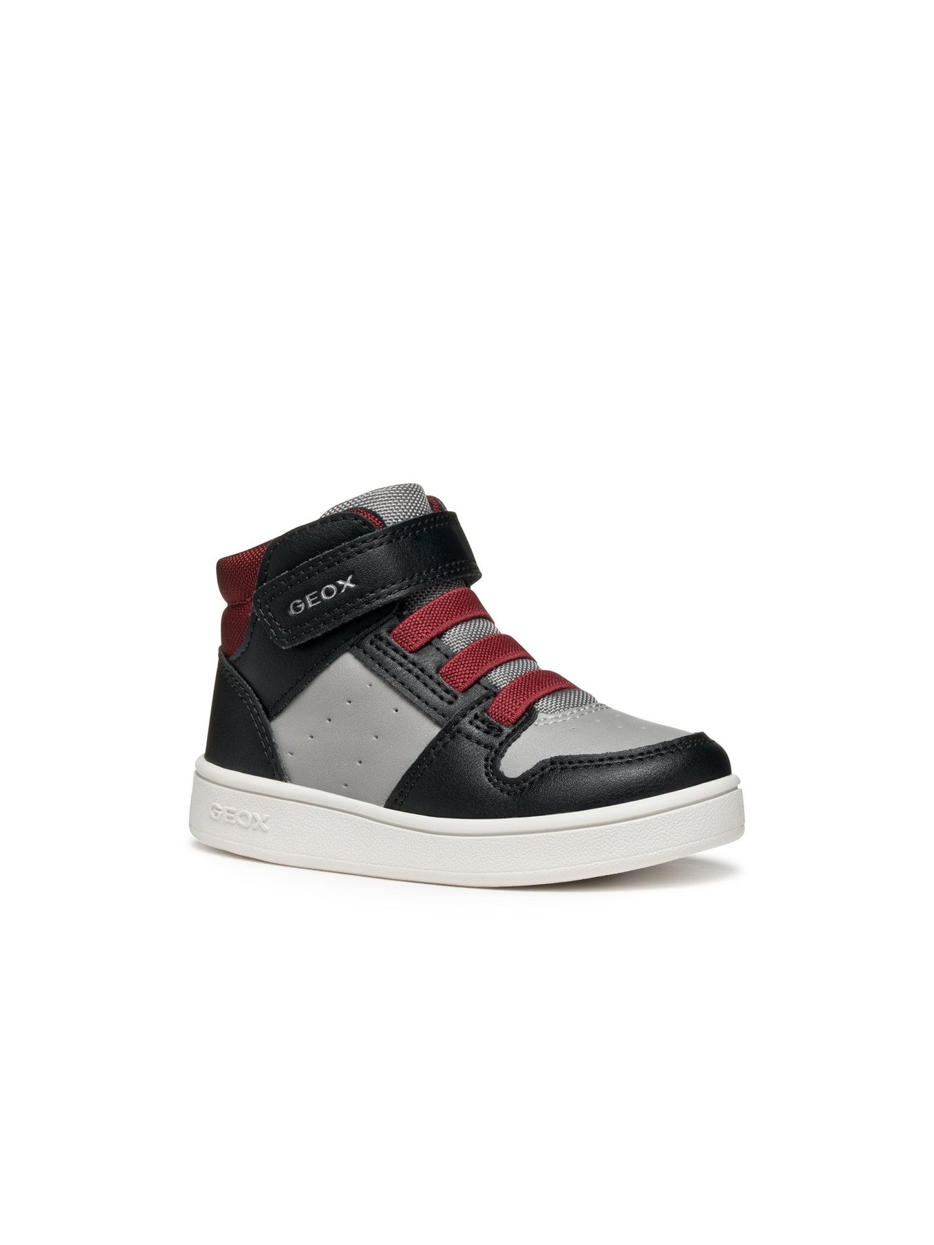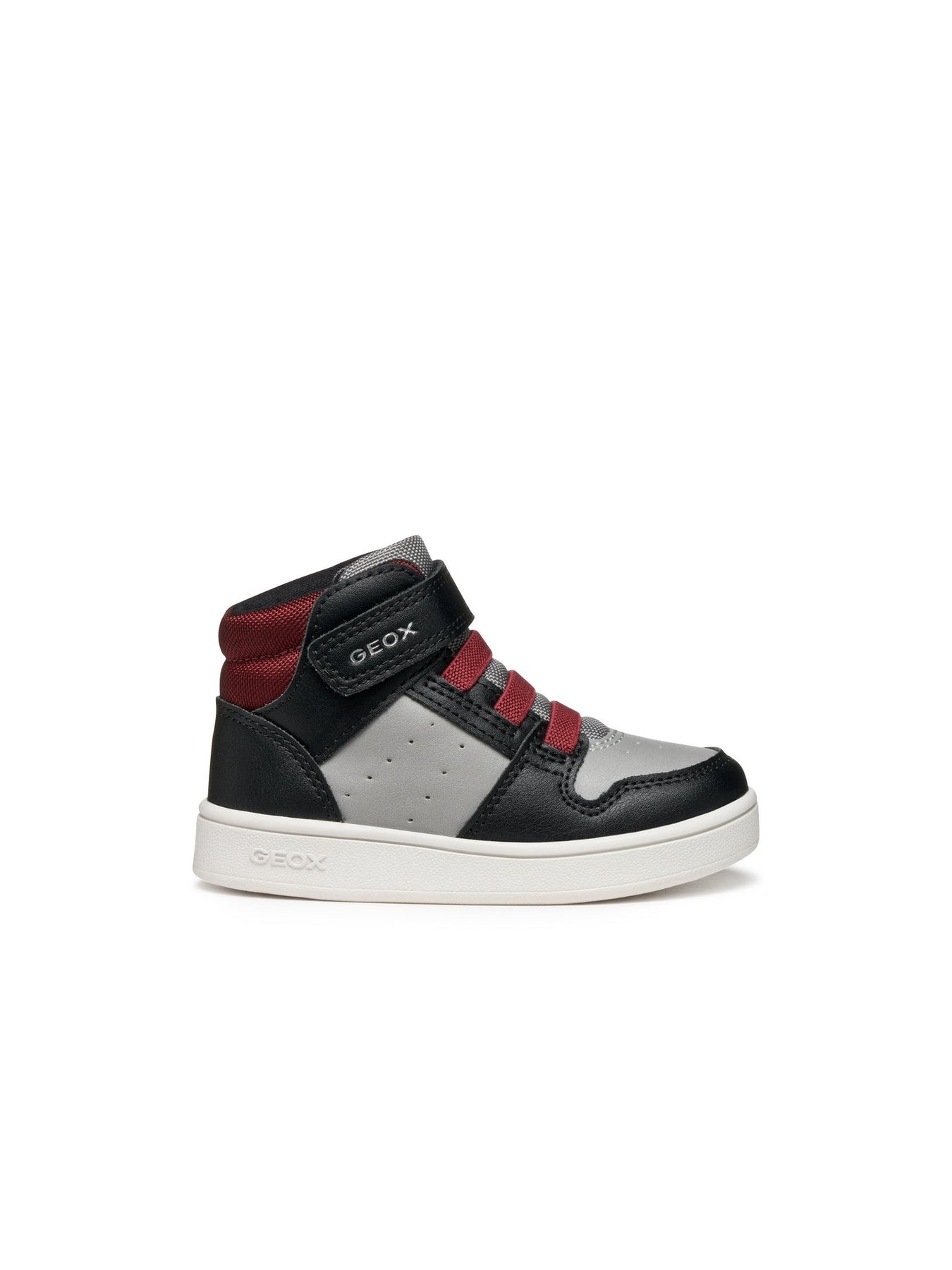 Il modello GEOX B Eclyper Boy B465LA000BC Black/Bordeaux è una sneaker mid-cut da bambino, dal design moderno e versatile. Realizzata in materiale effetto pelle nei toni nero, grigio e bordeaux, unisce stile urbano e praticità.