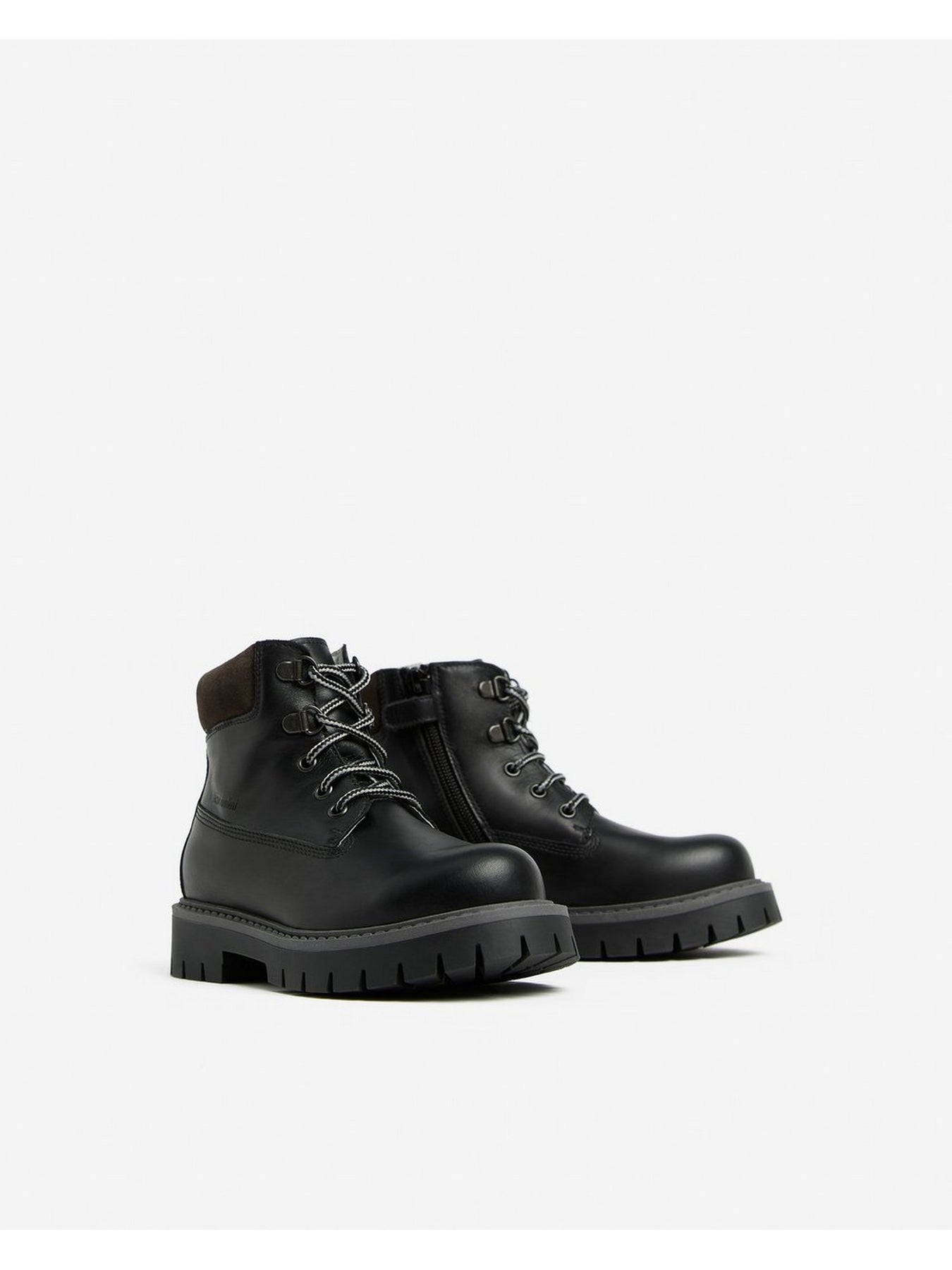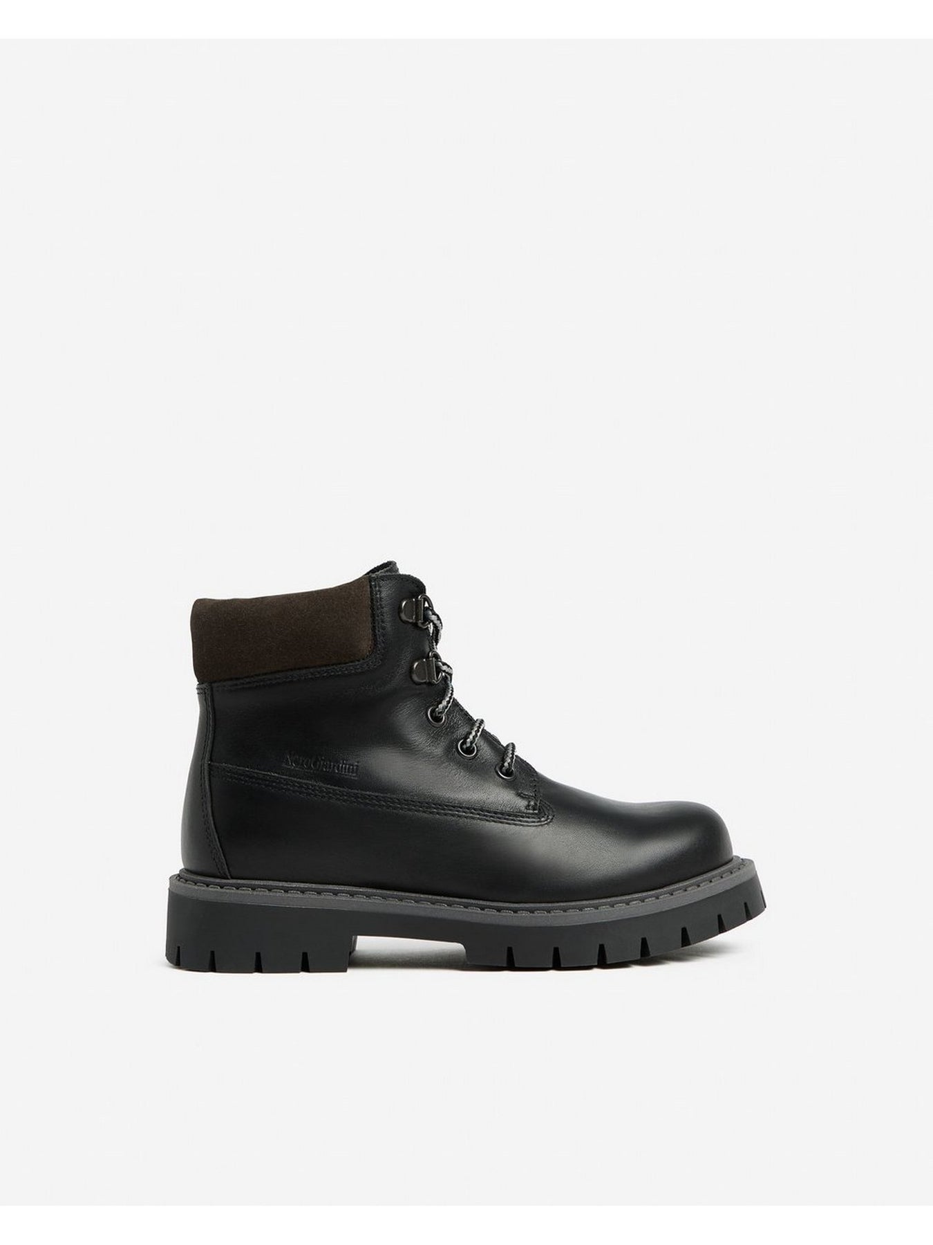Realizzato in pelle nera di alta qualità, presenta un collarino imbottito che garantisce morbidezza e sostegno alla caviglia. L'allacciatura con ganci metallici assicura una chiusura stabile e resistente, mentre la suola carrarmato offre grip, stabilità e lunga durata.