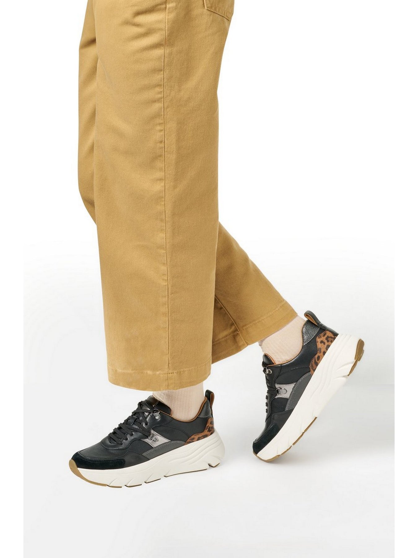 Realizzata in pelle nera con inserti in suede e dettagli animalier cognac sul tallone, offre un design grintoso e di grande personalità. La suola chunky in gomma leggera integra una zeppa interna da 5 cm che slancia la figura senza rinunciare alla comodità.