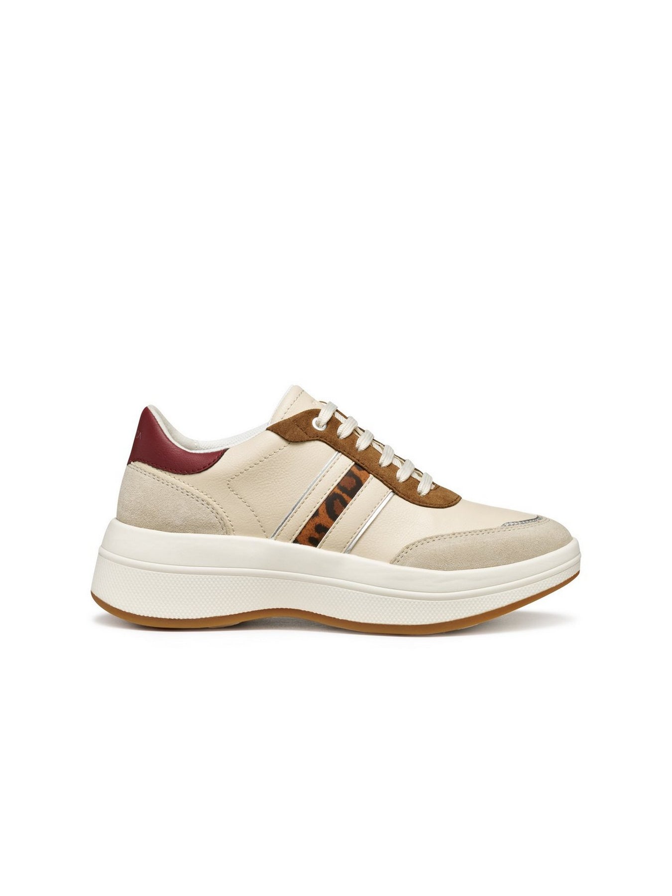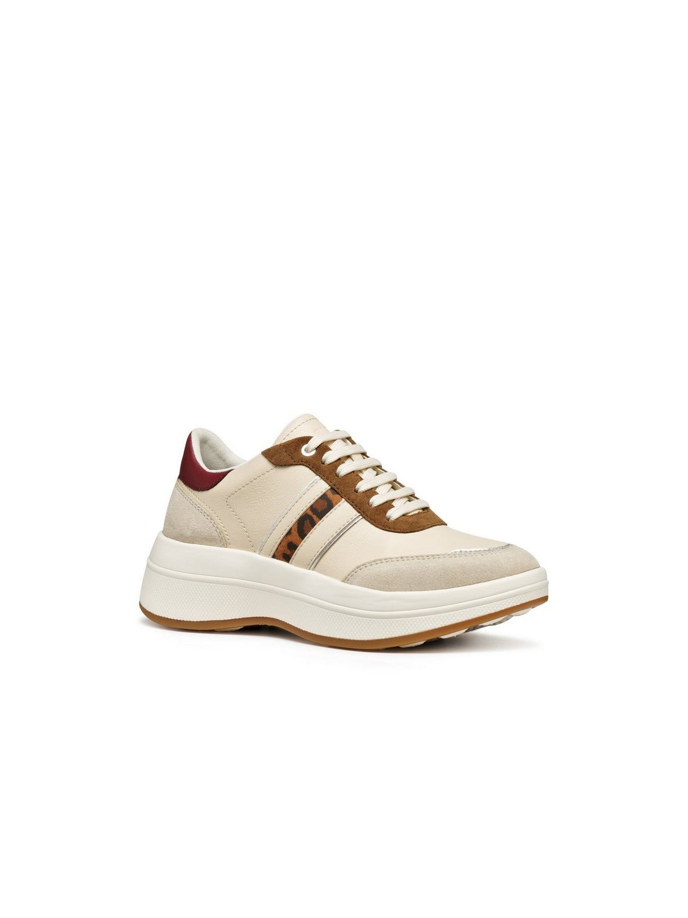 Realizzata in un mix di pelle liscia e suede, offre resistenza, morbidezza e un look ricercato. I dettagli animalier sui lati donano carattere e originalità, mentre la fodera interna con tecnologia GEOX assicura massima traspirabilità e benessere del piede.