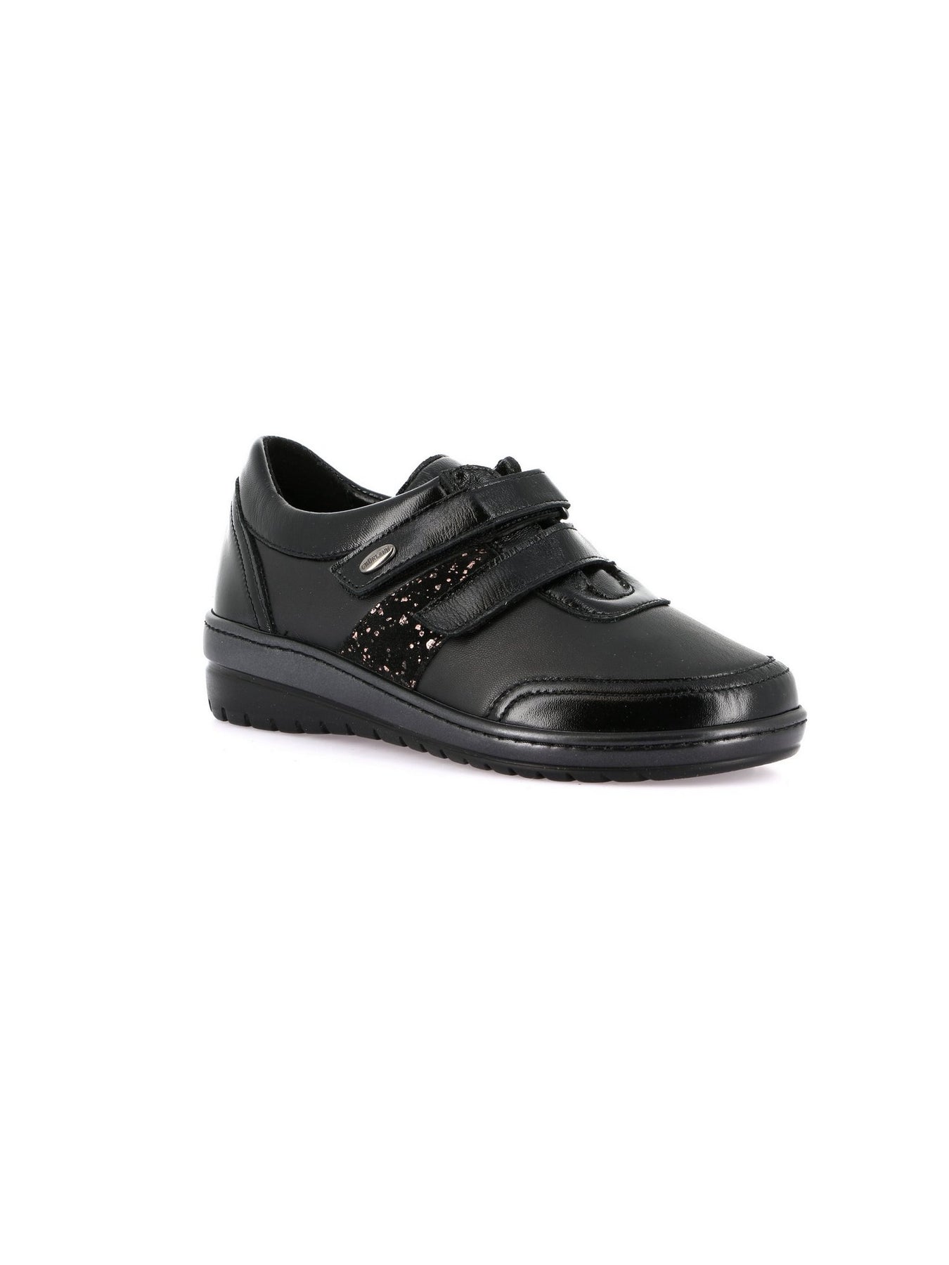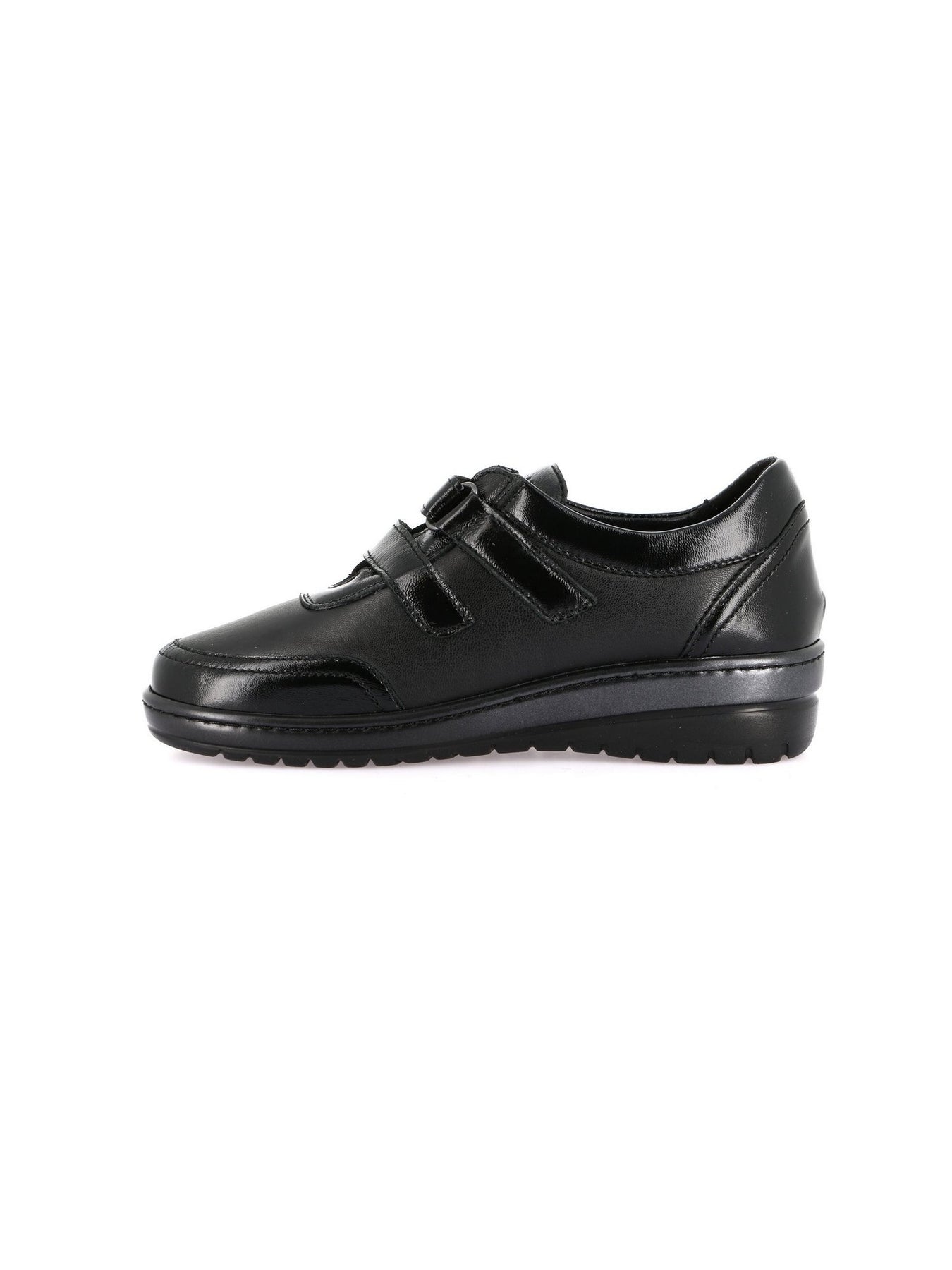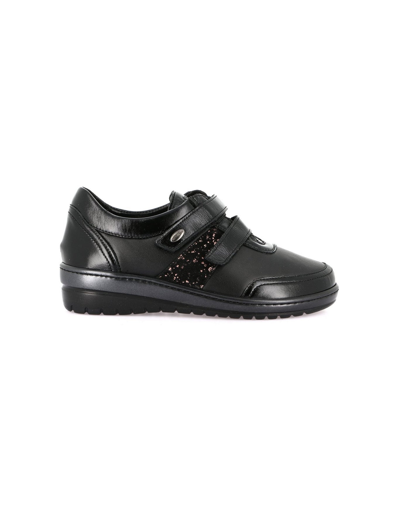 La suola in poliuretano è leggera e resistente, con tacco di 4 cm per un maggiore comfort nella postura. La doppia chiusura a strappo rende la calzata facile e regolabile, ideale per l'uso quotidiano e per chi cerca una scarpa funzionale ma elegante.