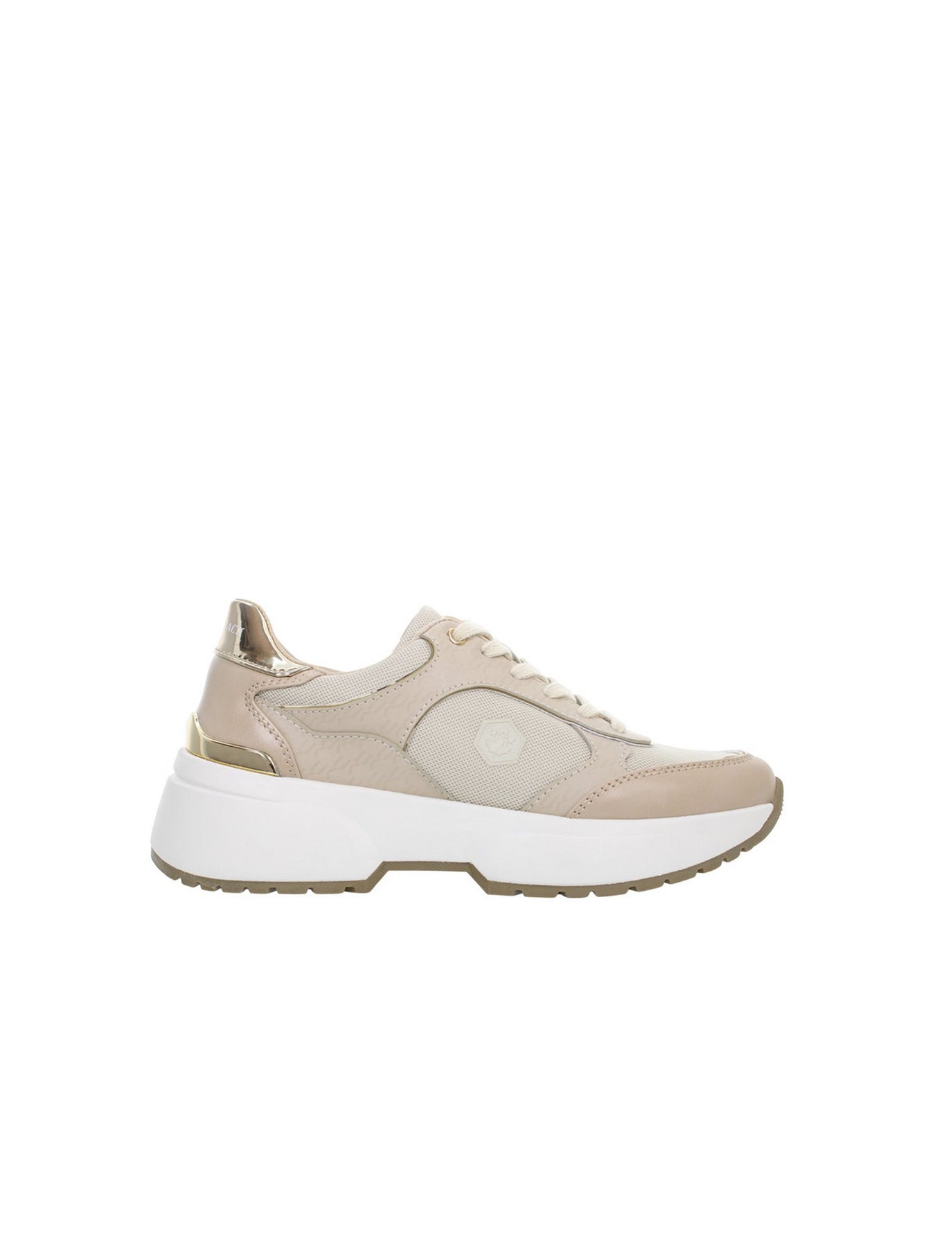 Tomaia Esterna: mix di materiali effetto pelle nelle tonalità sabbia con inserti coordinati e dettagli metallizzati