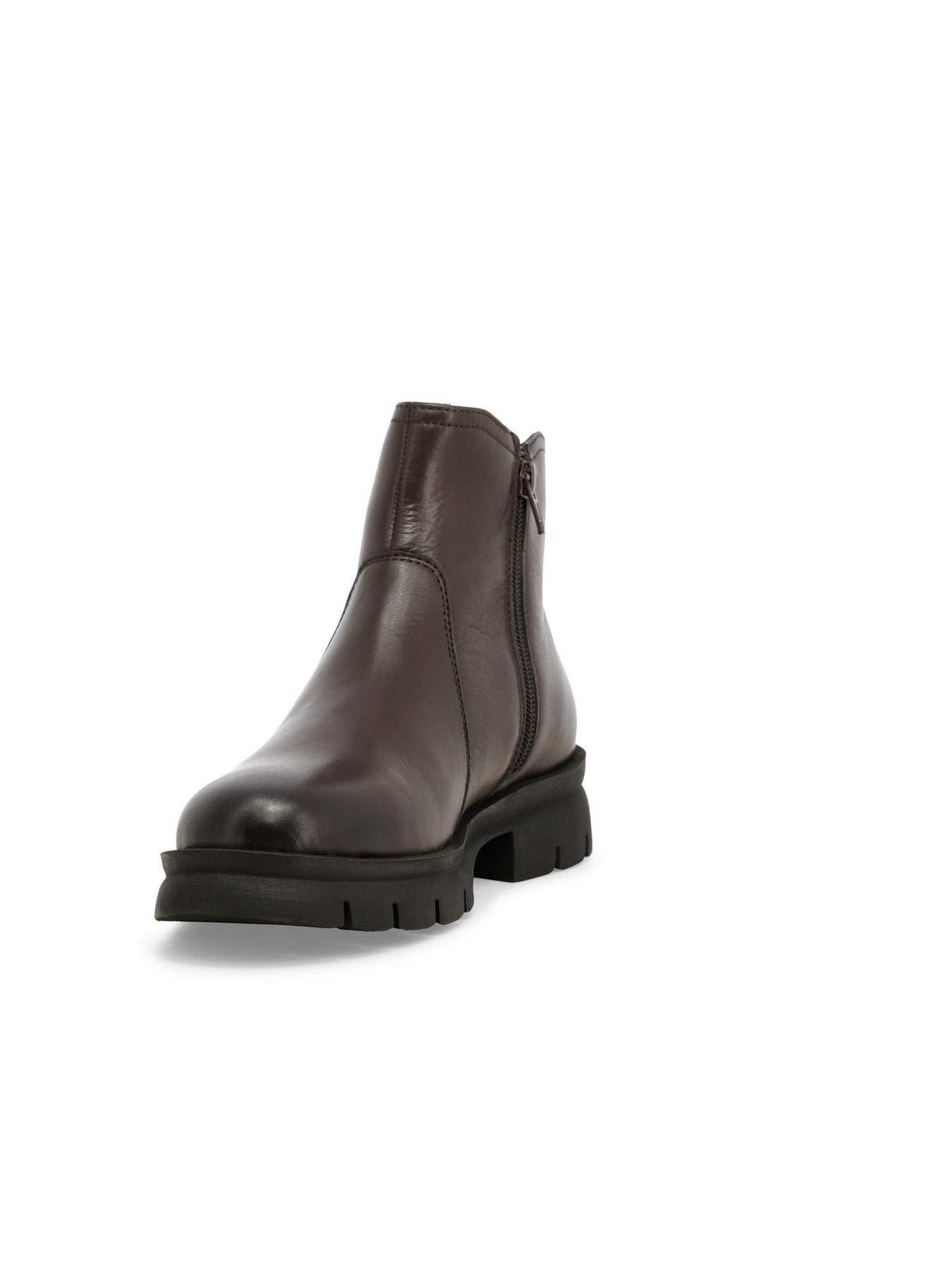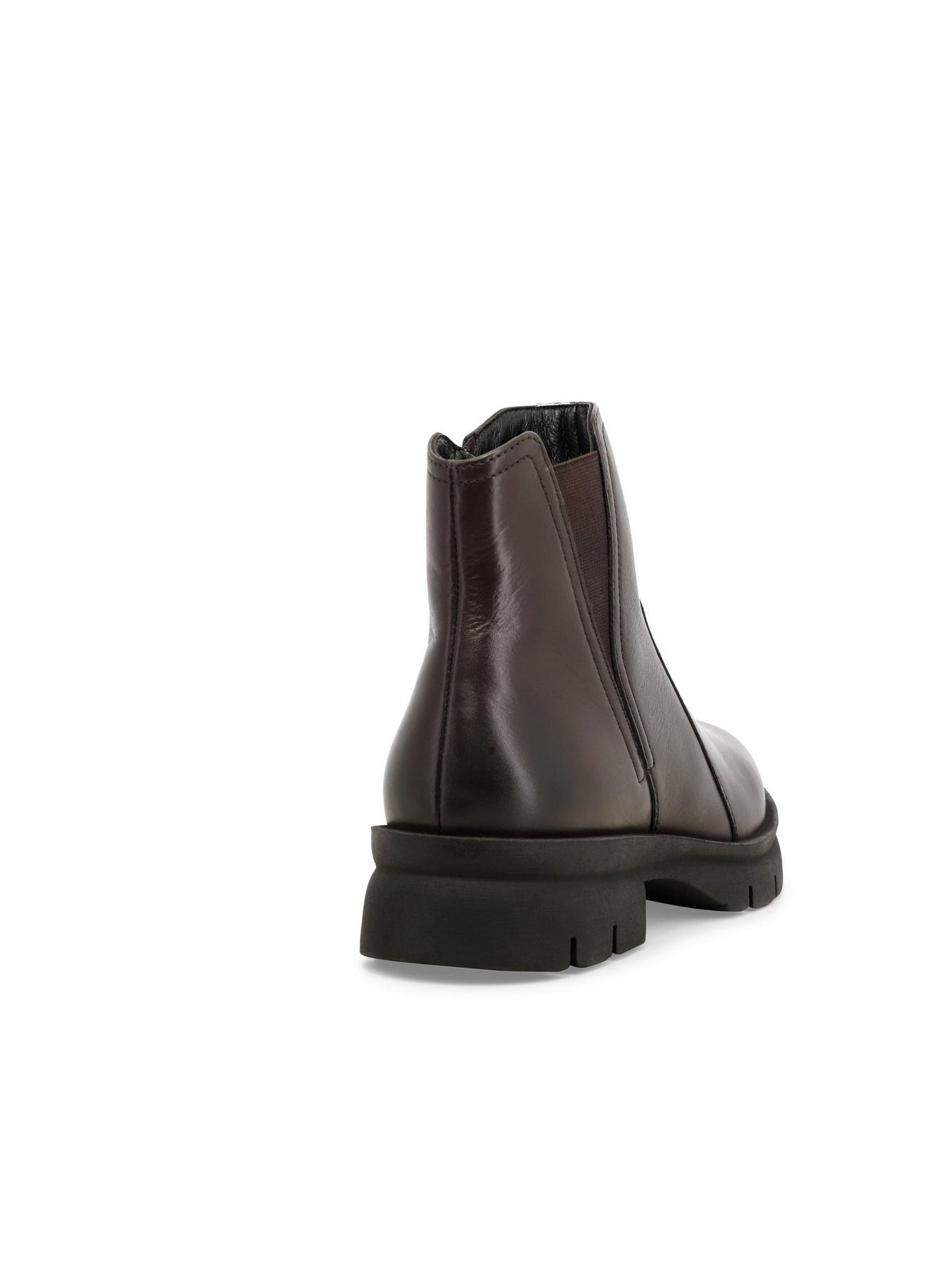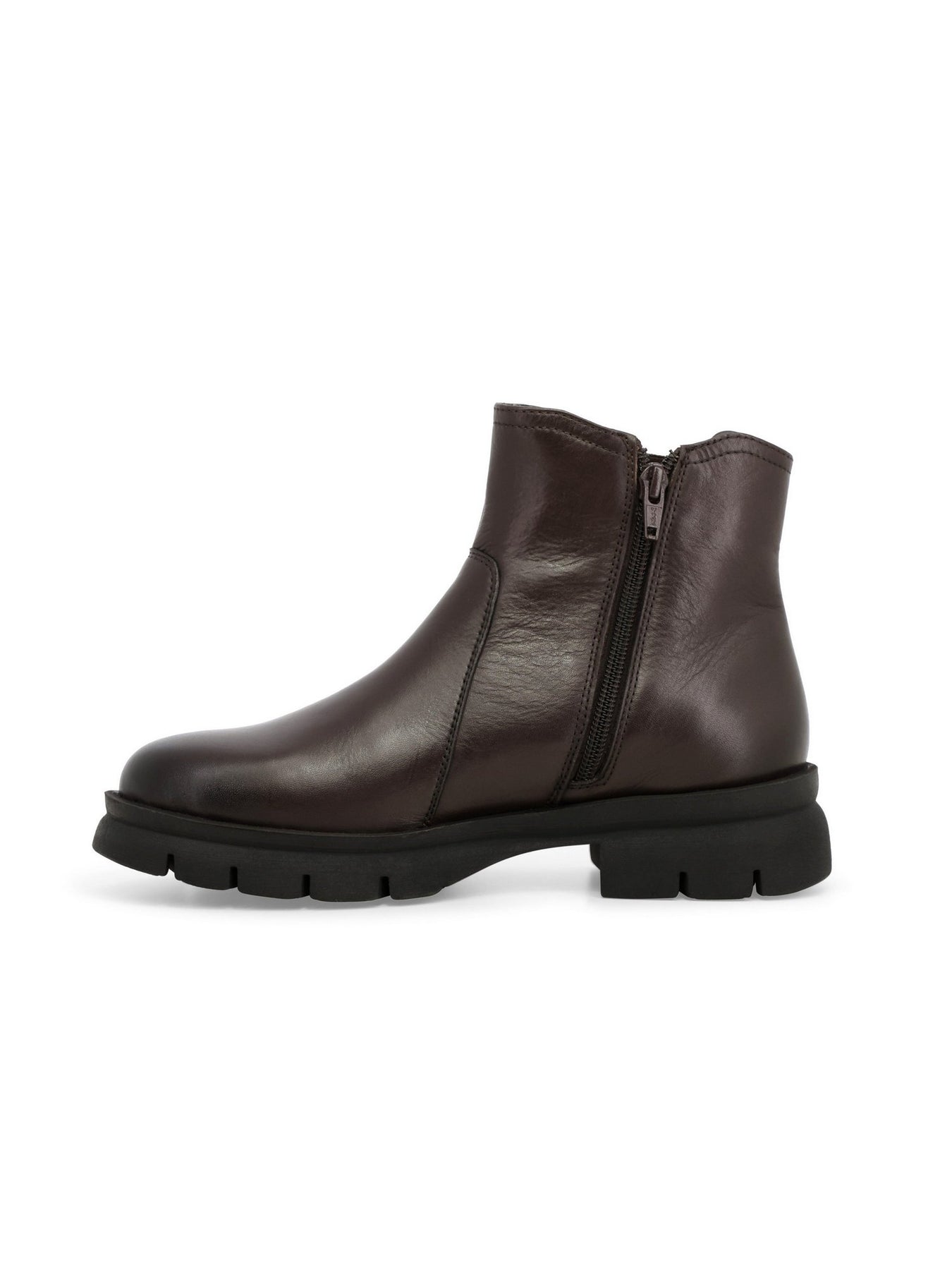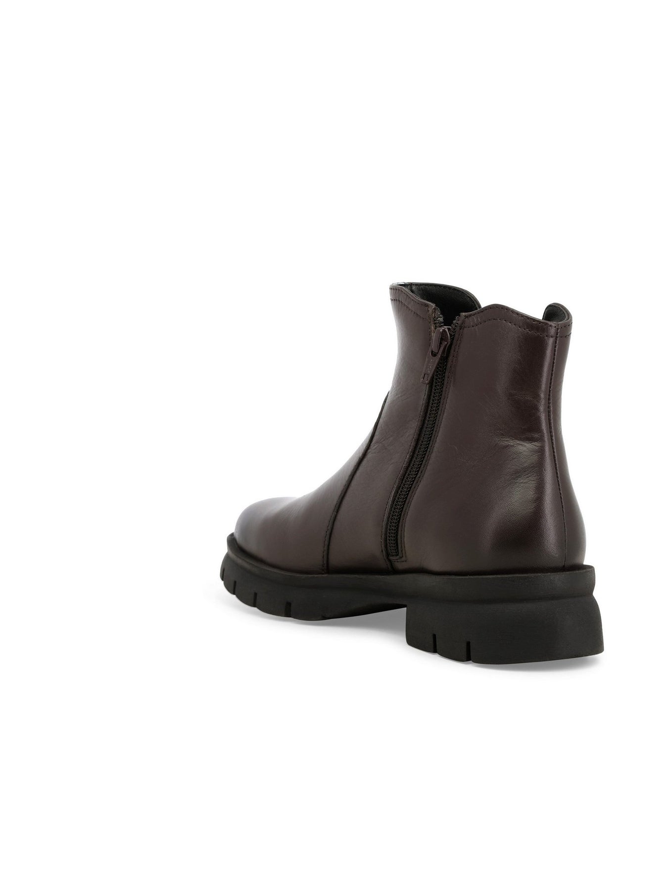 Realizzato in morbida pelle marrone, presenta un design essenziale con inserti elastici laterali e zip interna che garantiscono una calzata facile e veloce. Il tacco basso da 4 cm unito alla suola carrarmato antiscivolo assicura stabilità, comfort e sicurezza in ogni occasione.