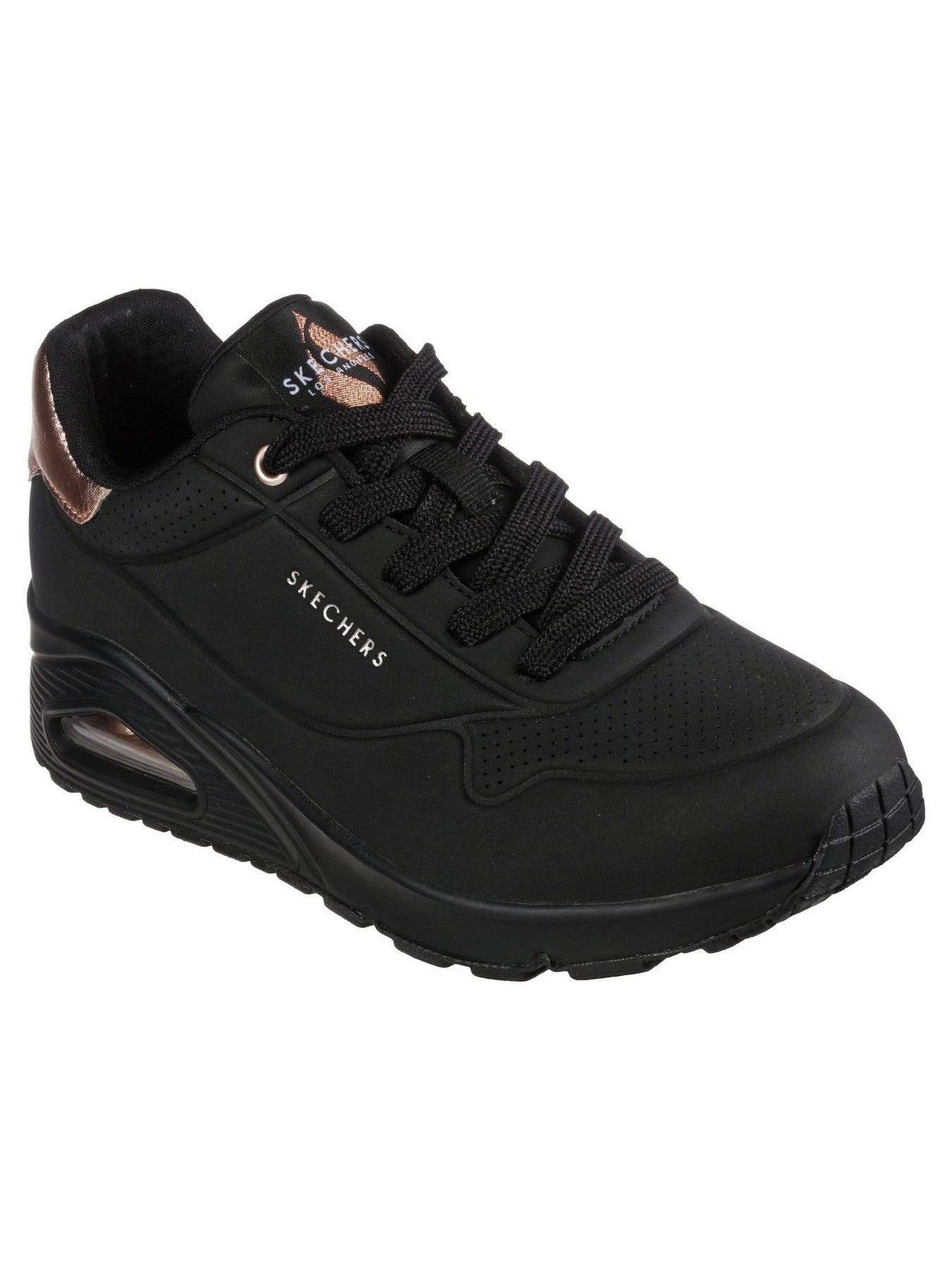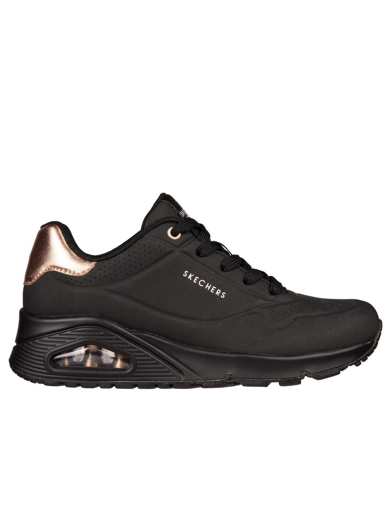 La sneaker SKECHERS Uno 177094 Nero è realizzata in materiale sintetico con finitura opaca e tallone in contrasto color bronzo metallizzato. Il design moderno e grintoso la rende perfetta per look casual e urban.