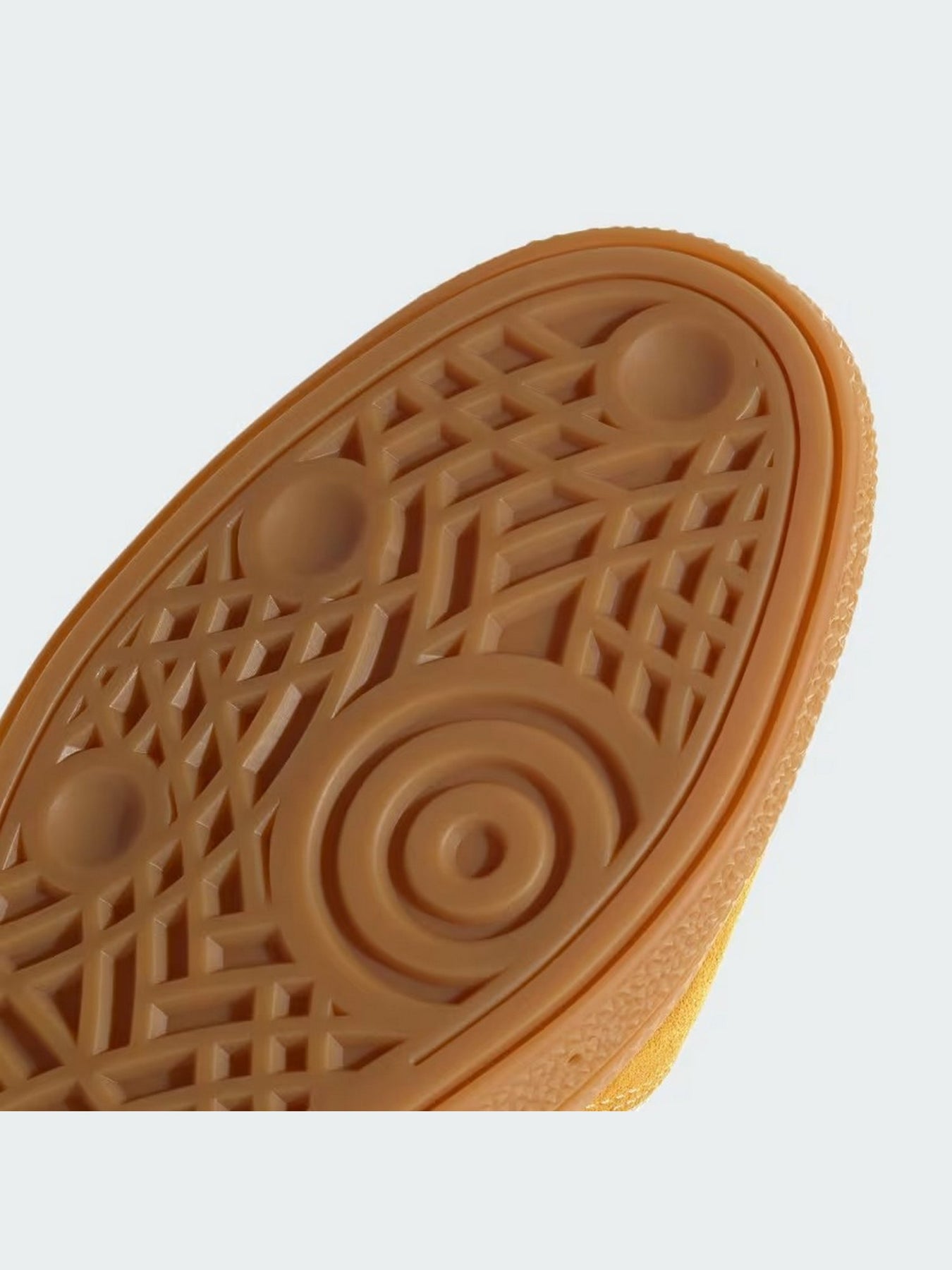 La tomaia in suede giallo senape è morbida e resistente, arricchita dalle iconiche 3 strisce color crema e dal tallone rinforzato in tono a contrasto. La calzata è comoda grazie alla vestibilità regolare e alla chiusura con lacci, mentre la fodera sintetica assicura comfort prolungato. La suola in gomma garantisce stabilità, grip e uno stile old-school inconfondibile.