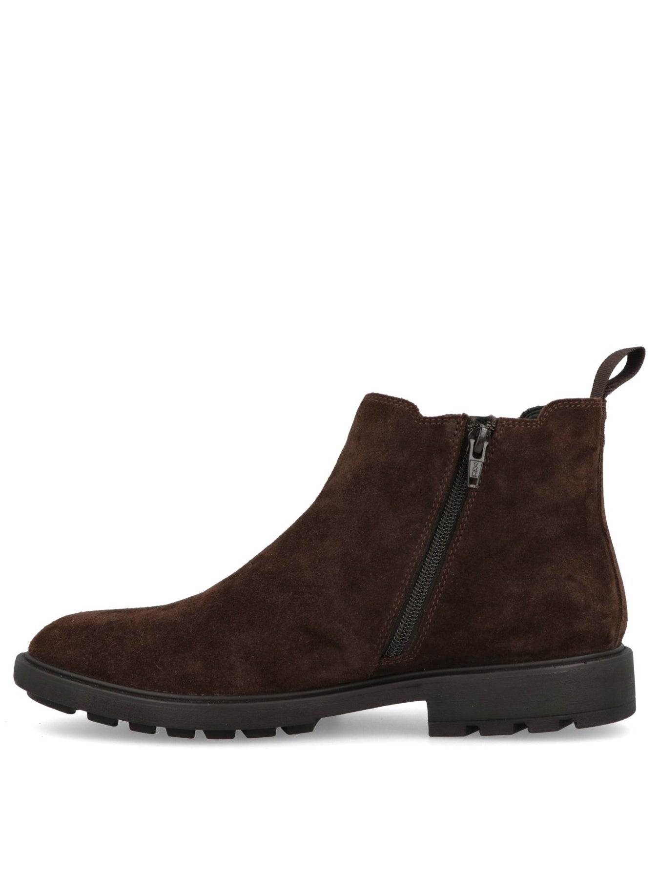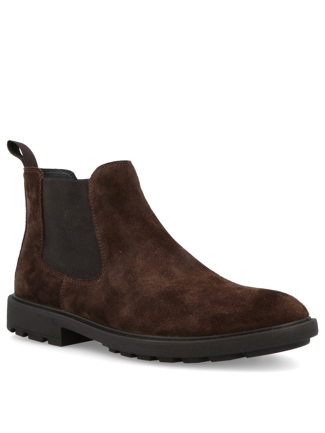 Realizzato in pelle scamosciata color marrone, presenta una texture morbida e raffinata che dona calore e versatilità al look. Gli inserti elastici laterali facilitano la calzata e assicurano una tenuta confortevole, mentre la linguetta posteriore permette di indossarlo con praticità.