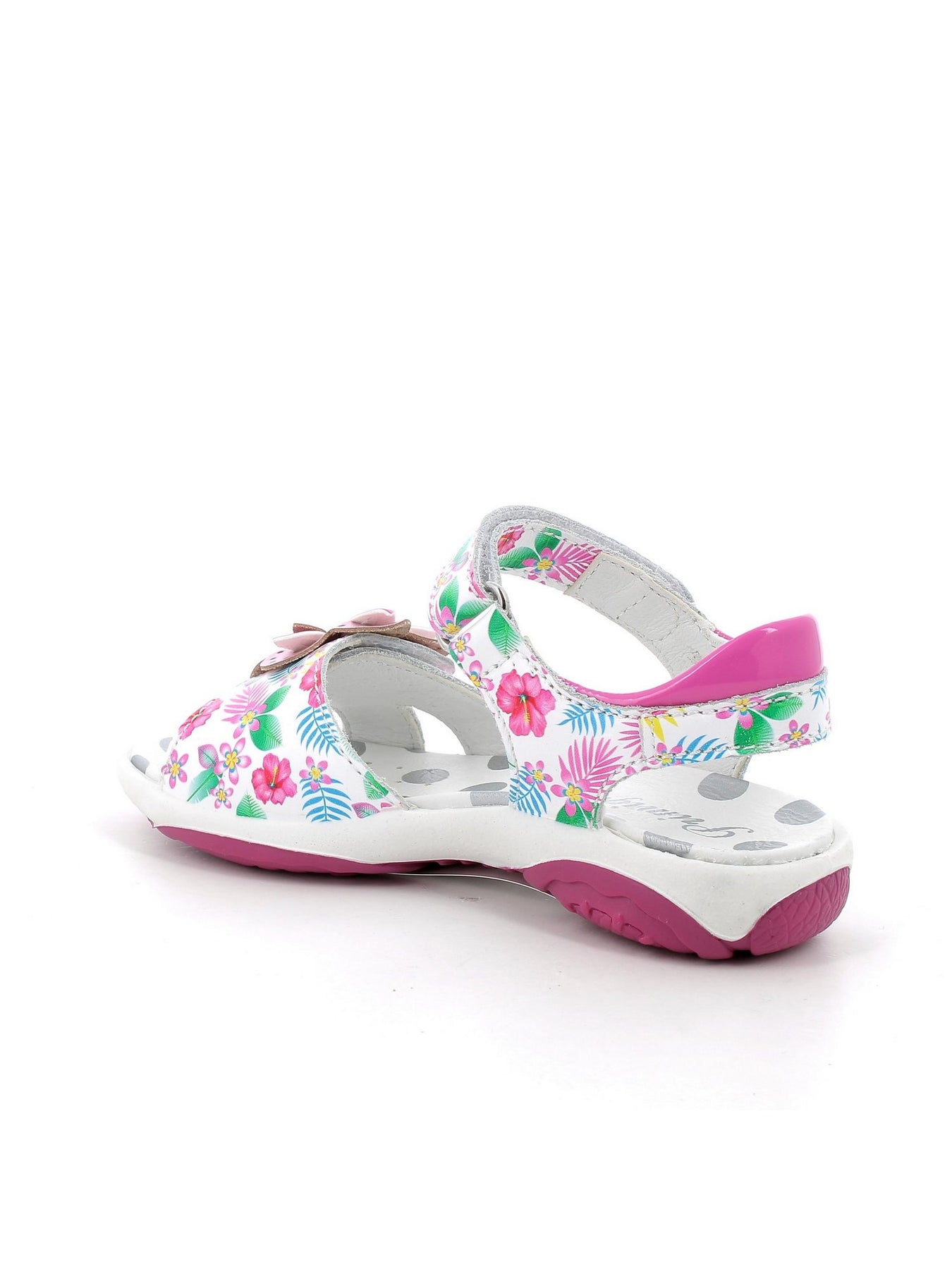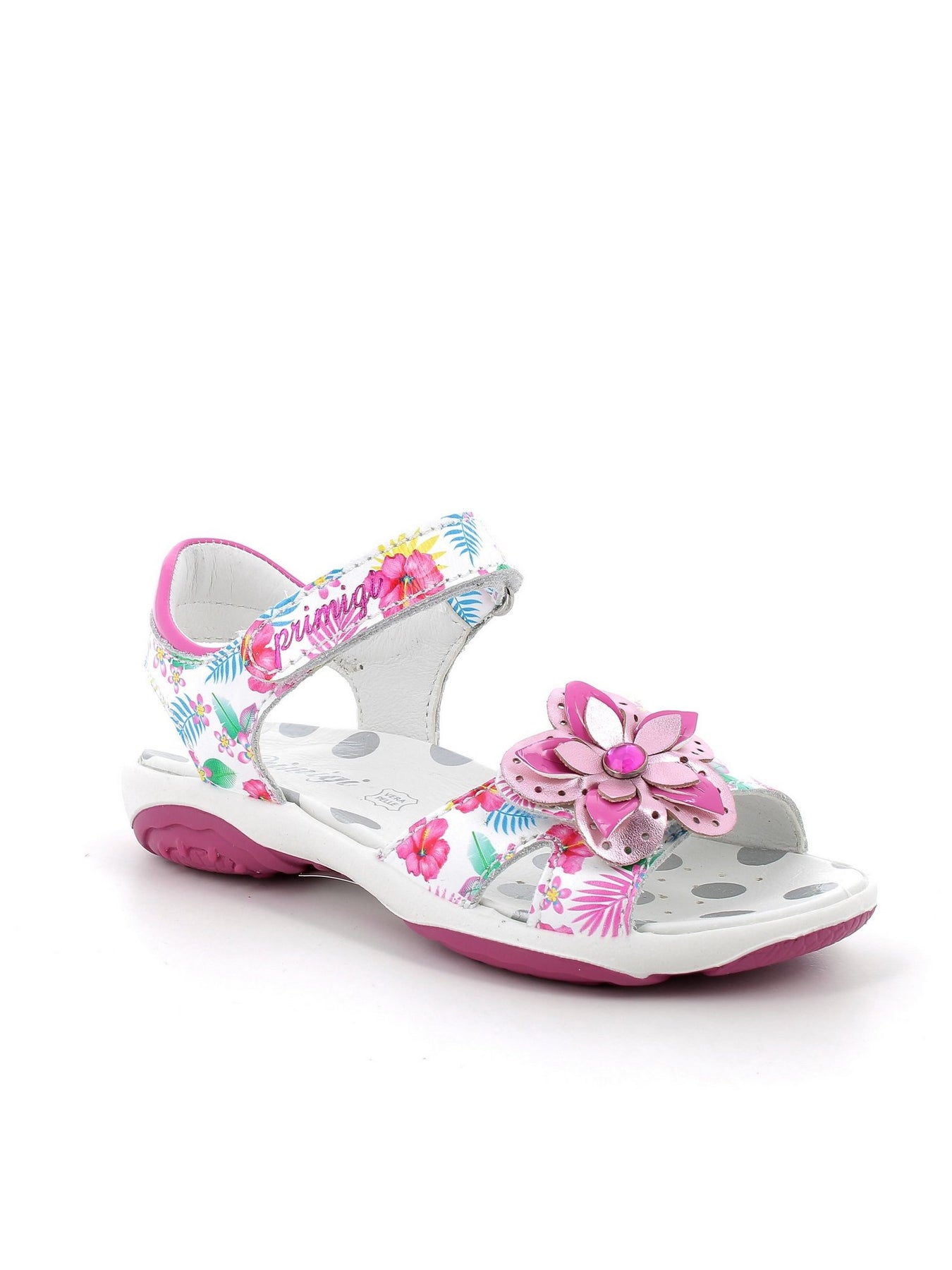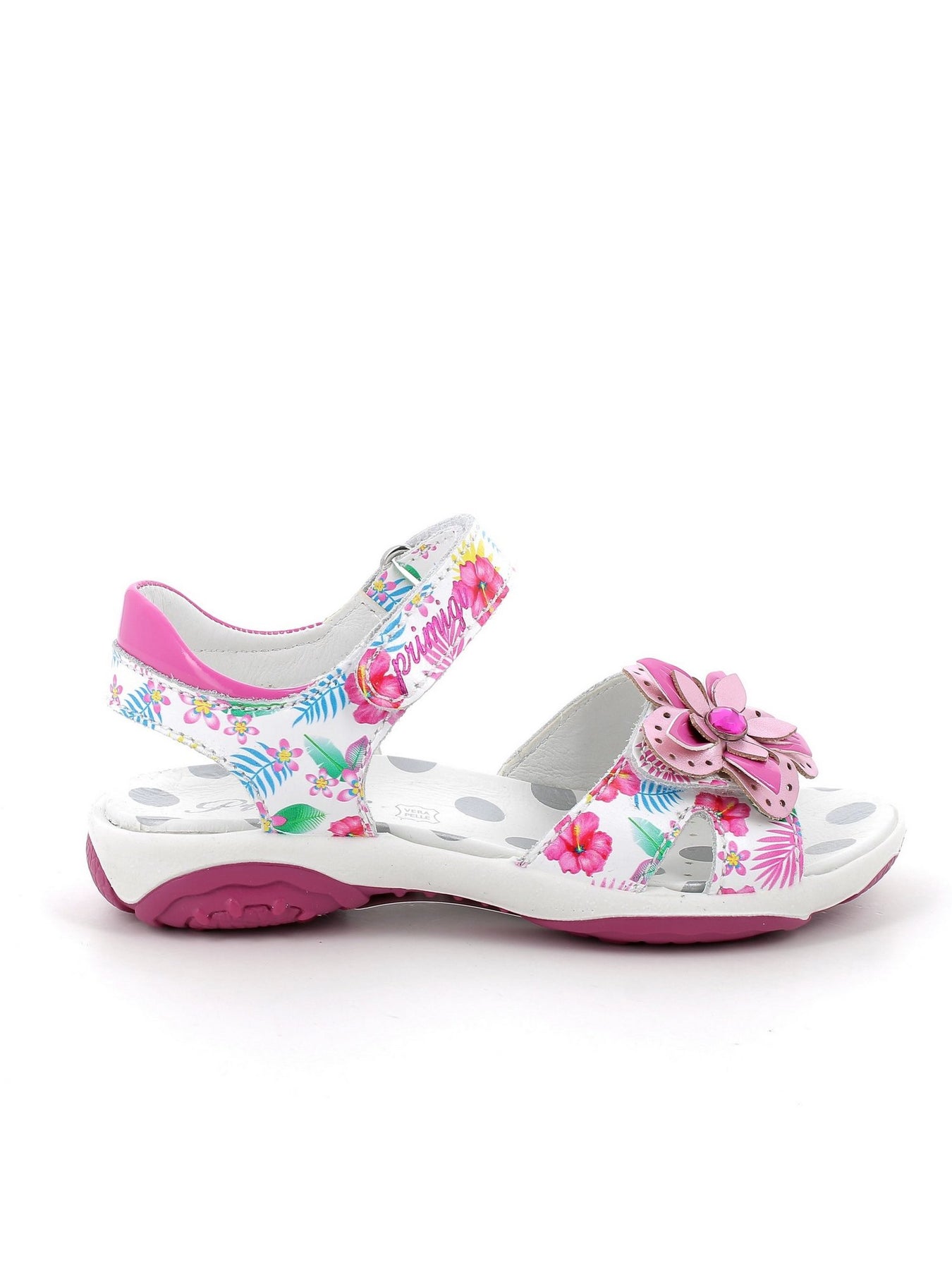 Il sandalo PRIMIGI 78850 in colorazione multicolor è la scelta ideale per le bambine che desiderano un paio di scarpe allegre e comode per l'estate. La tomaia in materiale sintetico è decorata con un vivace motivo floreale dai toni di rosa, viola e verde, abbellita da un fiore tridimensionale con un brillante al centro. Il design moderno e giocoso lo rende perfetto per ogni occasione estiva.
