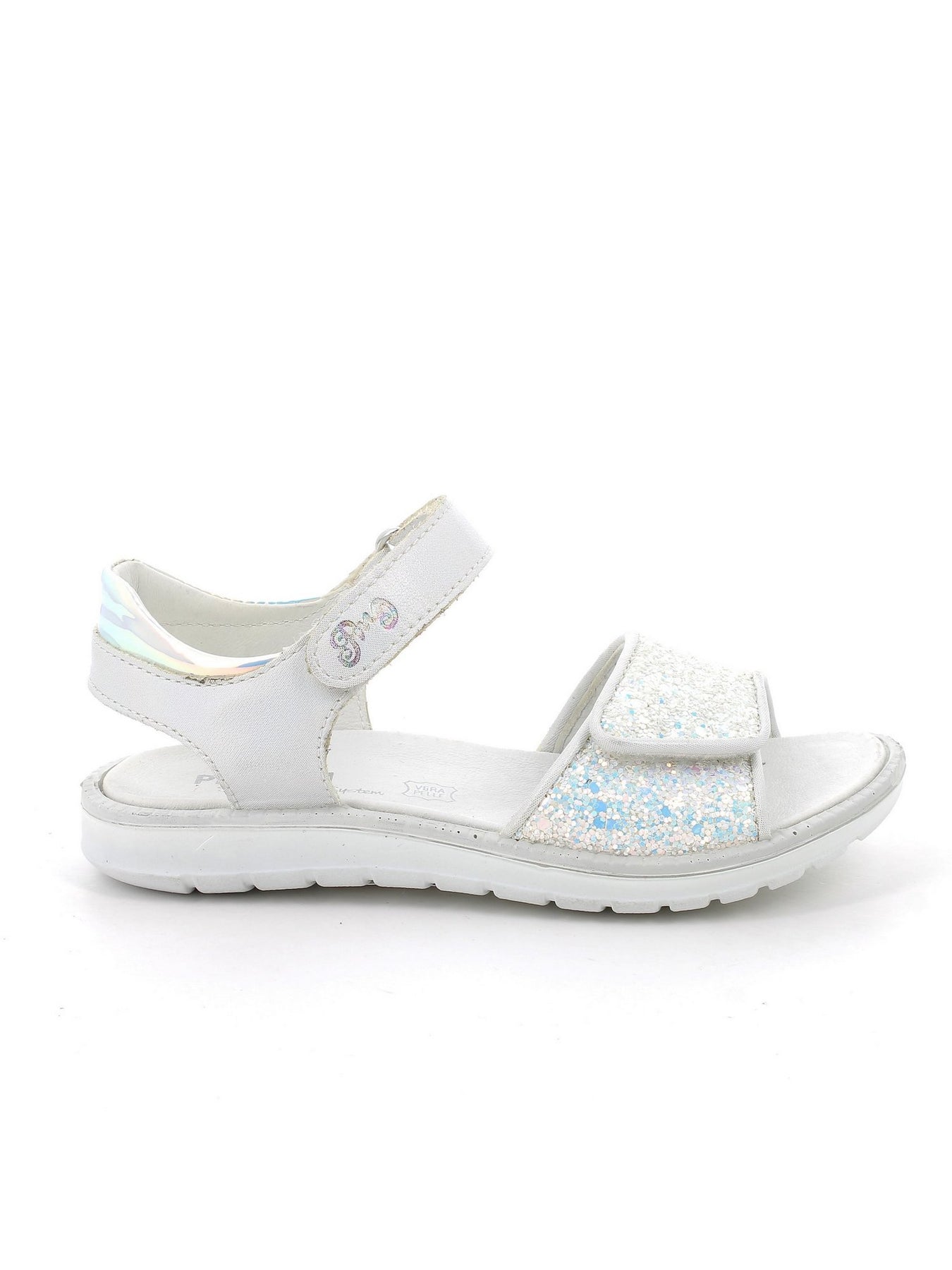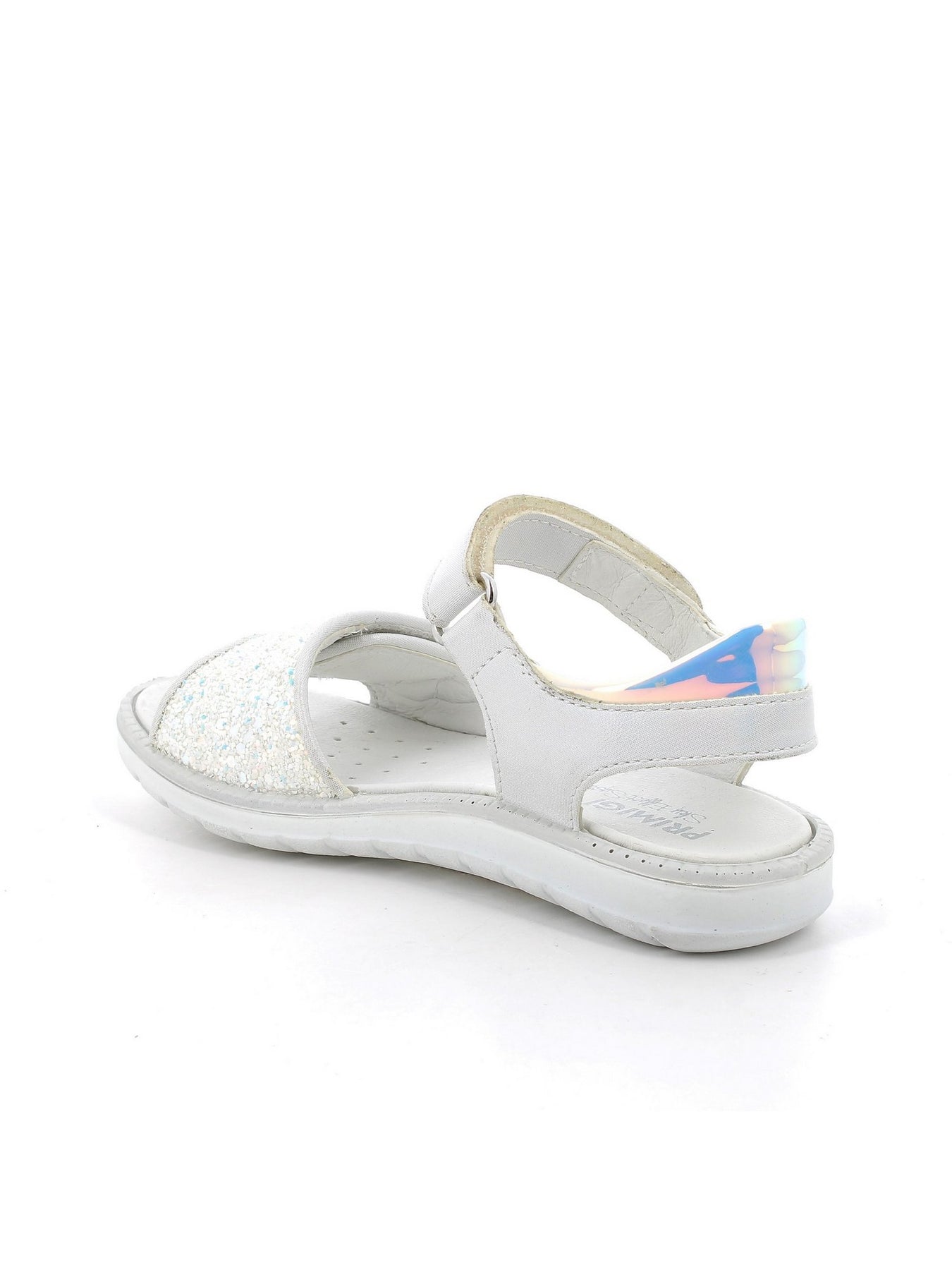 Dotato di una chiusura a strappo, il sandalo offre una calzata facile e regolabile, mentre la suola in gomma assicura aderenza e stabilità durante i movimenti. La combinazione di colori bianco e dettagli glitterati conferisce un aspetto fresco e giocoso, perfetto per le calde giornate estive.