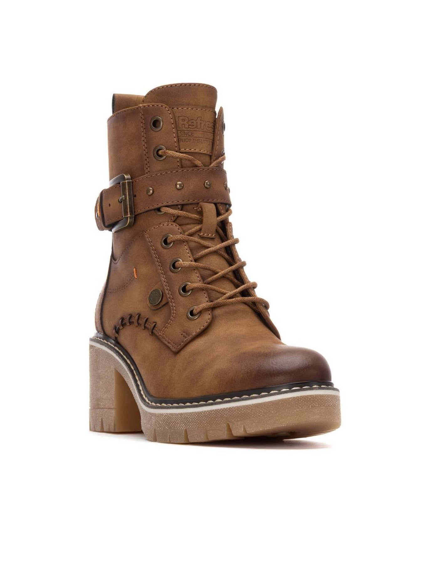 REFRESH Anfibi Tacco Medio Donna - 172909 Camel Anfibi donna in ecopelle camel con fibbia laterale e tacco medio 6 cm, moderni e grintosi.