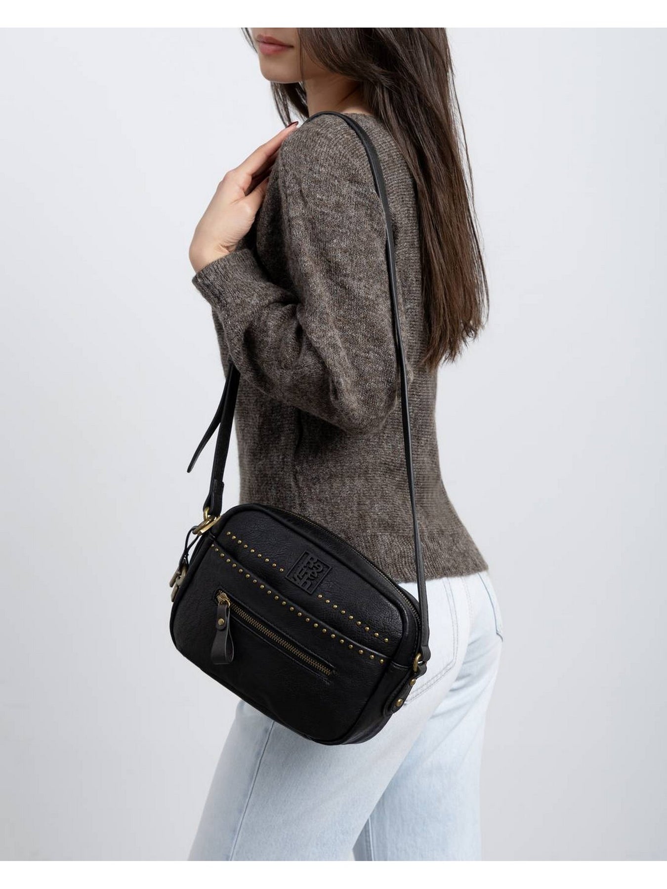 Compatta e funzionale, è dotata di tracolla regolabile, tasca frontale con zip e borchiette decorative che aggiungono carattere e modernità. Perfetta per contenere smartphone, portafoglio e piccoli oggetti personali.