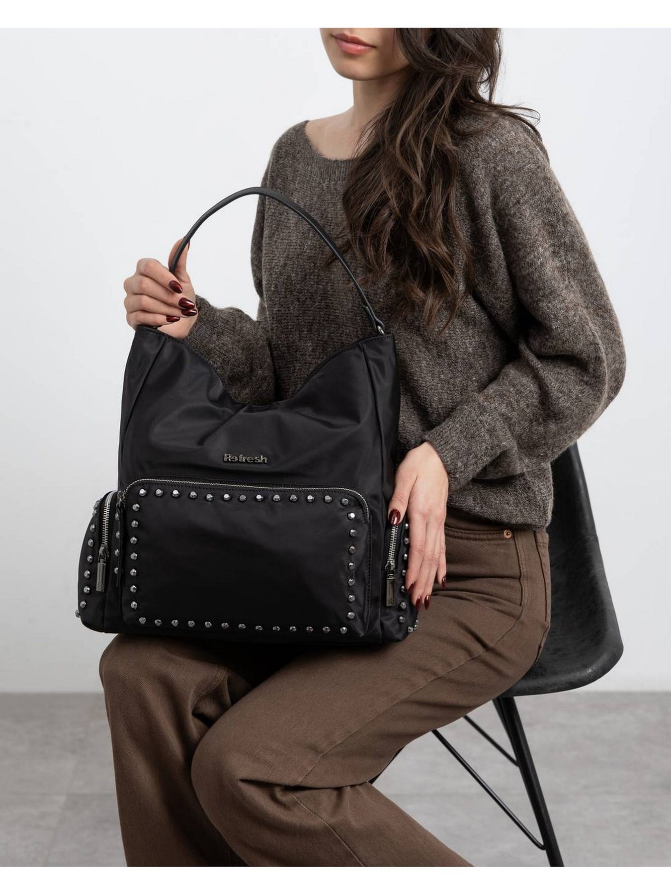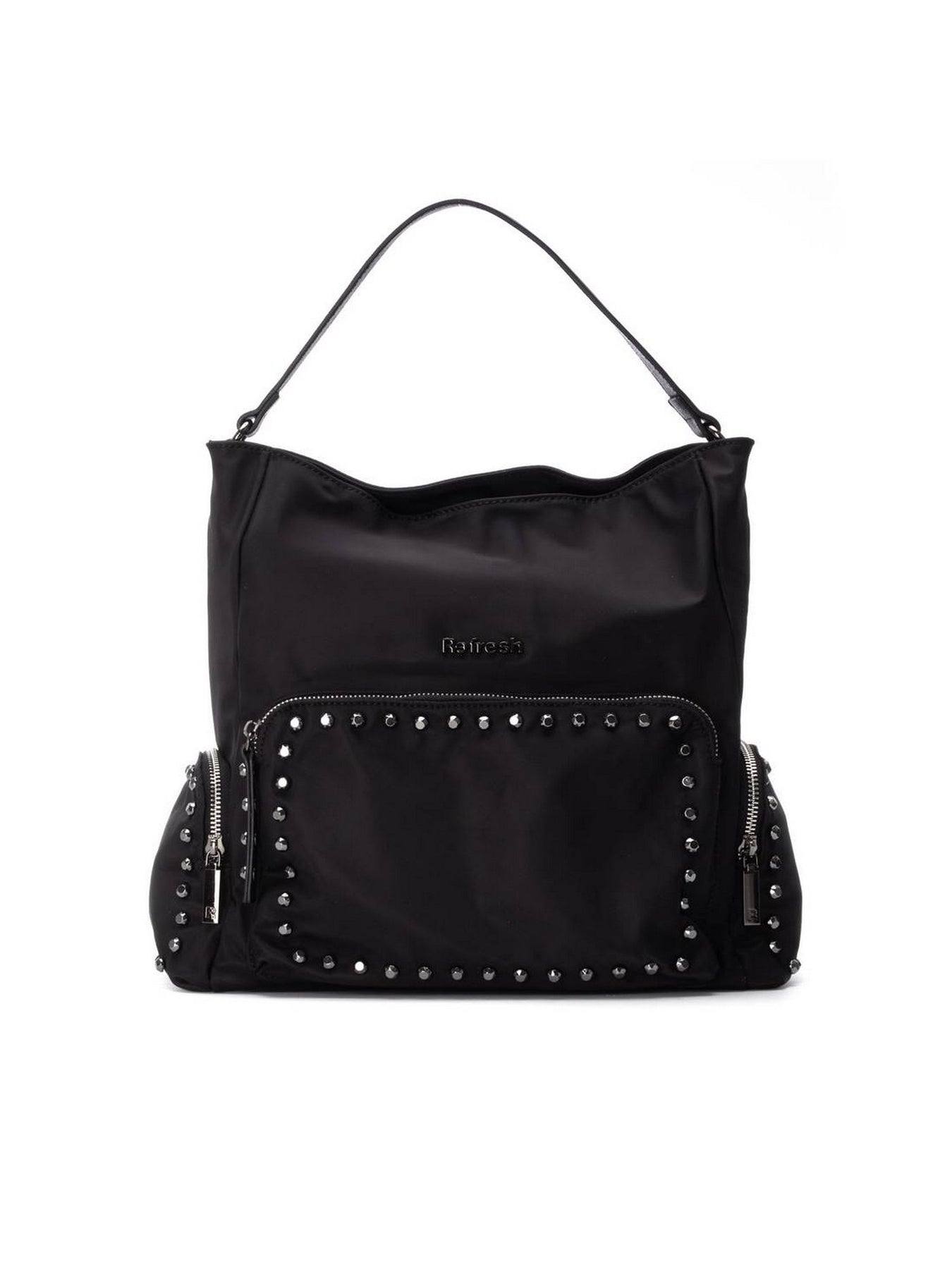 REFRESH Borsa Donna - 183329 Nero Borsa donna in tessuto tecnico nero con borchie decorative e ampio scomparto frontale.