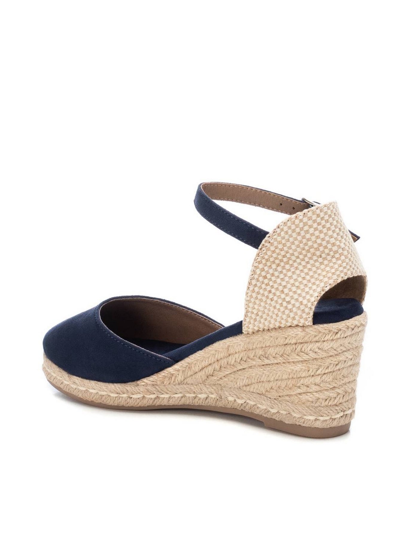 La tomaia in materiale effetto scamosciato, con retro in tessuto a quadretti e zeppa in corda intrecciata, dona un look intramontabile e femminile. Il colore blu navy è perfetto per creare abbinamenti sofisticati con abiti chiari, lino o denim.