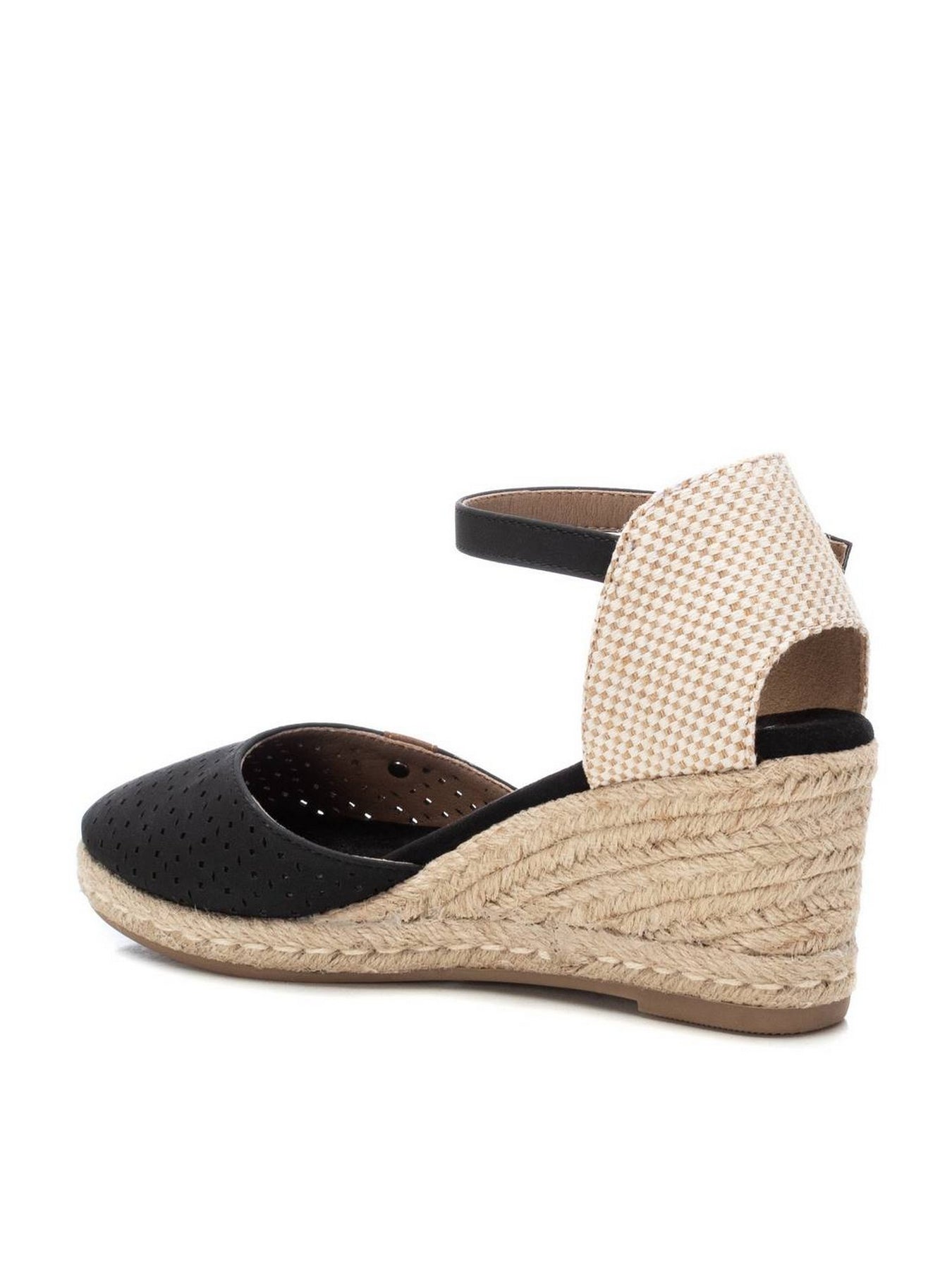 La zeppa in corda intrecciata dona un tocco naturale e artigianale, ideale per look casual chic o outfit da vacanza. Il contrasto tra nero e tessuto a quadretti sul tallone aggiunge originalità e femminilità al design.