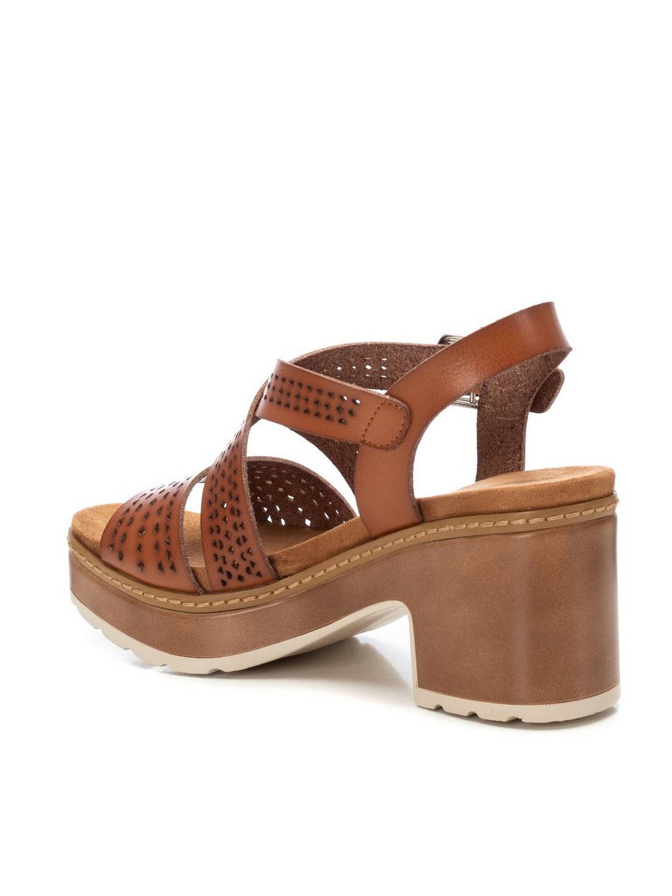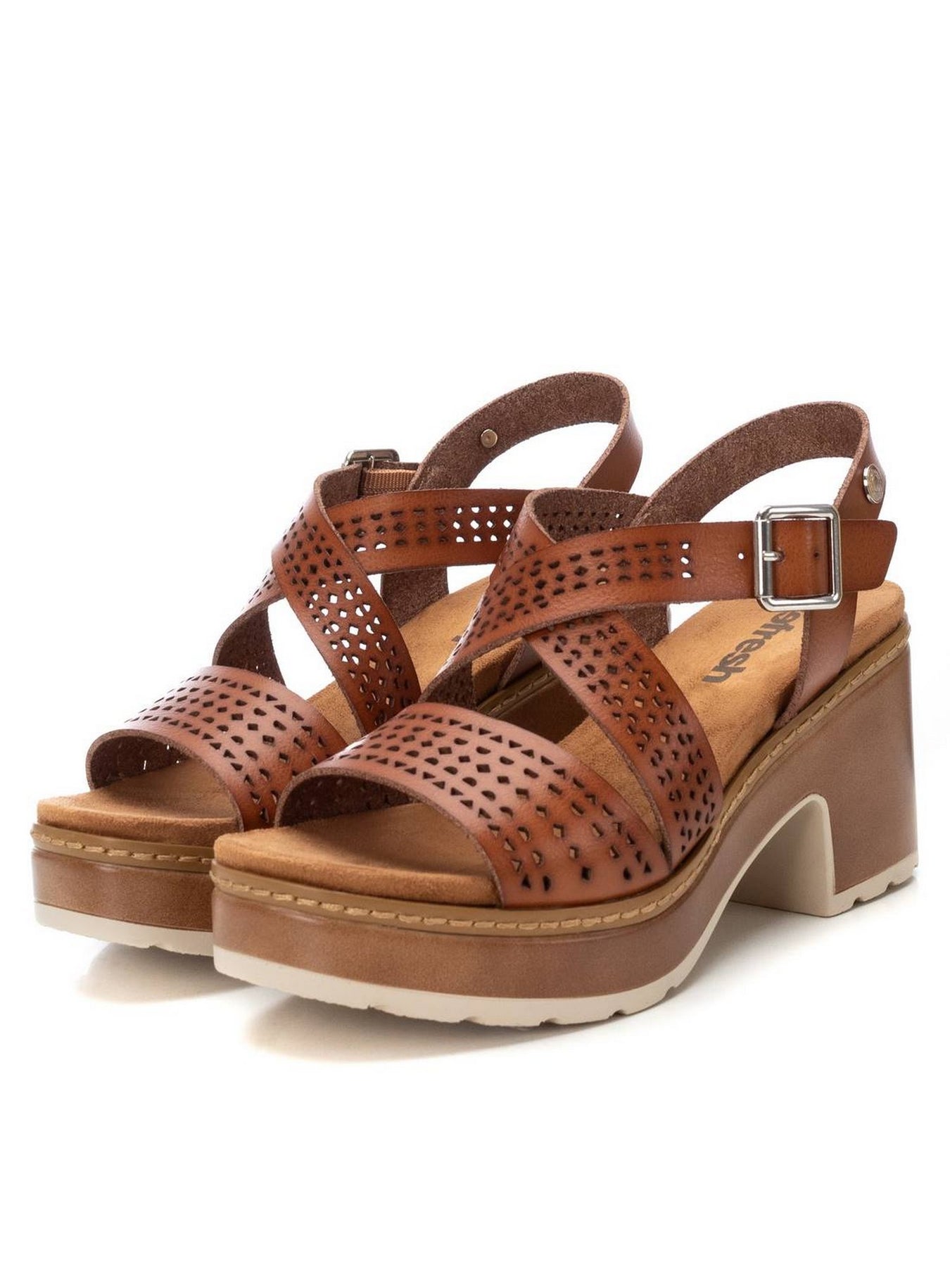 Il REFRESH Sandalo Tacco Medio Donna modello 172847 in Camel è la calzatura ideale per chi cerca un mix perfetto di comfort, eleganza e sostenibilità. Realizzato in materiale che imita la pelle, questo sandalo presenta dettagli traforati che aggiungono un tocco di freschezza e raffinatezza al design. Il cinturino incrociato con fibbia assicura una calzata sicura e una buona aderenza al piede, offrendo massimo supporto.
