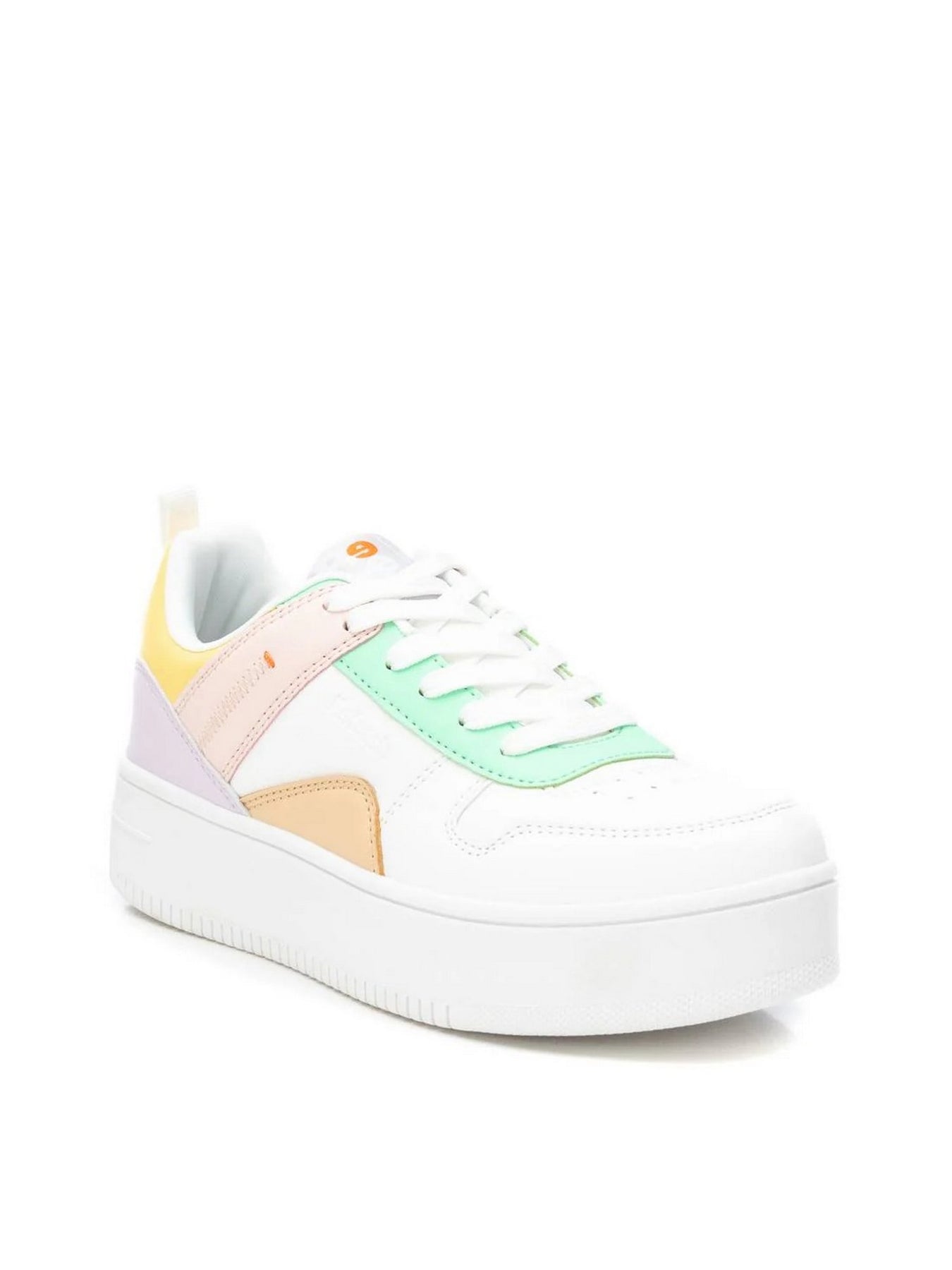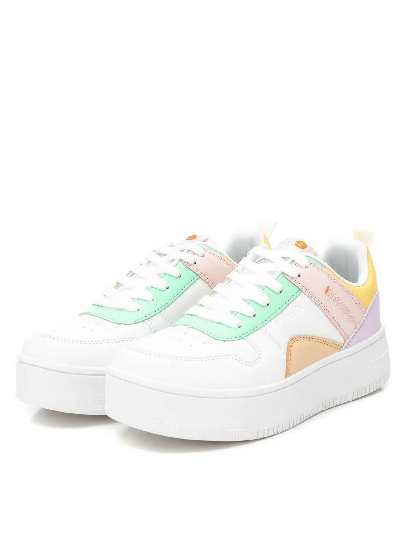 La tomaia in materiale sintetico con inserti color pastello (verde menta, lilla, pesca e giallo) si abbina facilmente a look casual e sportivi. Il design chunky con suola platform dona slancio, mentre la chiusura con lacci assicura una calzata regolabile e comoda.