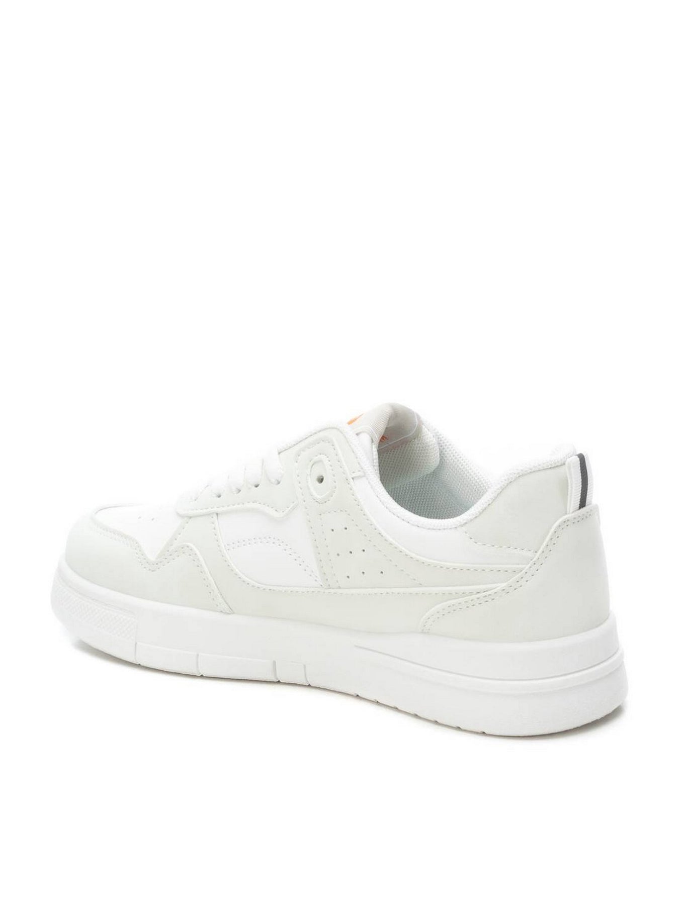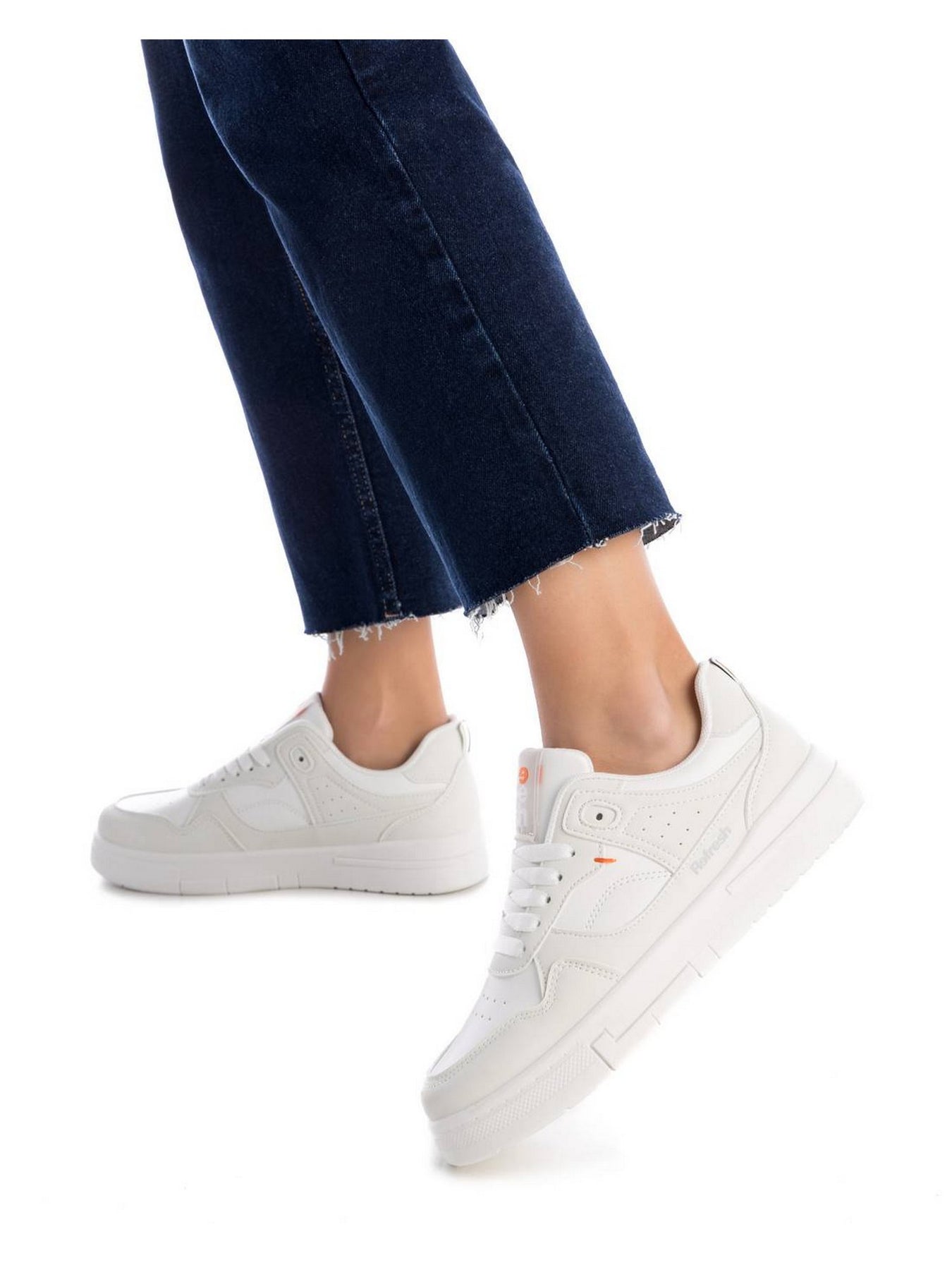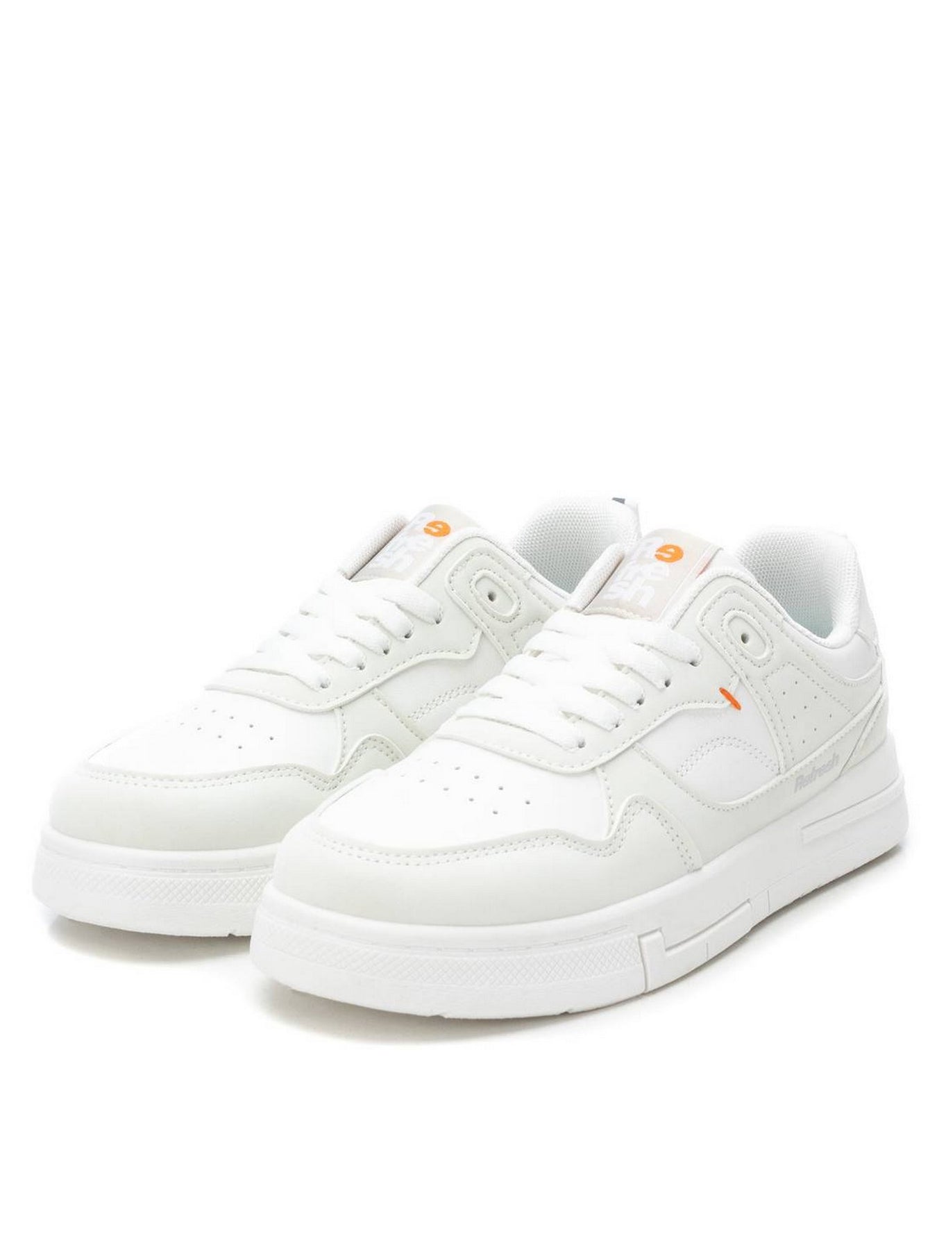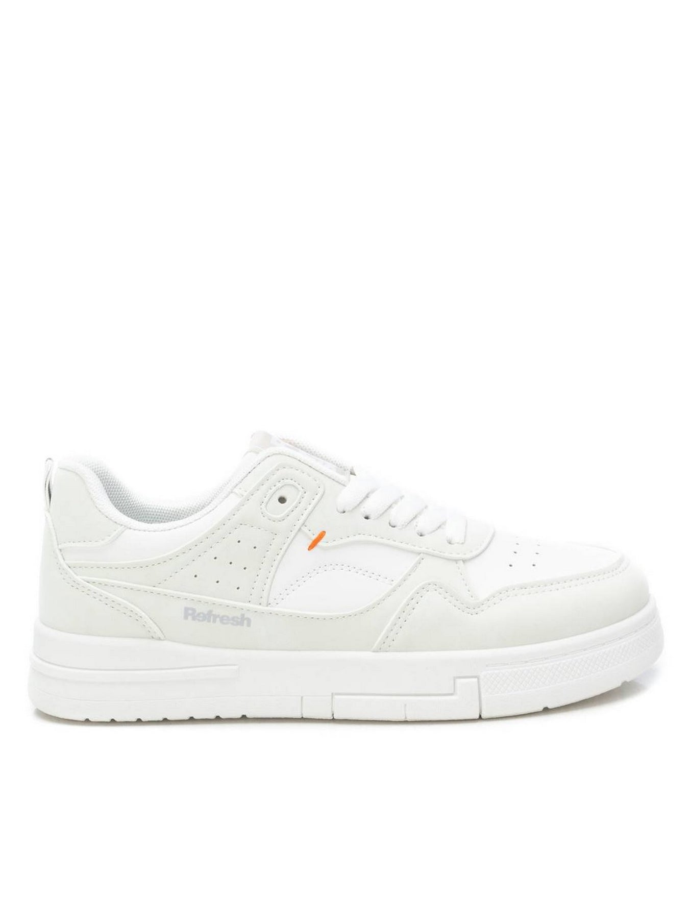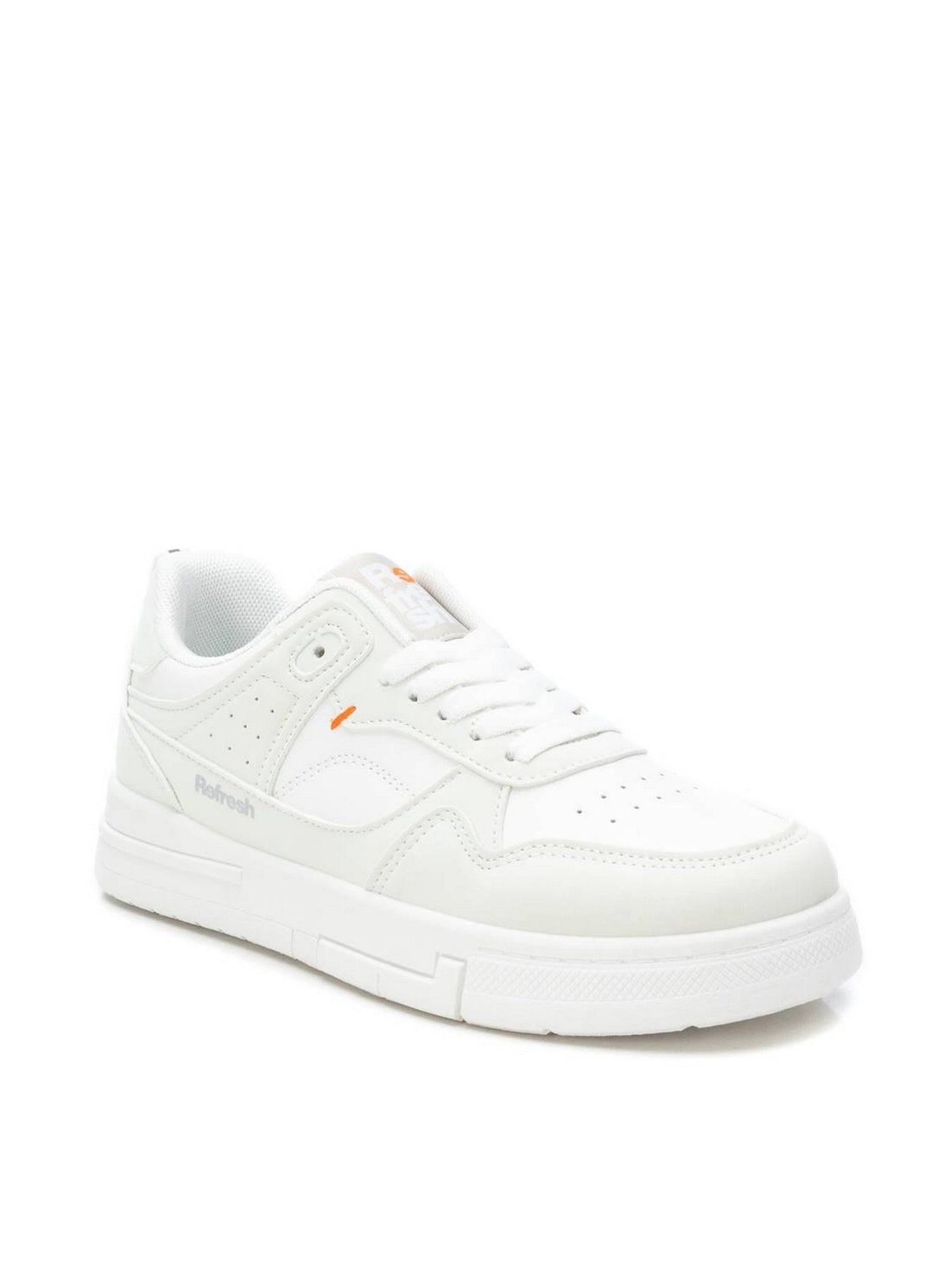 La sneaker REFRESH 172346 in ecopelle bianca presenta un design pulito e moderno, con piccoli inserti traforati laterali per traspirabilità e un dettaglio arancione a contrasto per un tocco distintivo.