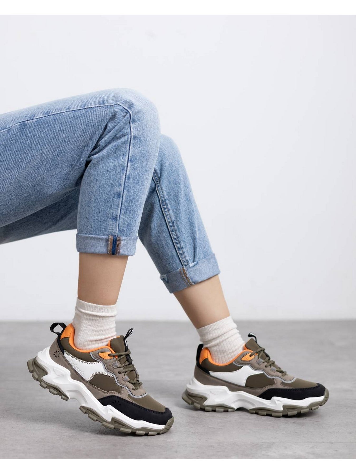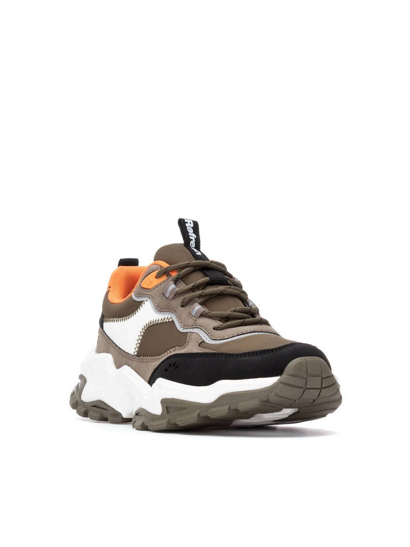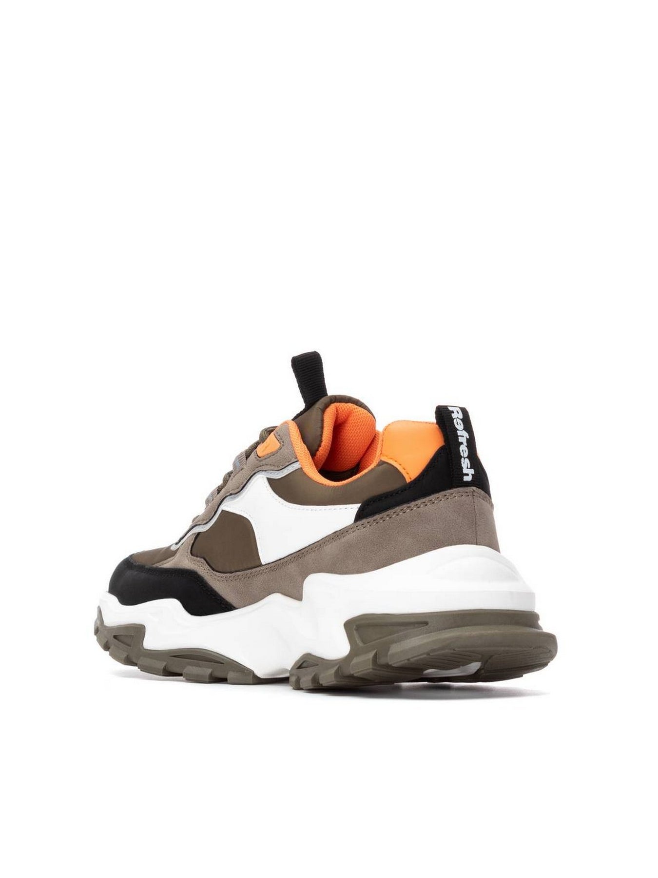 La sneaker REFRESH 173104 in color kaki è pensata per chi ama il mix perfetto tra comfort e design deciso. Il look multicolor fonde toni neutri come kaki, nero e grigio con dettagli arancioni a contrasto e inserti in bianco ottico, creando una sneaker dal forte impatto visivo.