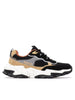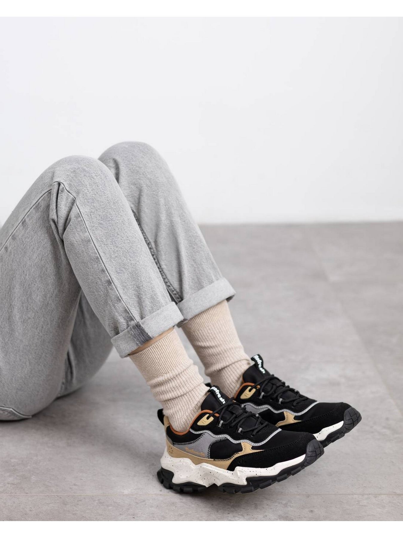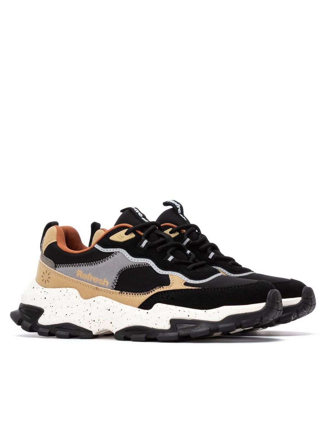 La sneaker REFRESH 173104 unisce look audace e funzionalità. Realizzata in mix di materiali sintetici e tessuto, presenta una tomaia nera con inserti beige e grigi per un contrasto dinamico. La suola chunky in gomma con effetto maculato bianco-nero garantisce aderenza e stabilità, mentre l'ammortizzazione assicura comfort prolungato.