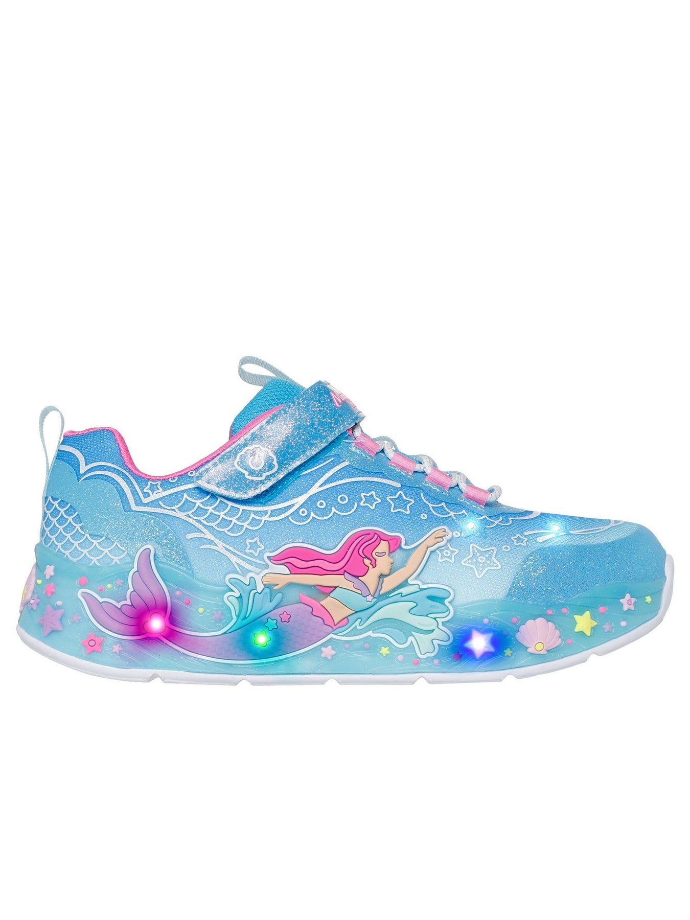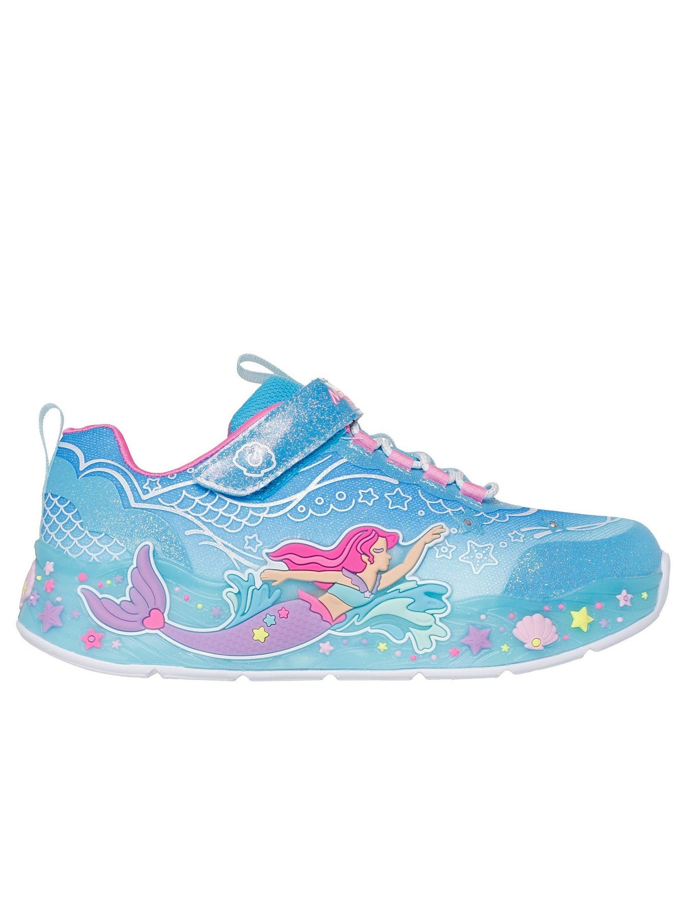 La tomaia multicolore con stampa sirena, onde e conchiglie è arricchita da effetti glitterati che catturano la luce e l'immaginazione. La fodera in tessuto traspirante assicura freschezza e comfort anche durante un uso prolungato. Il sottopiede imbottito offre un'ammortizzazione morbida, mentre la chiusura con strappo regolabile garantisce una calzata facile e stabile. La suola flessibile in gomma accompagna ogni passo con leggerezza e sicurezza. Ideale per la scuola, il tempo libero e per tutte le piccole fan del mondo marino.