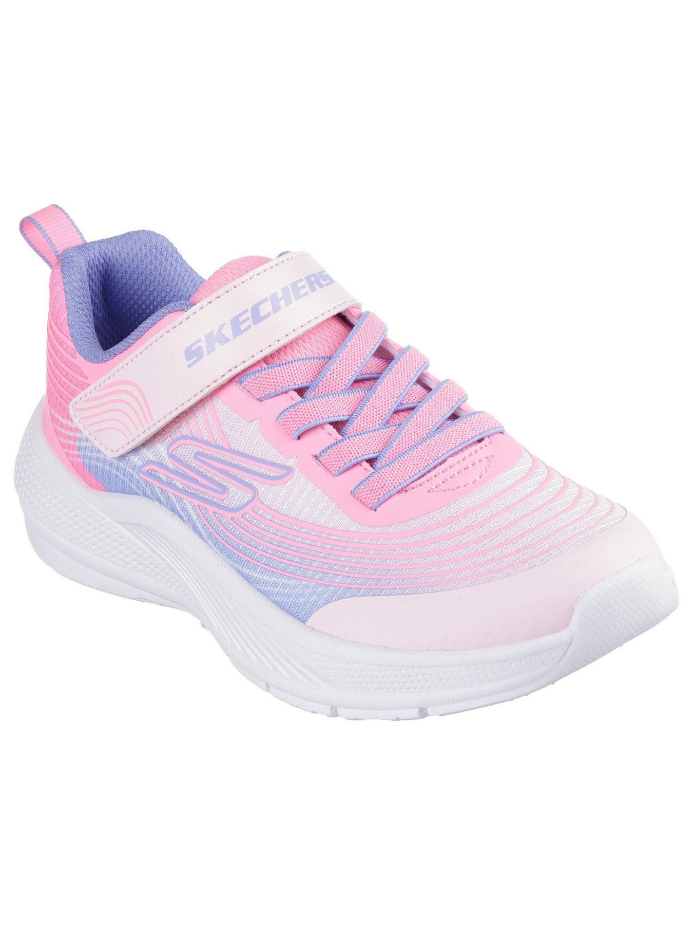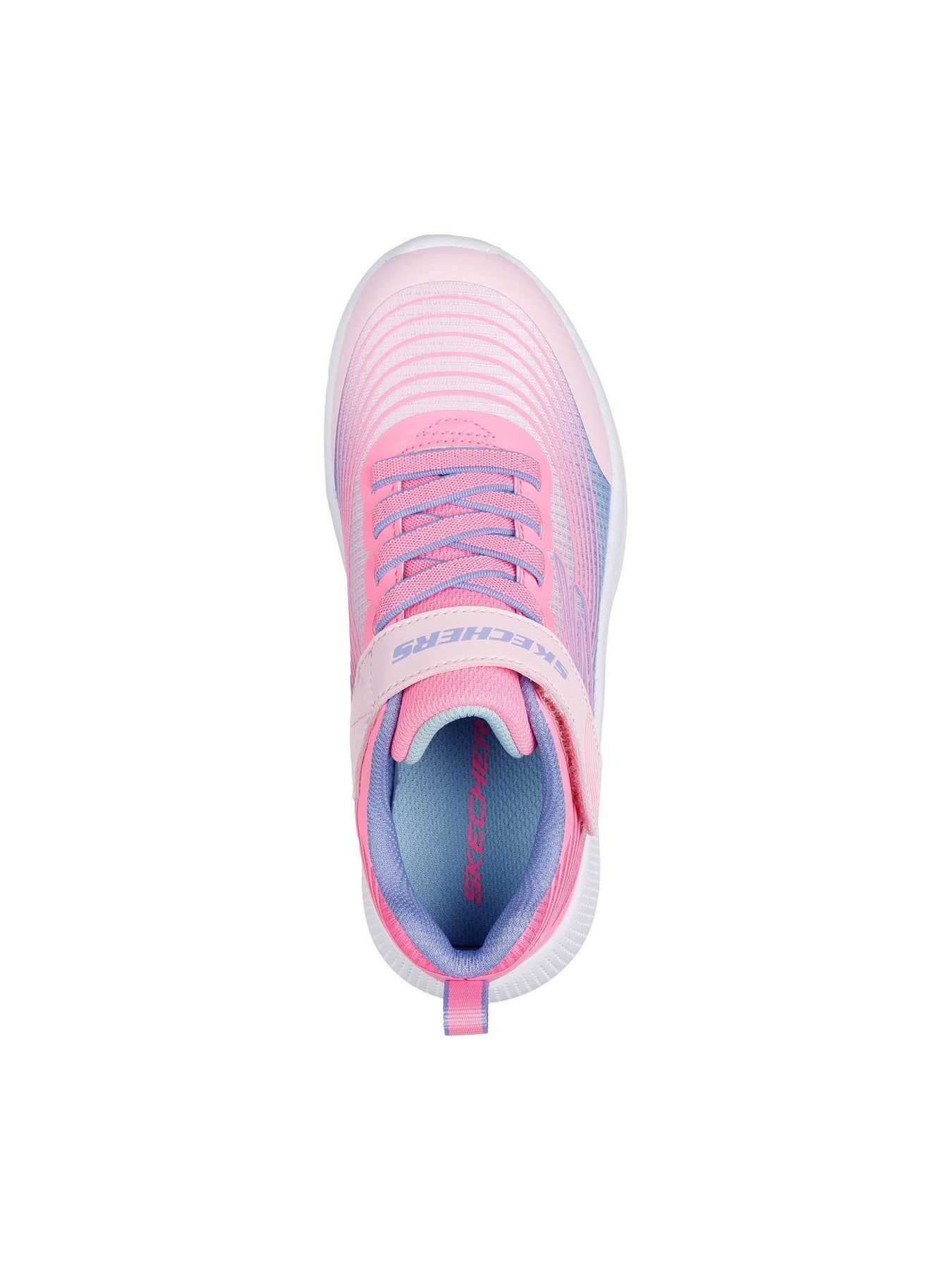 La tomaia rosa e lilla in tessuto tecnico traspirante, con logo SKECHERS in rilievo, garantisce freschezza e libertà di movimento. La fodera interna in mesh morbido assicura una sensazione piacevole al piede, mentre il sottopiede imbottito offre ammortizzazione ideale per la scuola, il gioco o il tempo libero. La chiusura a strappo con lacci elastici facilita la calzata autonoma e stabile. La suola in EVA leggera e flessibile favorisce movimenti naturali e sicuri, anche durante le giornate più attive.