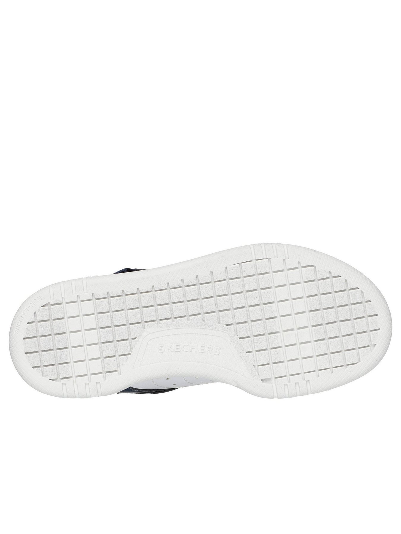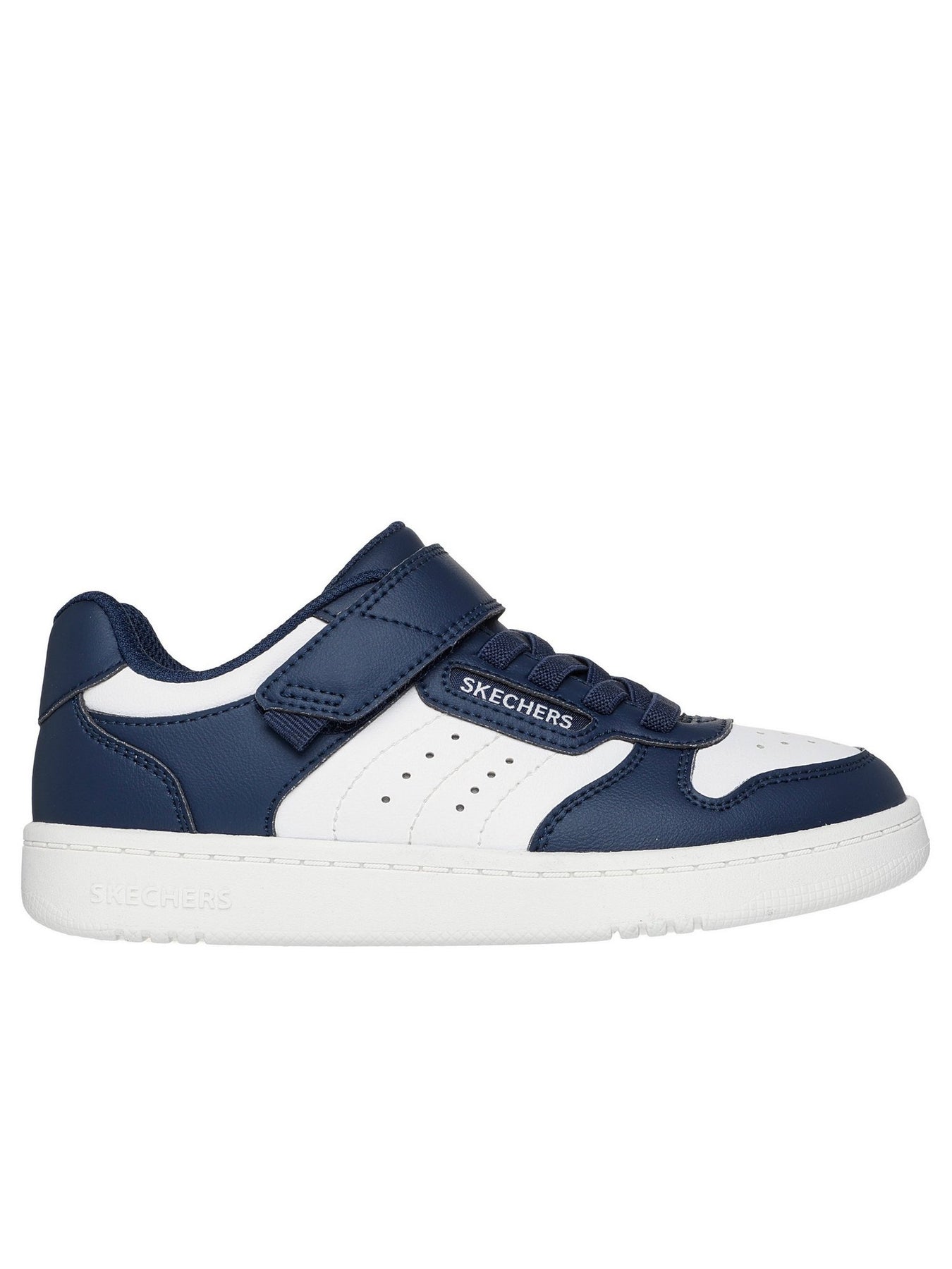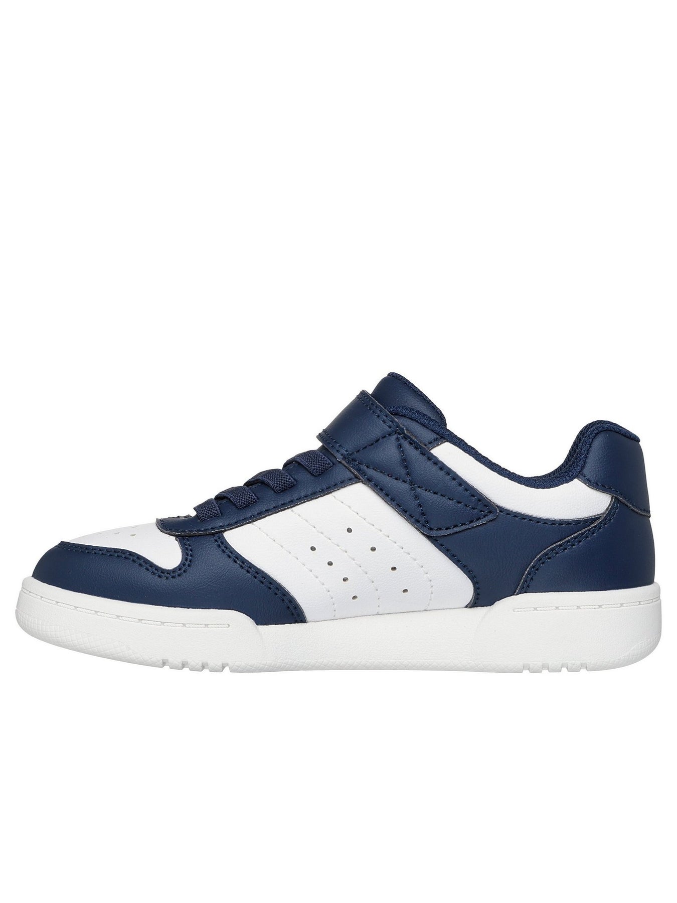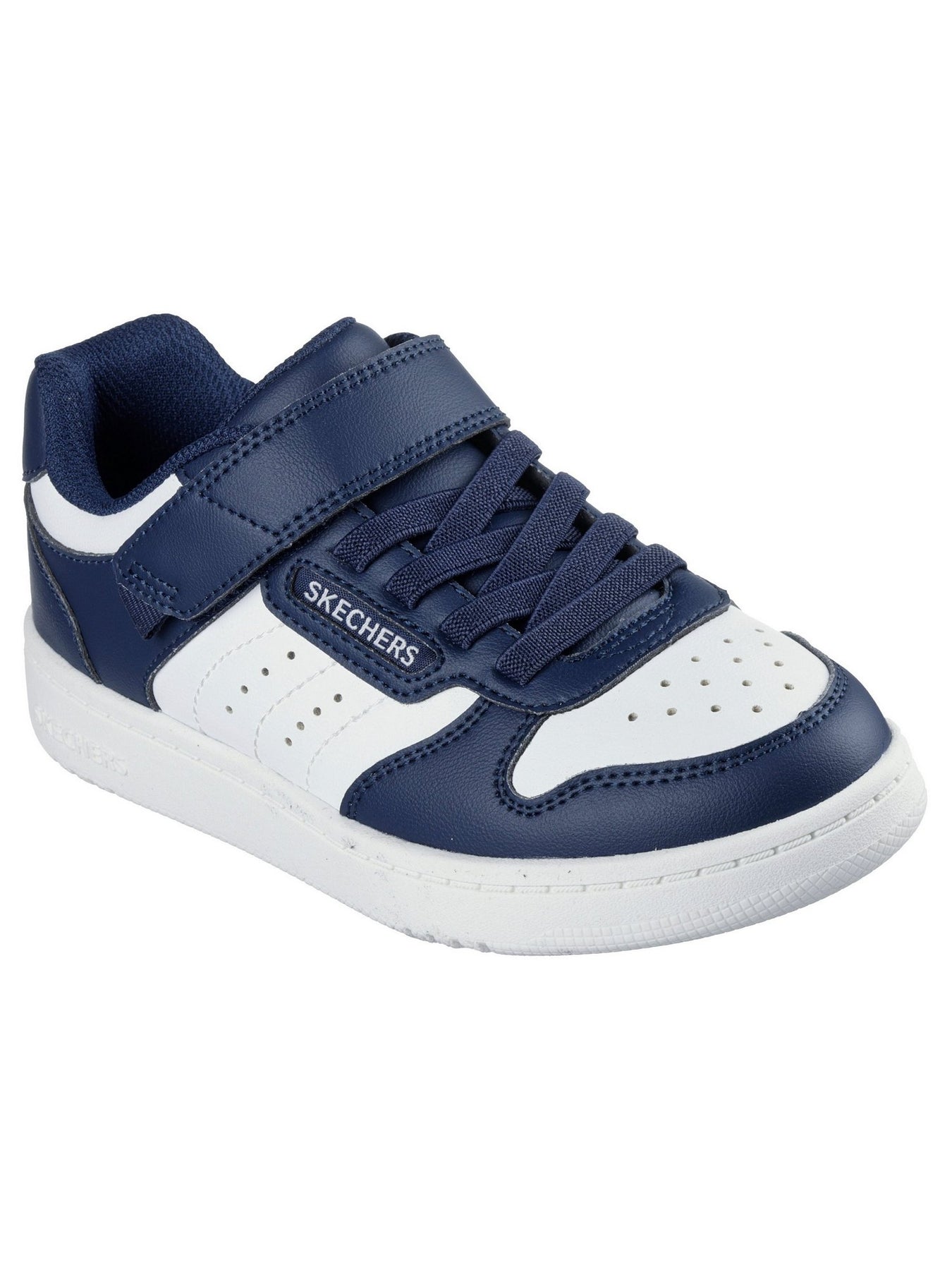 La sneaker SKECHERS 405638L Blu richiama lo stile delle scarpe da basket classiche, con design bicolore blu e bianco e logo SKECHERS sul cinturino e sul lato.