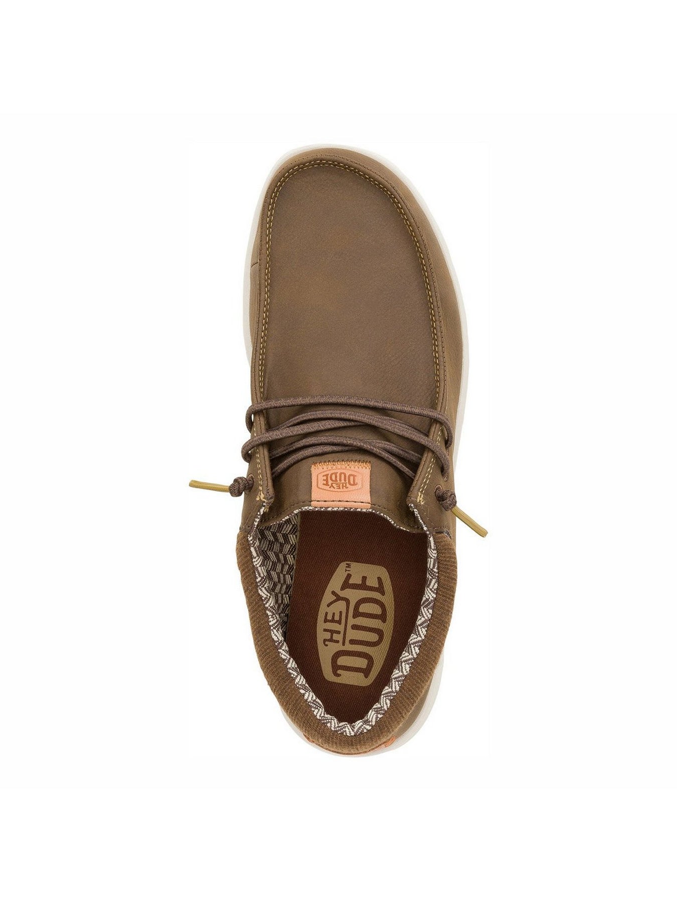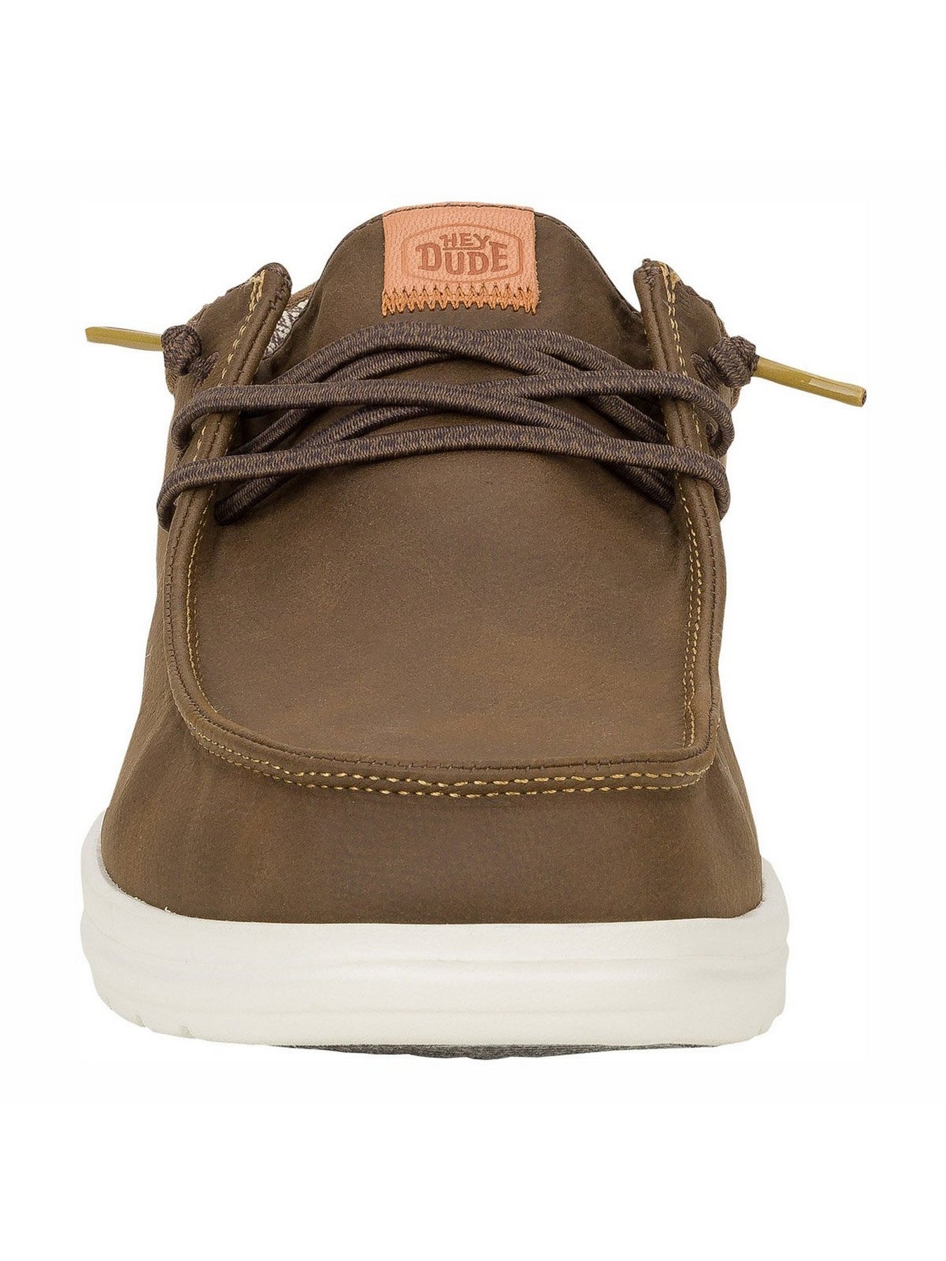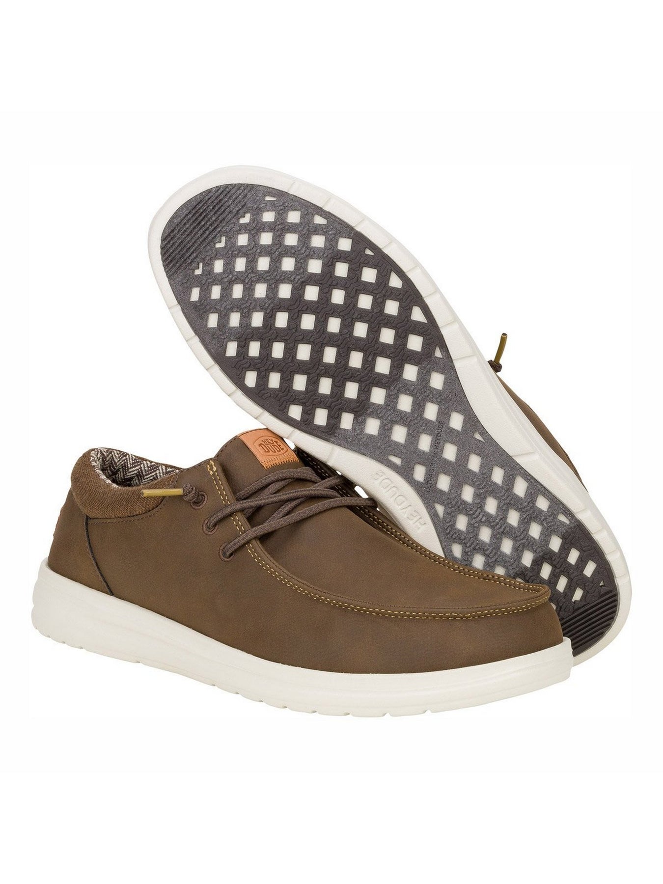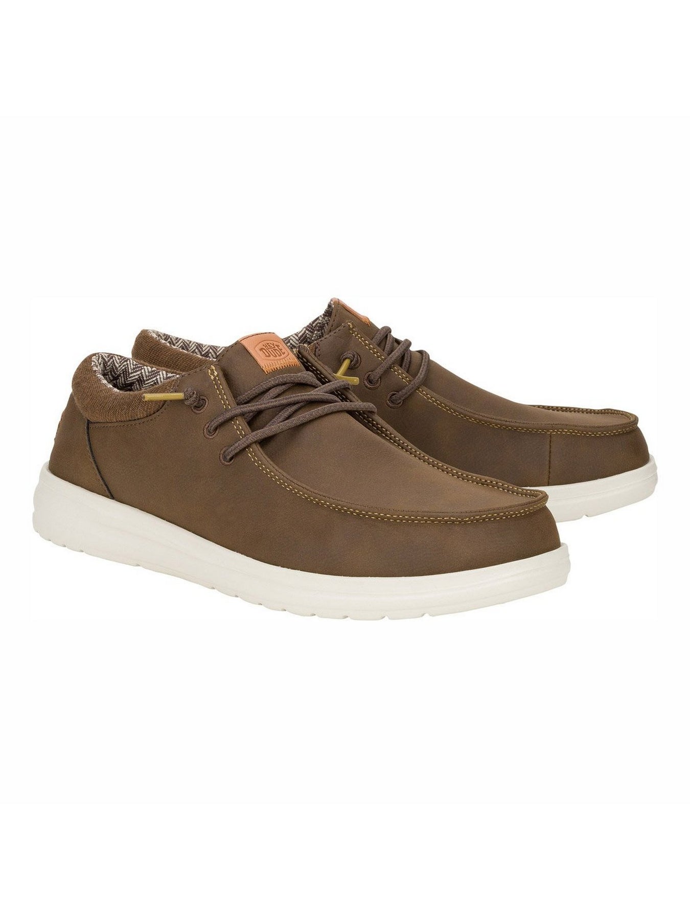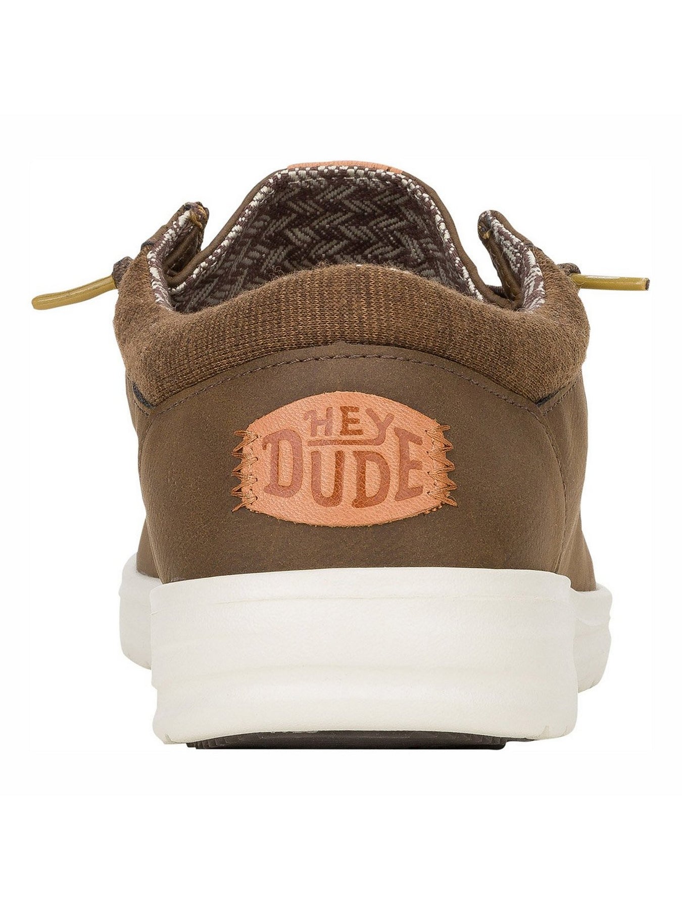 Realizzata in materiale effetto nabuk nei toni del marrone, questa sneaker HEY DUDE si distingue per la sua silhouette bassa e pulita, facile da abbinare a diversi outfit casual. Il design minimal è arricchito da discreti dettagli a contrasto e dal logo del brand sul retro, che conferiscono un tocco moderno e riconoscibile.