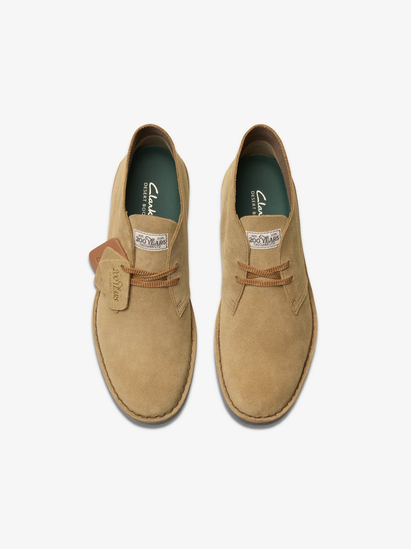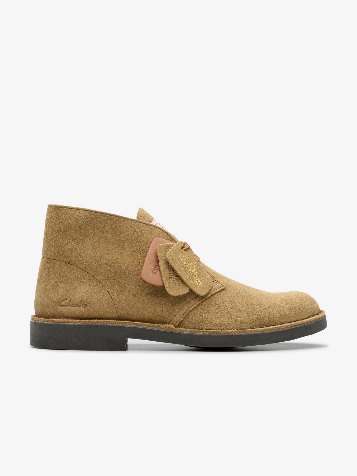 Un dettaglio distintivo è la finitura con tre ciondoli esclusivi: uno con marchio in lamina d'oro, uno con rilievo per il 200° anniversario e un classico ciondolo Clarks in pelle vegetale, che ne certificano l'autenticità e il prestigio.