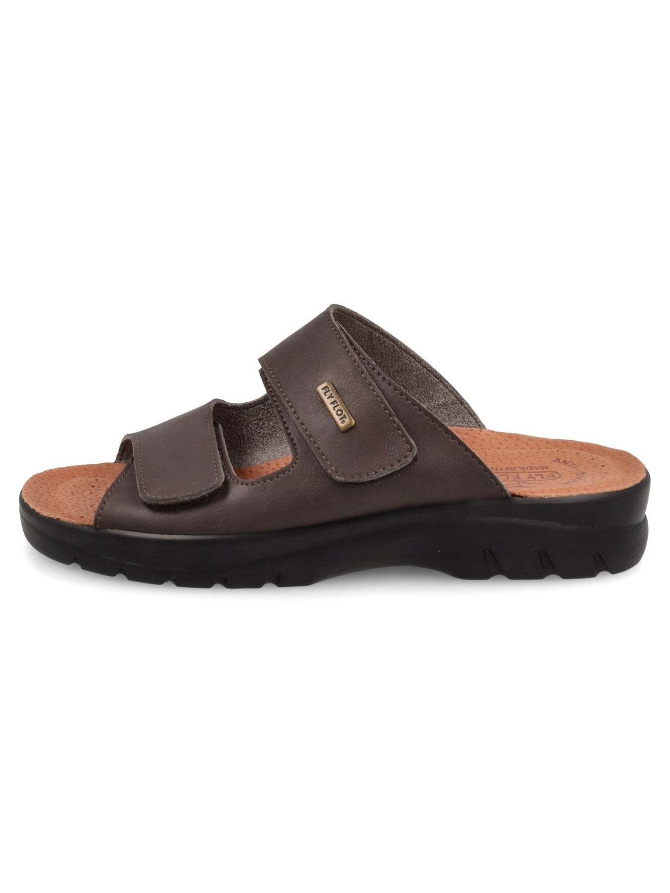 La tomaia in morbida pelle marrone è dotata di doppia fascia regolabile in velcro per una calzata personalizzata, mentre il sottopiede anatomico in pelle accoglie il piede garantendo sostegno e traspirazione. La suola in poliuretano flessibile assicura aderenza e leggerezza, perfetta per l'utilizzo in casa o all'esterno durante le giornate più calde.