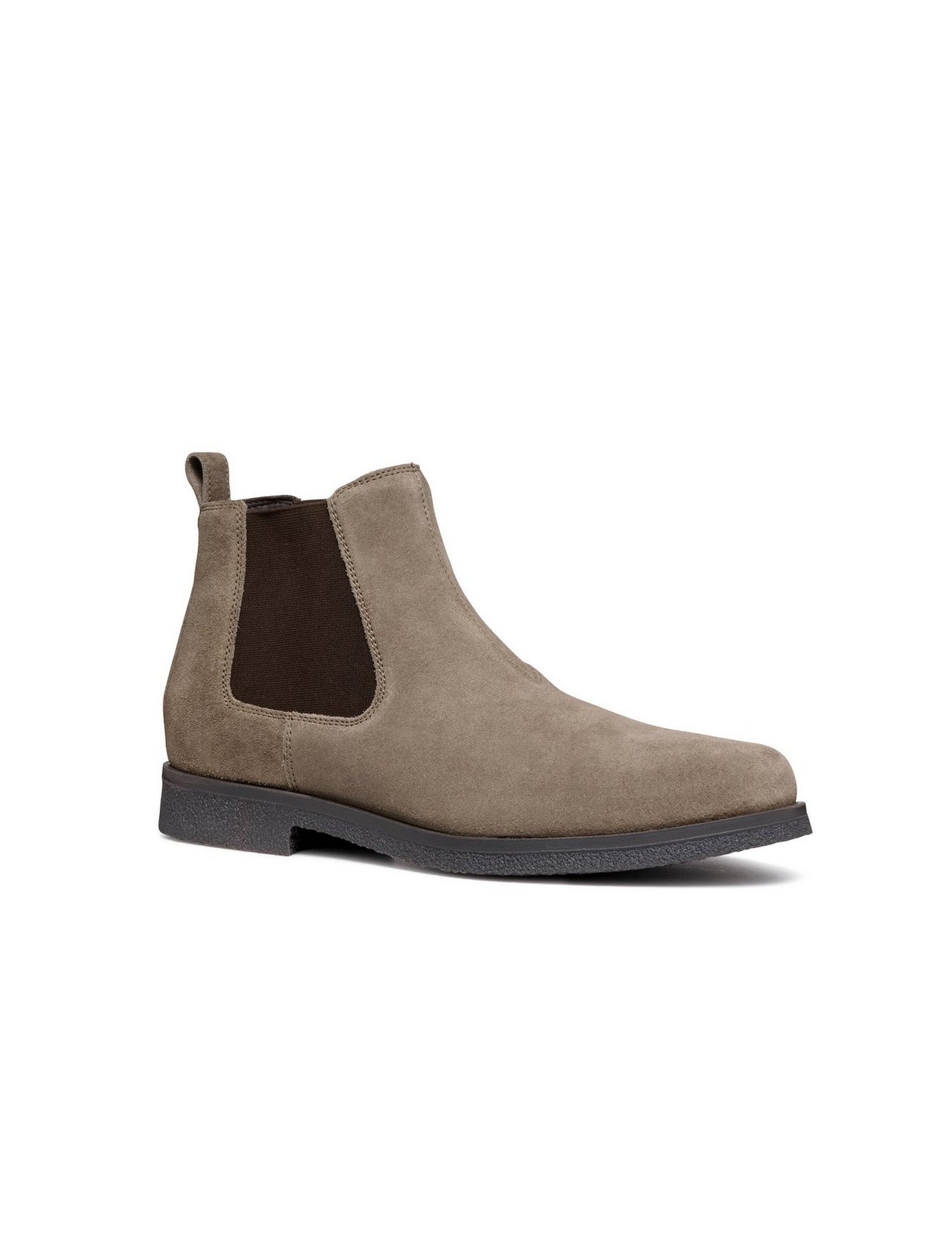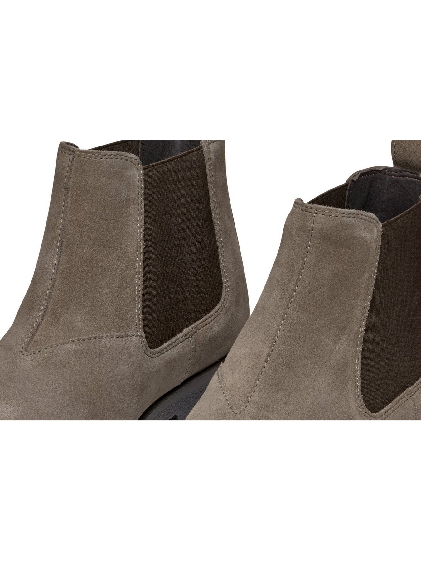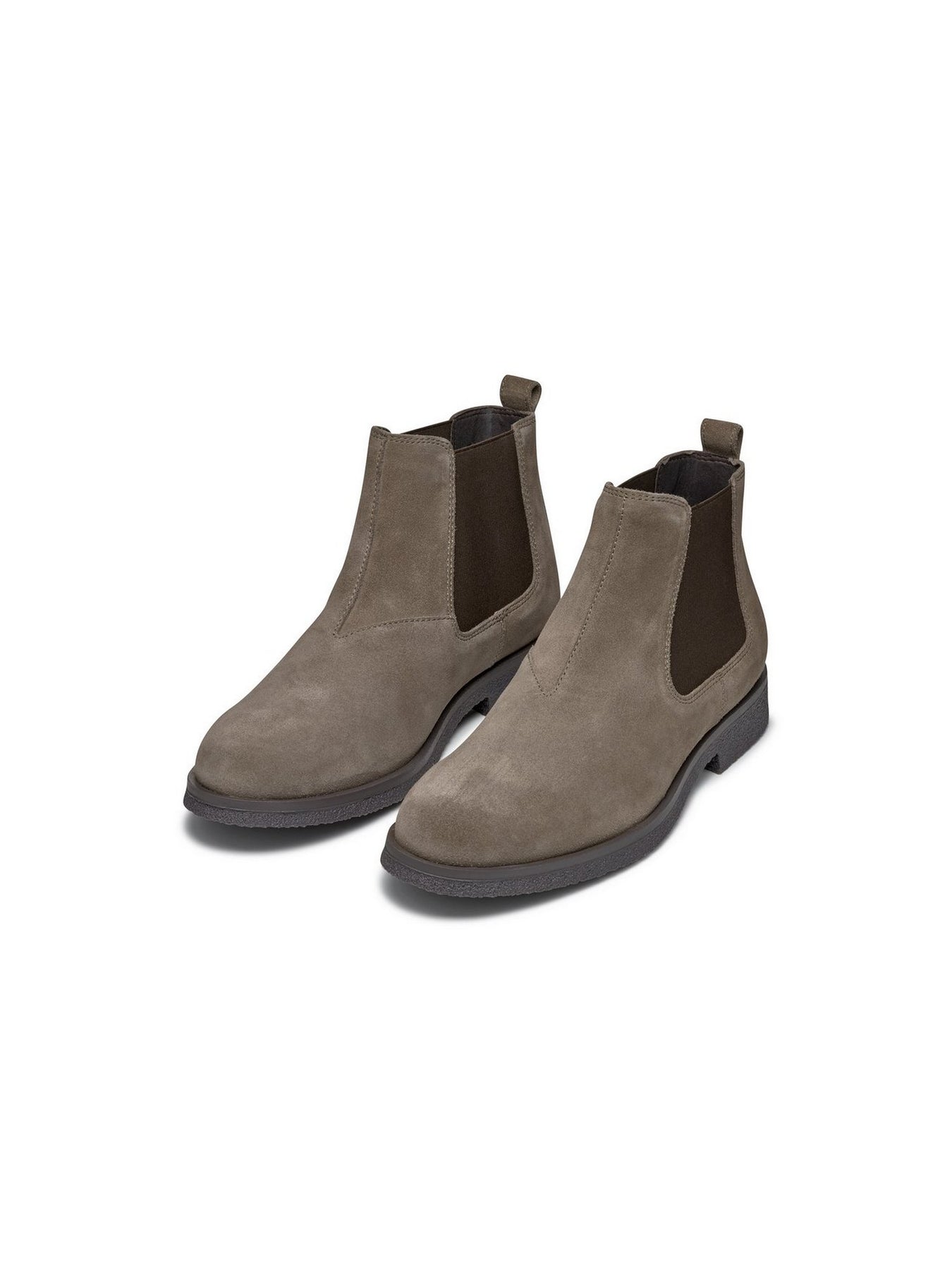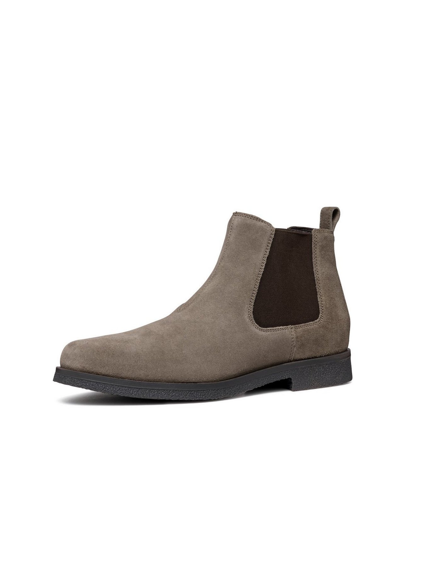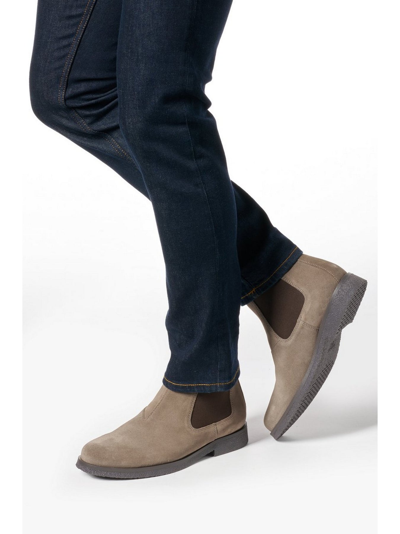 Realizzato in morbido suede color grigio tortora, si distingue per il design minimal e la praticità degli inserti elastici laterali che garantiscono una calzata facile e confortevole. La linguetta posteriore ne facilita l'indosso, mentre la struttura essenziale lo rende un modello versatile e senza tempo.