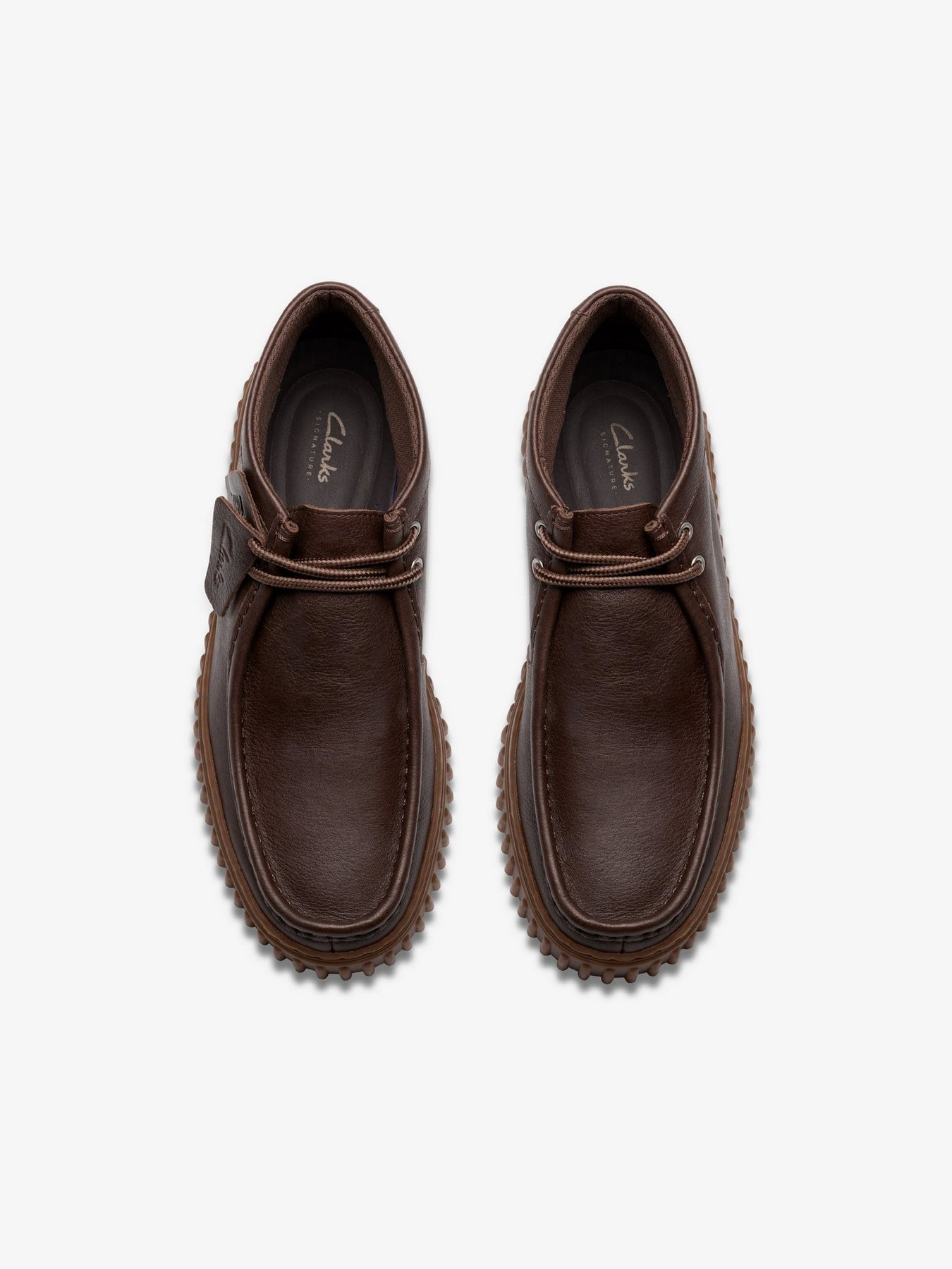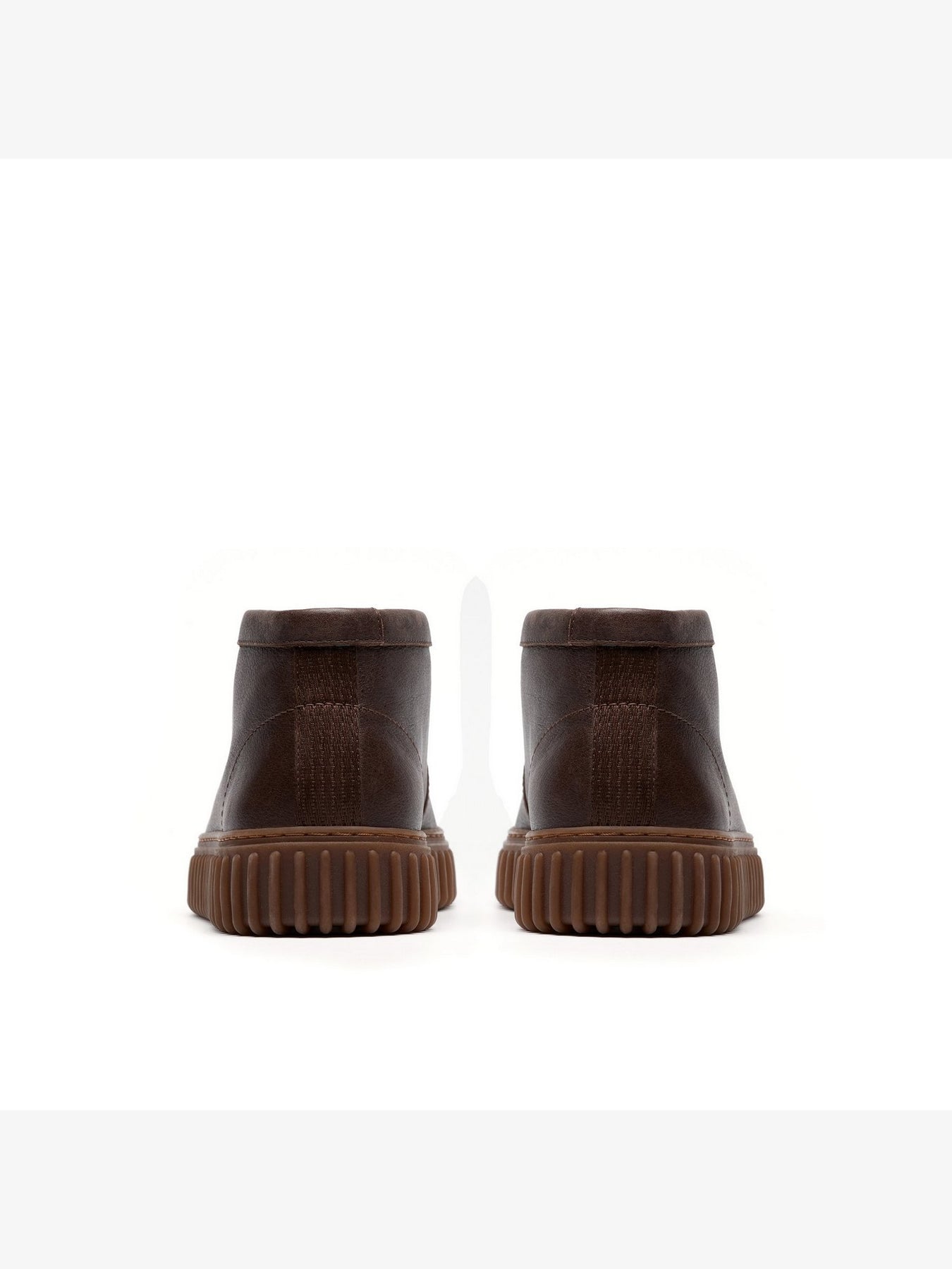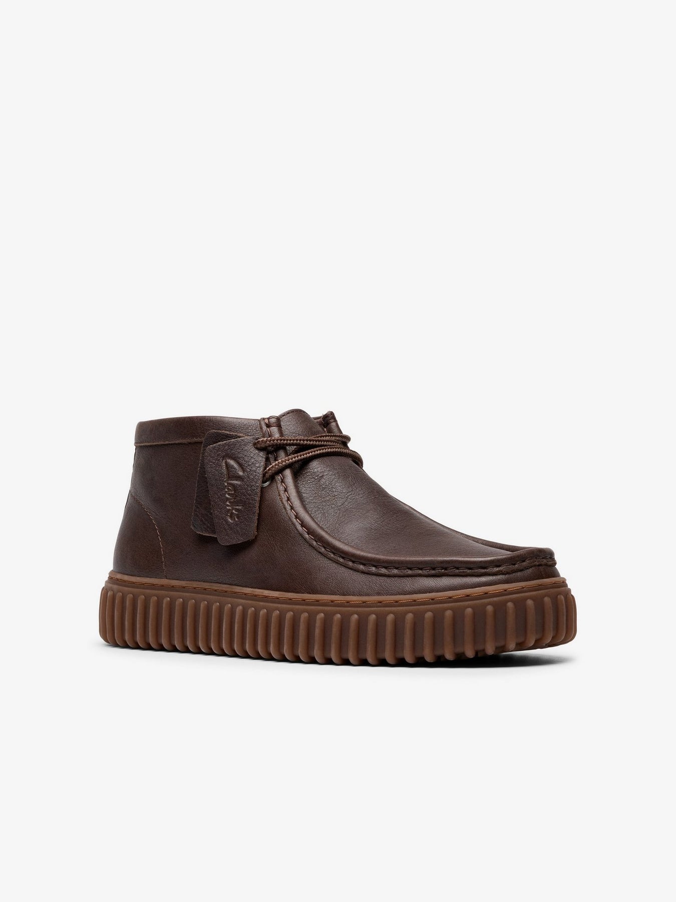 Realizzata in pelle naturale color marrone scuro (Dark Brown), la Torhill Hi presenta una costruzione artigianale con cuciture a vista e il caratteristico tag Clarks in pelle, simbolo di autenticità e qualità.