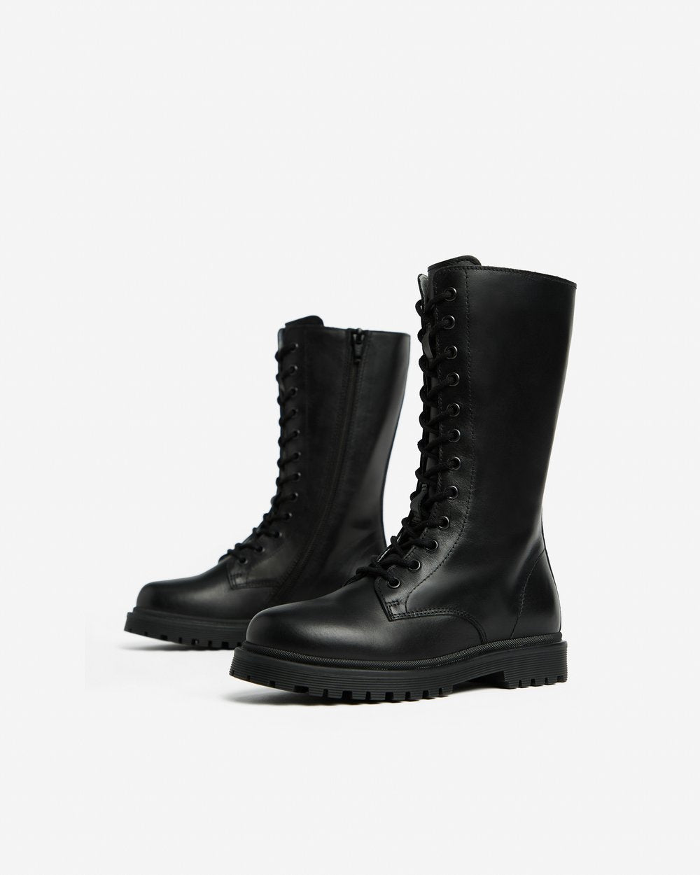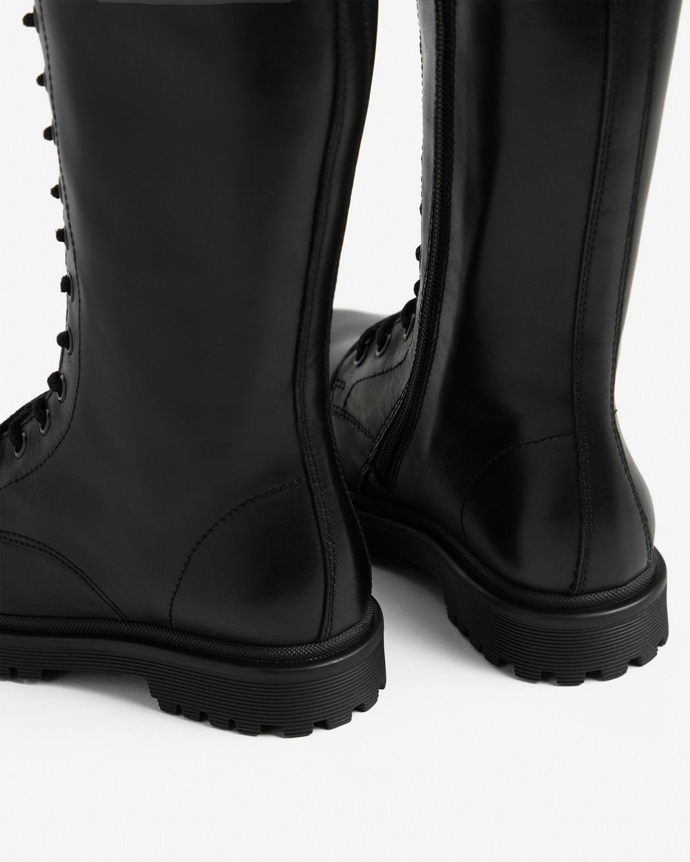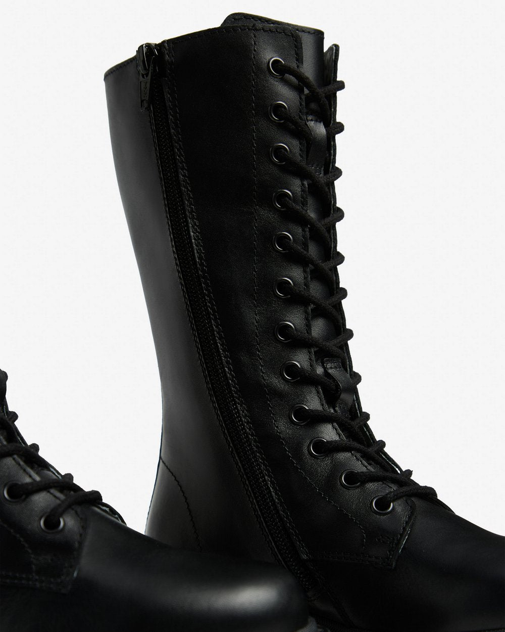 Realizzati in pelle nera di alta qualità, questi anfibi presentano una linea alta con chiusura a stringhe frontale e cerniera laterale che facilita la calzata. Il design robusto e la suola in gomma dentata assicurano stabilità, aderenza e resistenza nel tempo, perfetti per affrontare con stile anche le giornate più dinamiche.