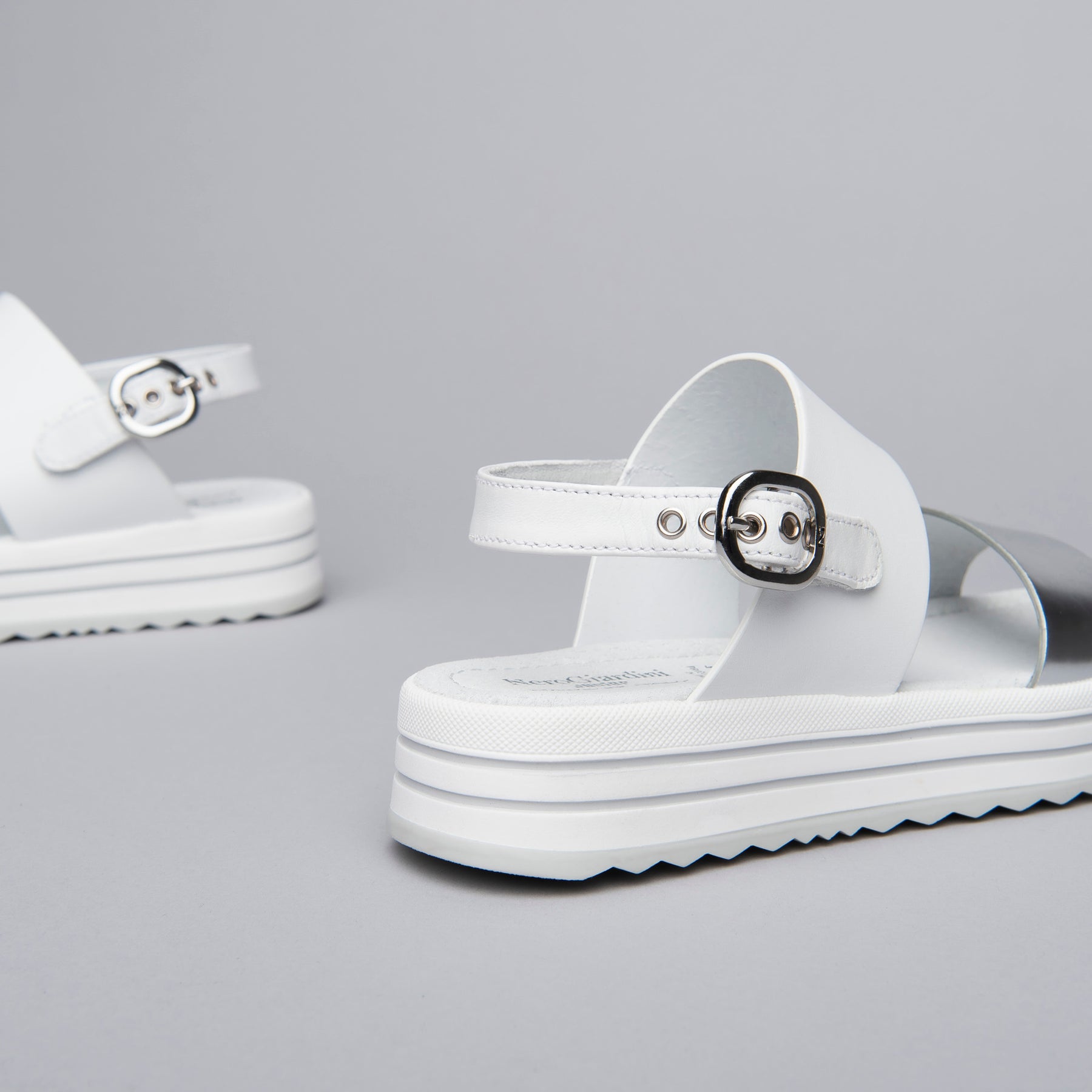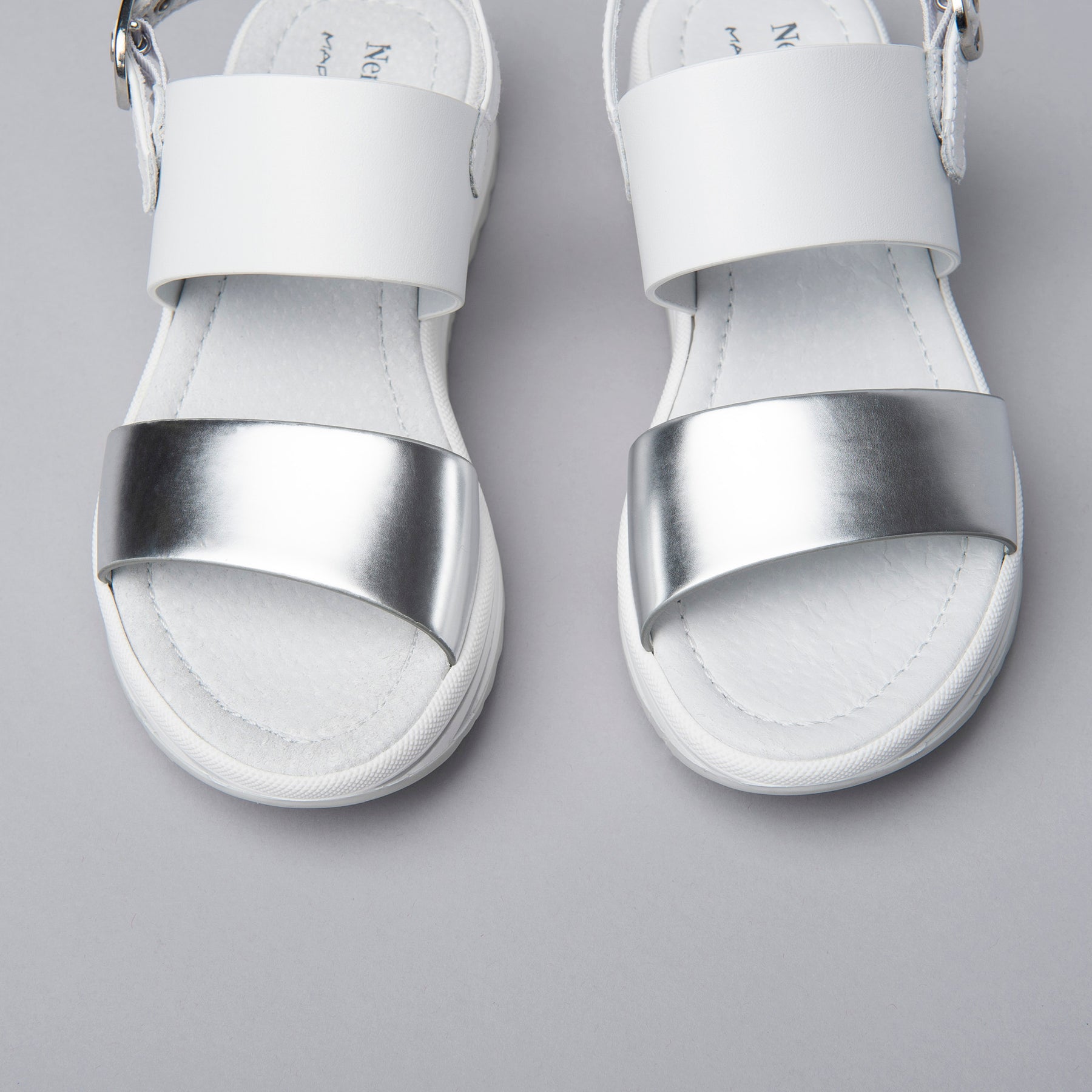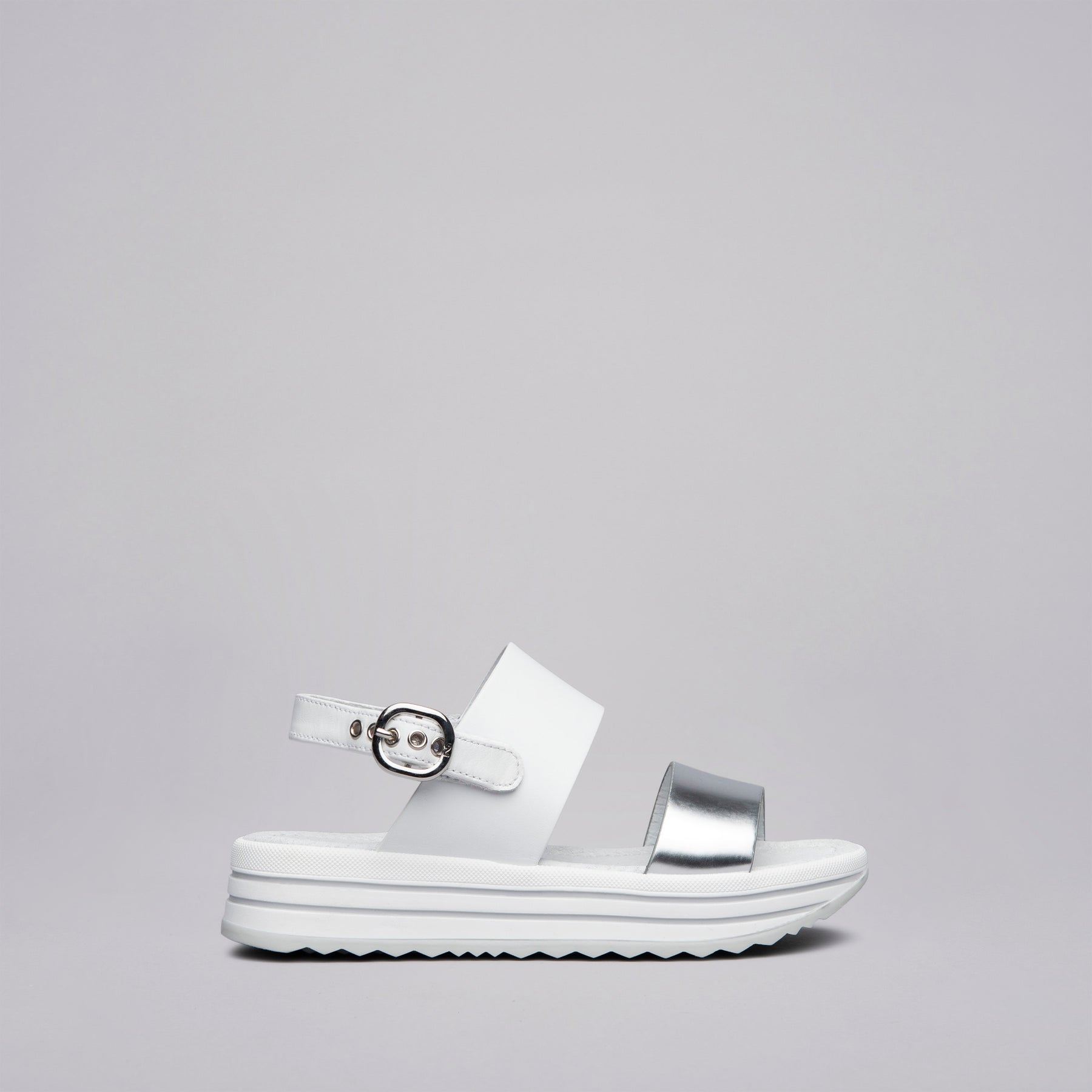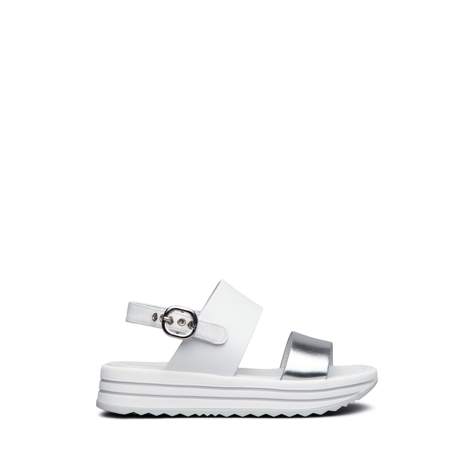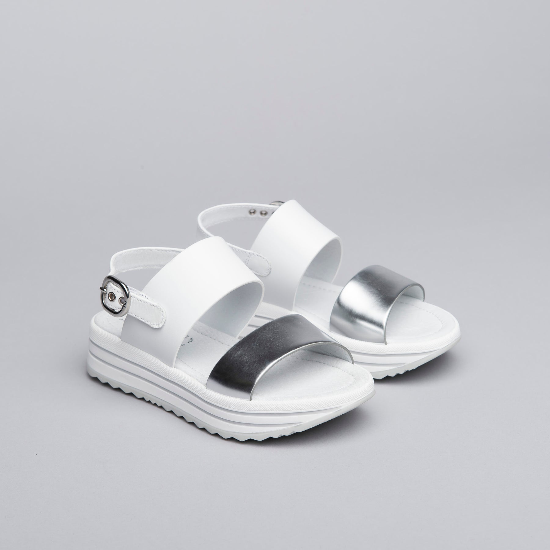 Sandali da ragazza realizzati in Italia con materiali di qualità e testati in laboratorio. Continua ricerca stilistica per trend nuovi e originali. Modello in pelle e materiale tecnico laminato su fondo platform ultraleggero e comoda fibbia di chiusura.