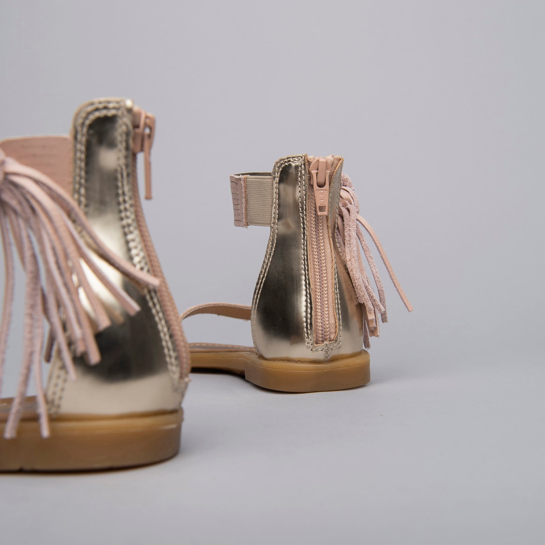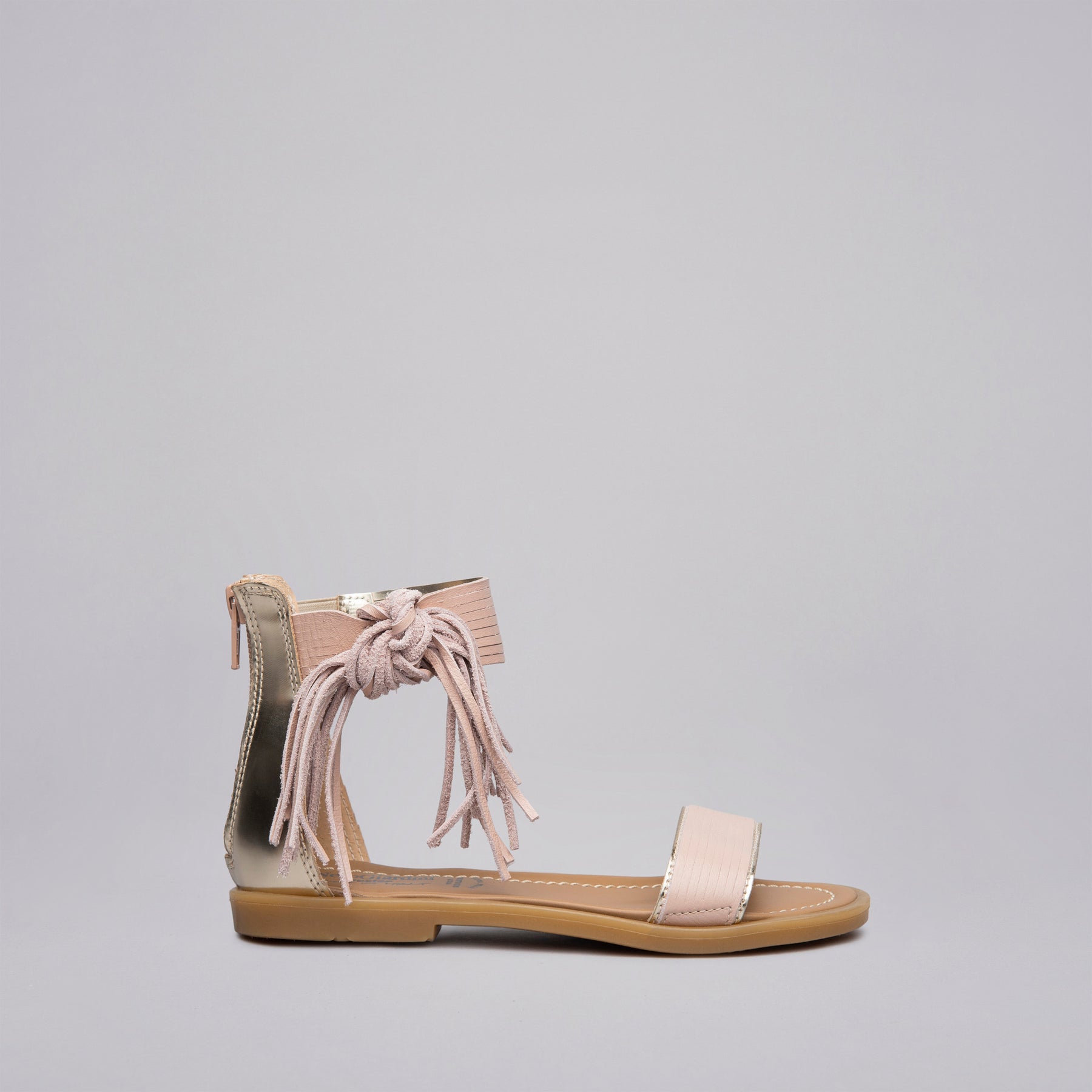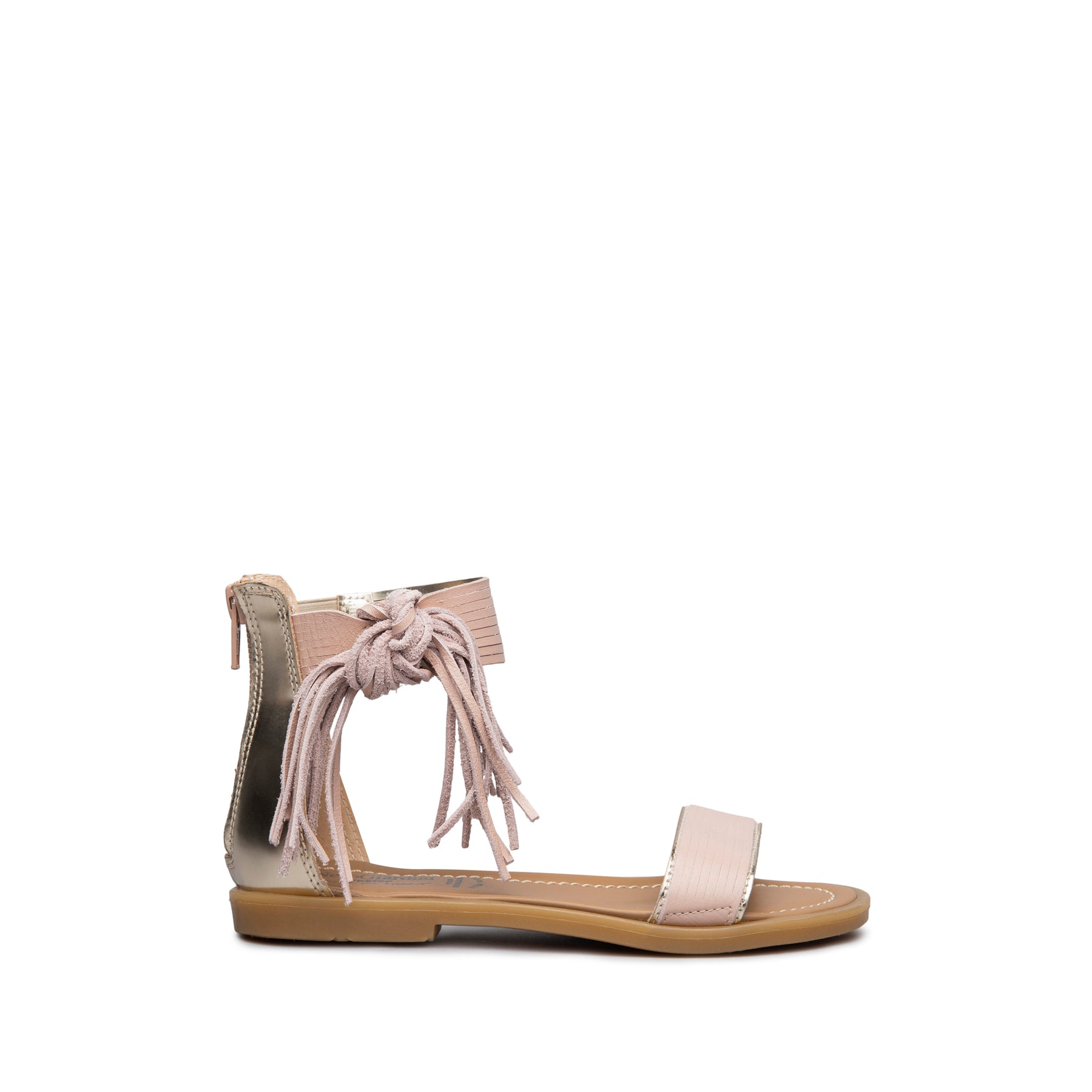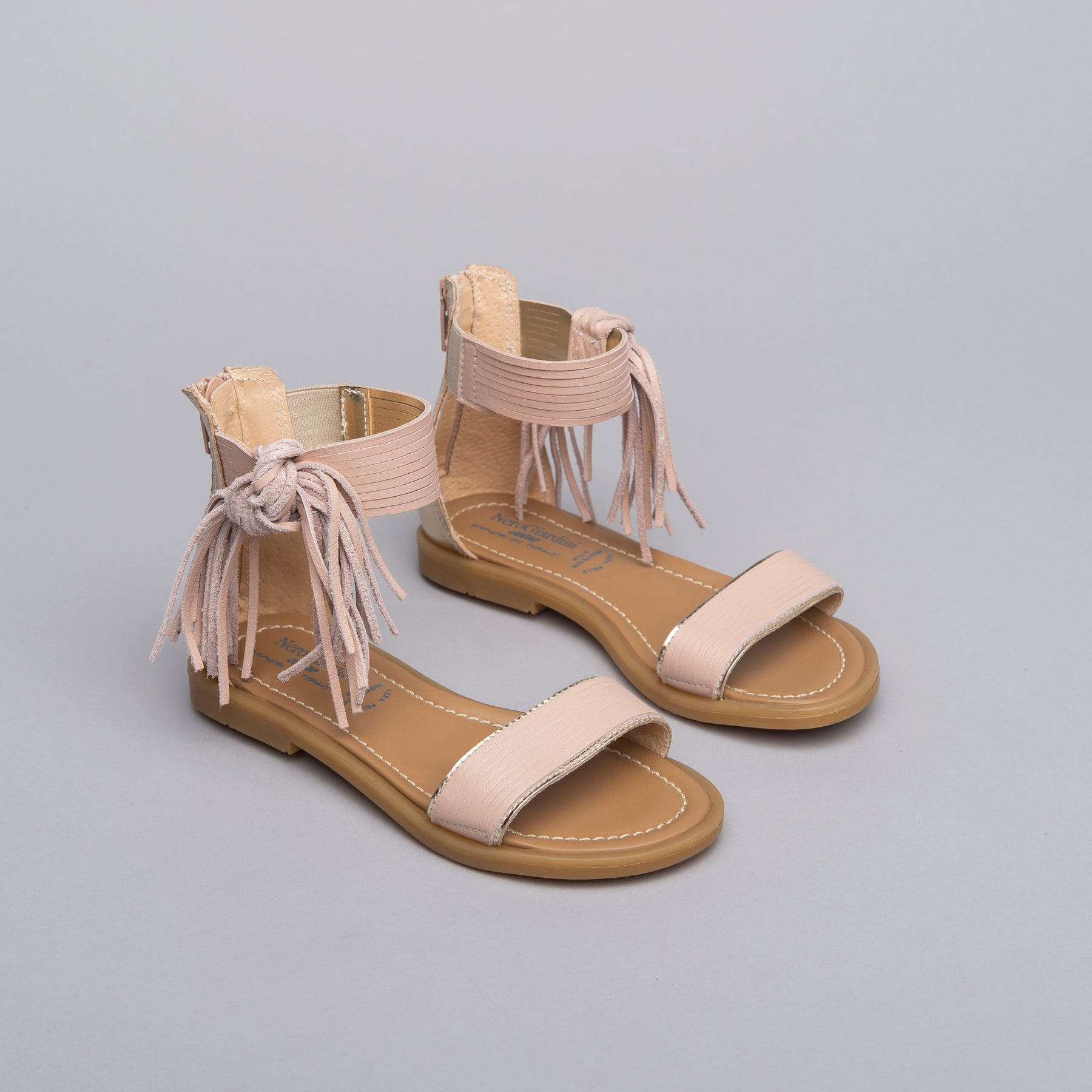 Sandali da ragazza realizzati in Italia con materiali di qualità e testati in laboratorio. Continua ricerca stilistica per trend nuovi e originali. Modello in pelle con frange. La zip di chiusura consente una calzata semplice e veloce.