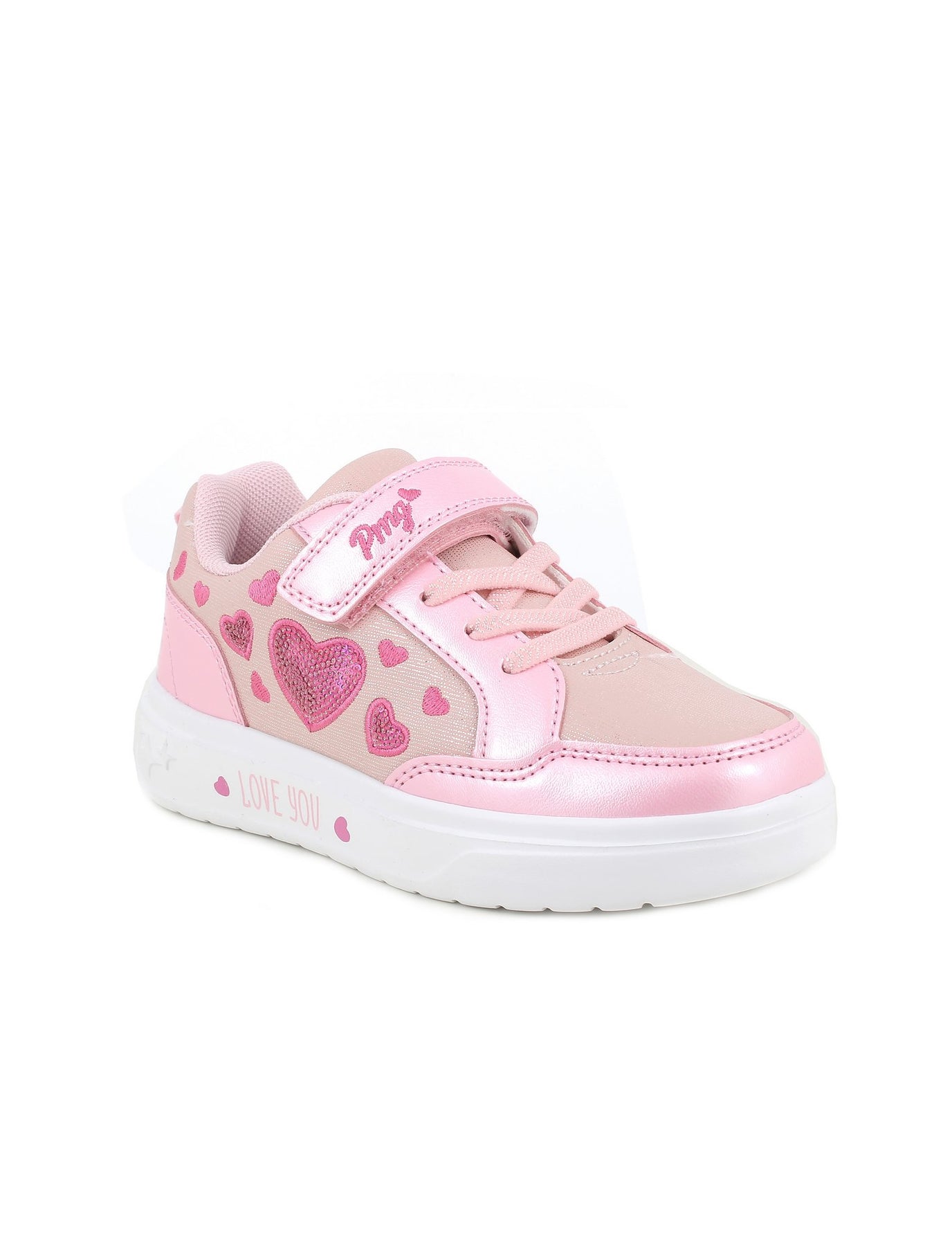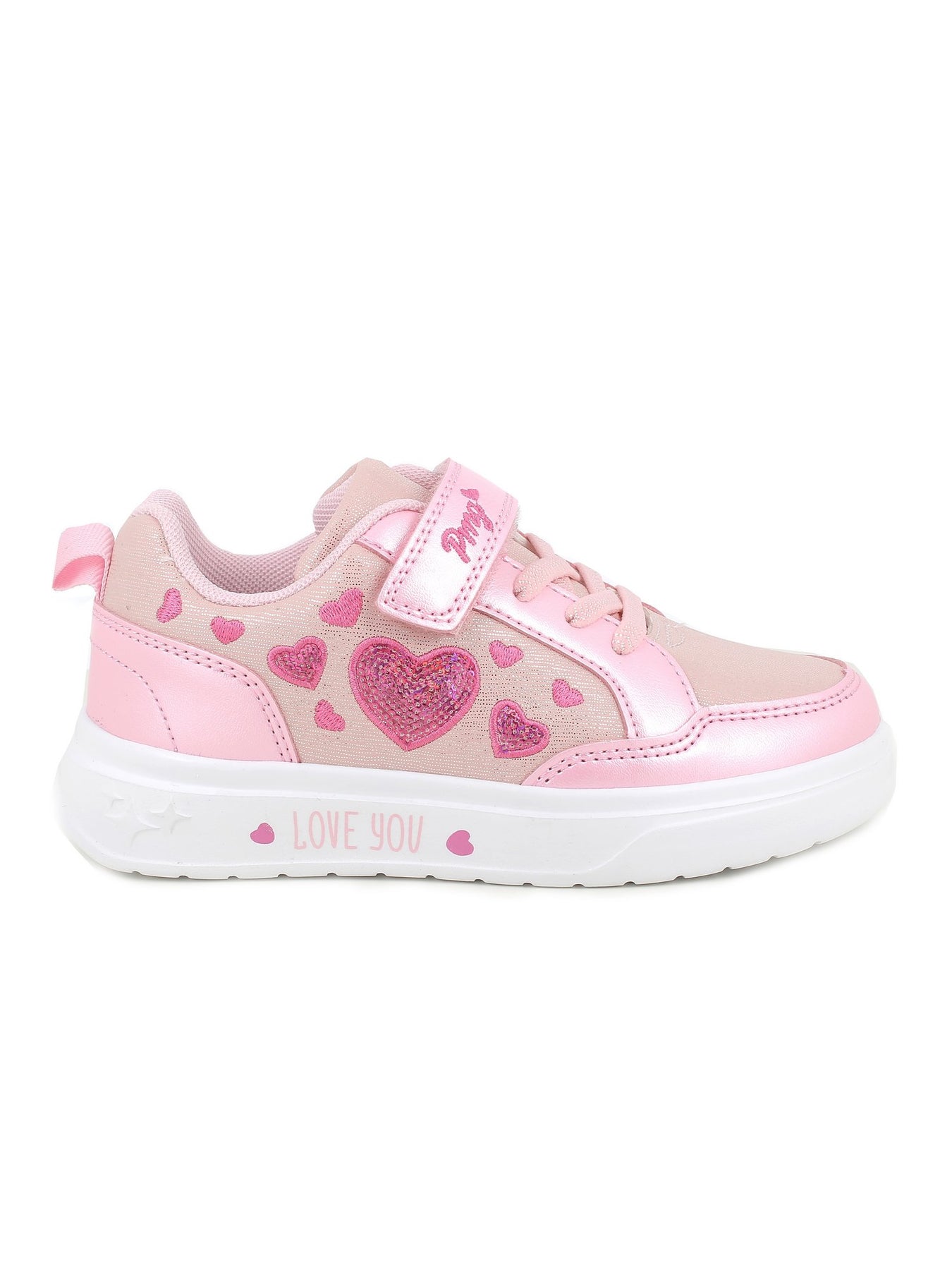 Tomaia Esterna: realizzata in materiale sintetico nella tonalità rosa con applicazioni a forma di cuore e dettagli decorativi, progettata per offrire resistenza, leggerezza e uno stile giocoso