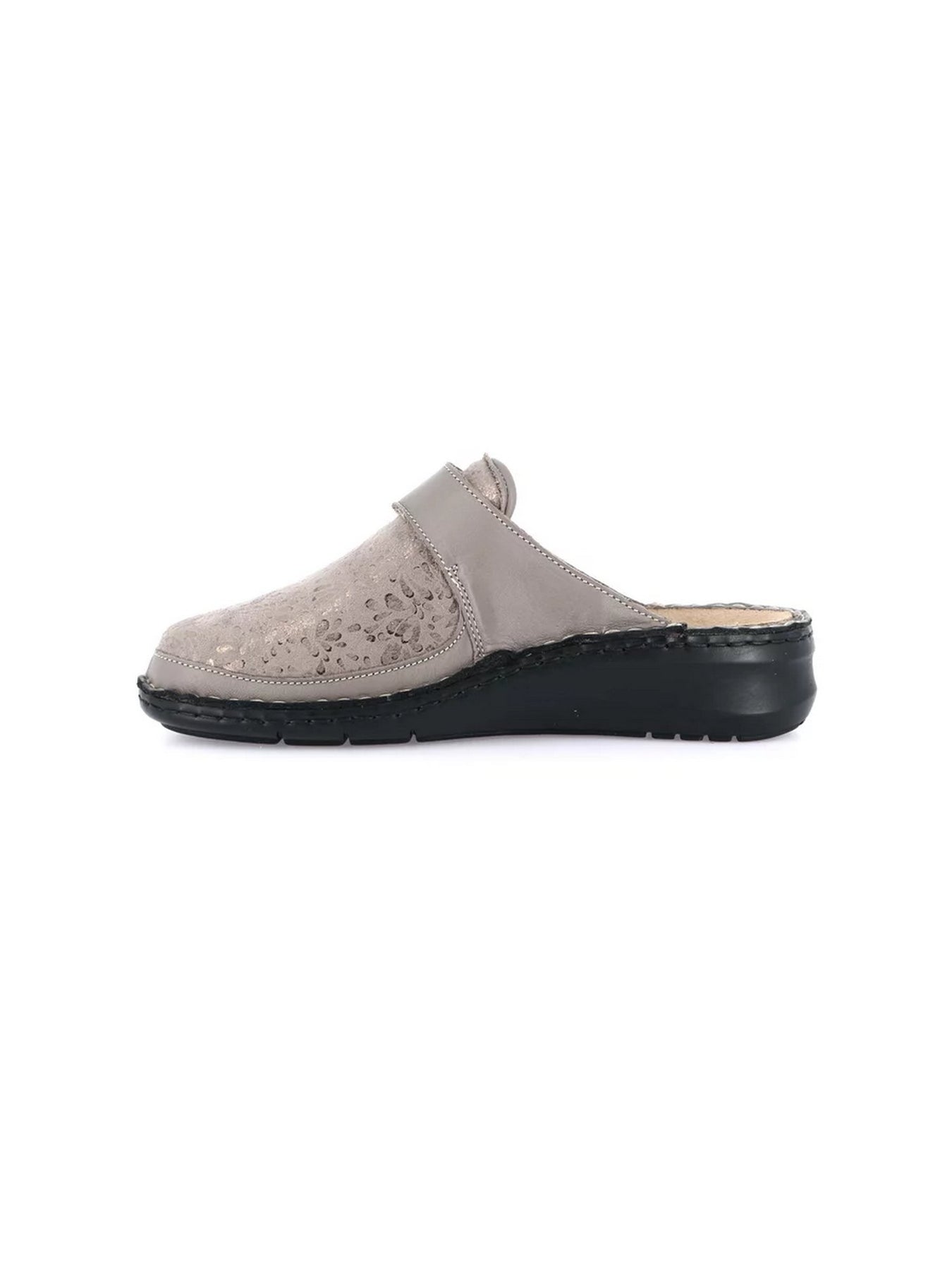 Realizzata in morbida pelle color taupe con inserti effetto velluto e finitura brillante, questa pantofola si distingue per il suo aspetto sofisticato e la cura nei particolari. Il cinturino con bottone decorativo assicura una calzata stabile e confortevole, mentre la suola in gomma leggera e antiscivolo offre sicurezza e flessibilità durante la camminata.