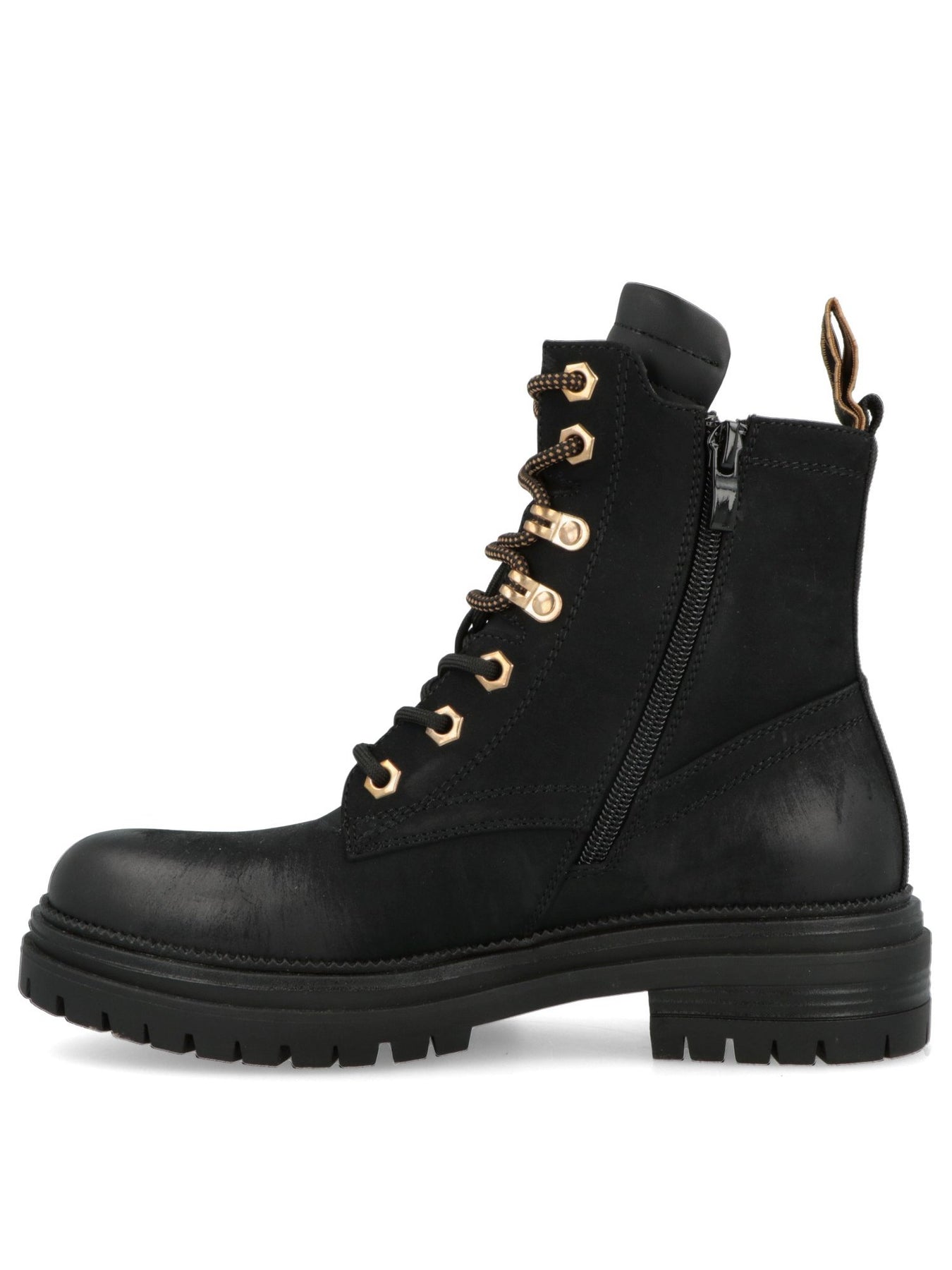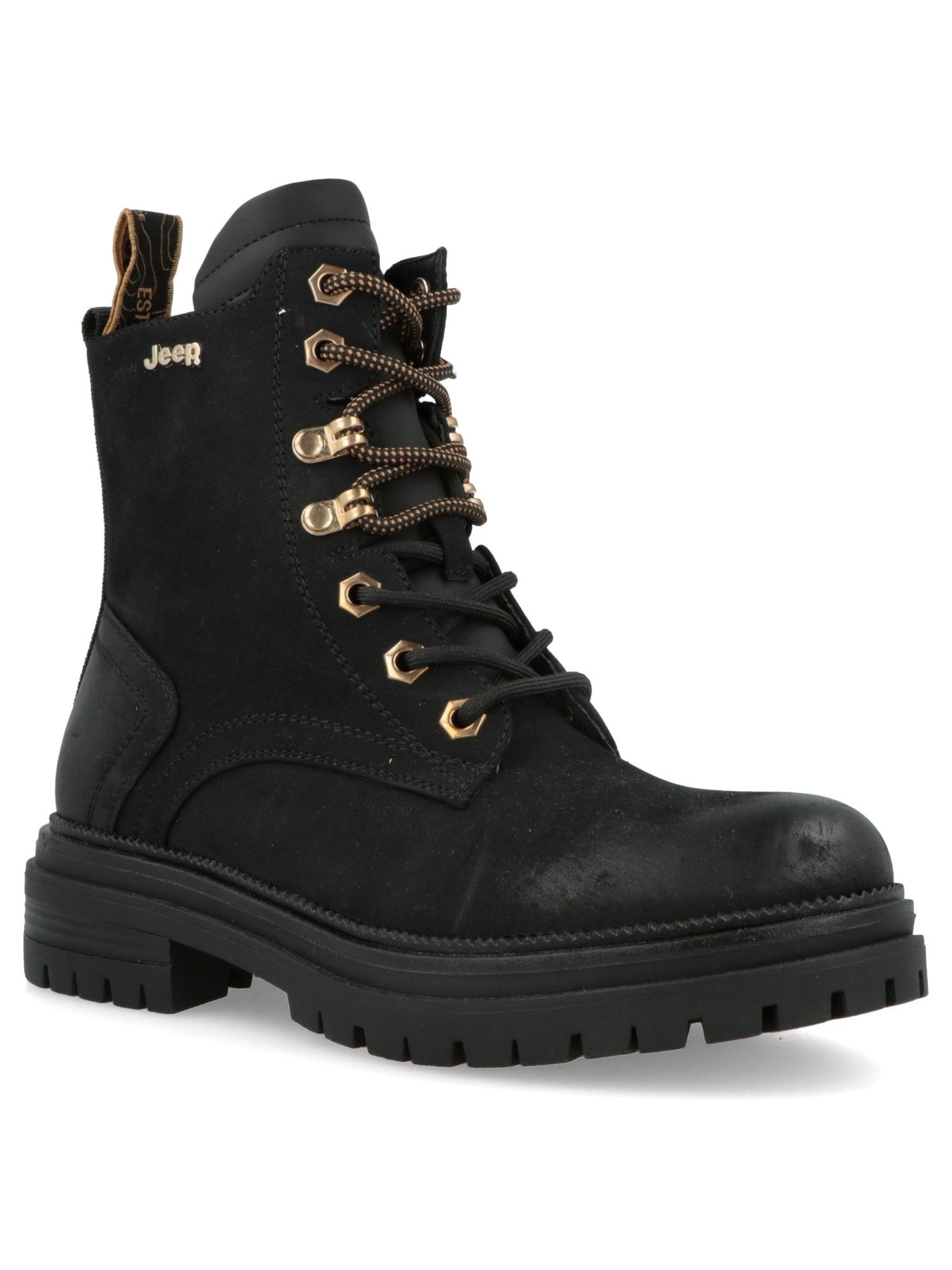 Realizzati in pelle scamosciata nera di alta qualità, presentano una struttura resistente e una linea essenziale ma d'impatto, arricchita da occhielli metallici dorati e dal logo JEEP laterale. La chiusura con lacci frontali e la cerniera laterale consentono una calzata comoda e pratica, garantendo al tempo stesso stabilità e sostegno.