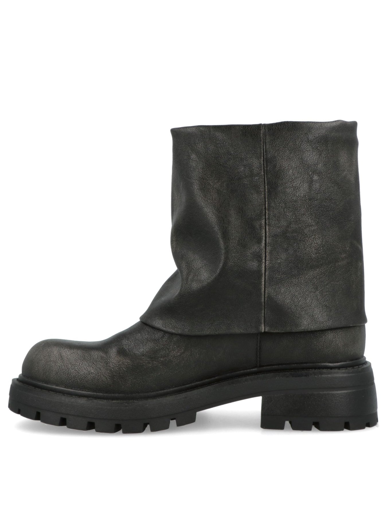 Realizzato in pelle effetto metallico color gun metal, questo tronchetto si distingue per il gambale morbido effetto drappeggiato e la fibbia decorativa con finitura bronzata, che donano carattere e personalità al design. La chiusura con cerniera laterale consente una calzata comoda e pratica, mentre la struttura avvolgente garantisce comfort e protezione.