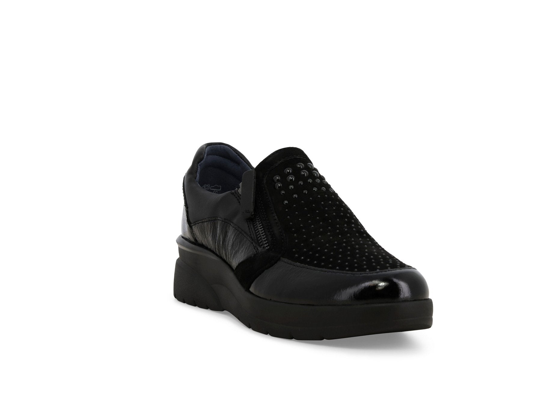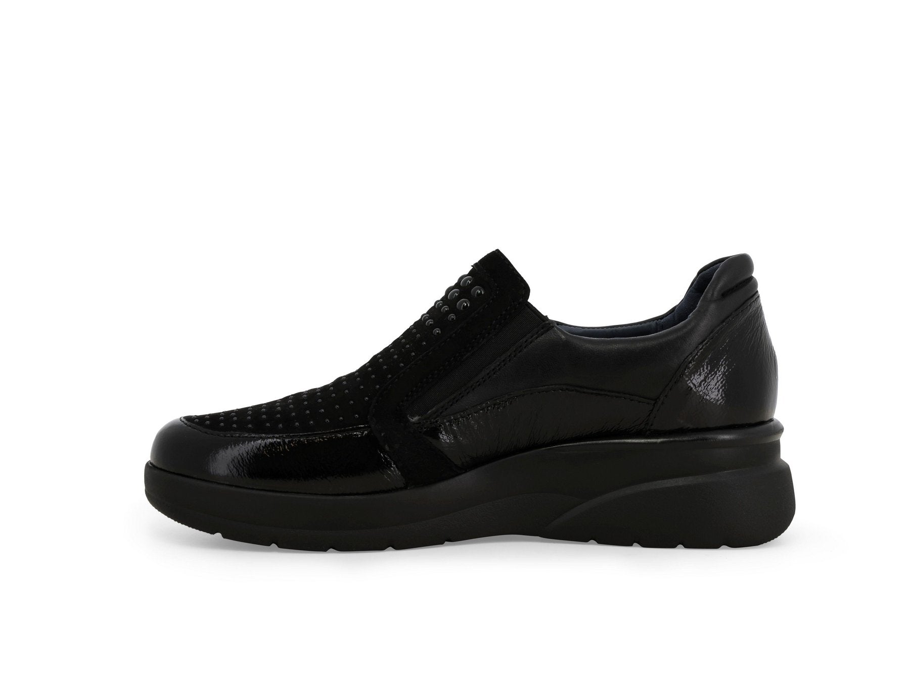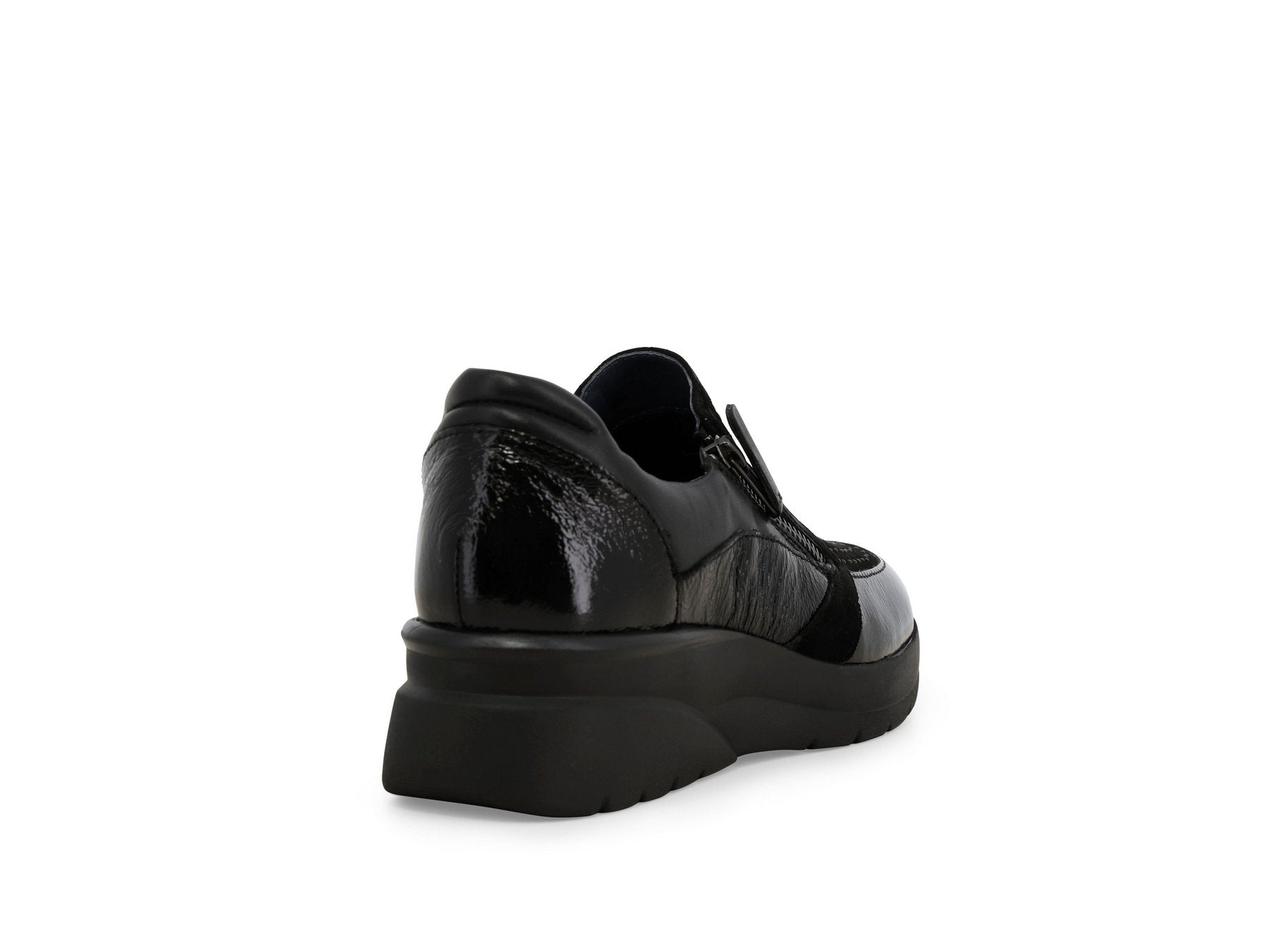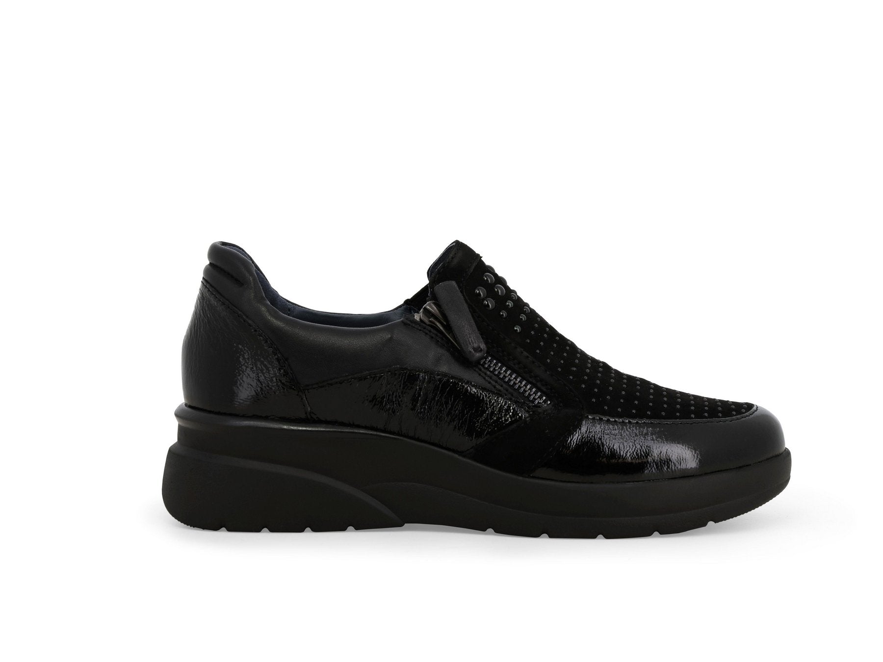 Realizzato in pelle verniciata nera con inserti elasticizzati effetto rete, questo mocassino Melluso unisce design e funzionalità in una struttura leggera e confortevole. La cerniera laterale facilita la calzata, offrendo praticità e una perfetta aderenza al piede.