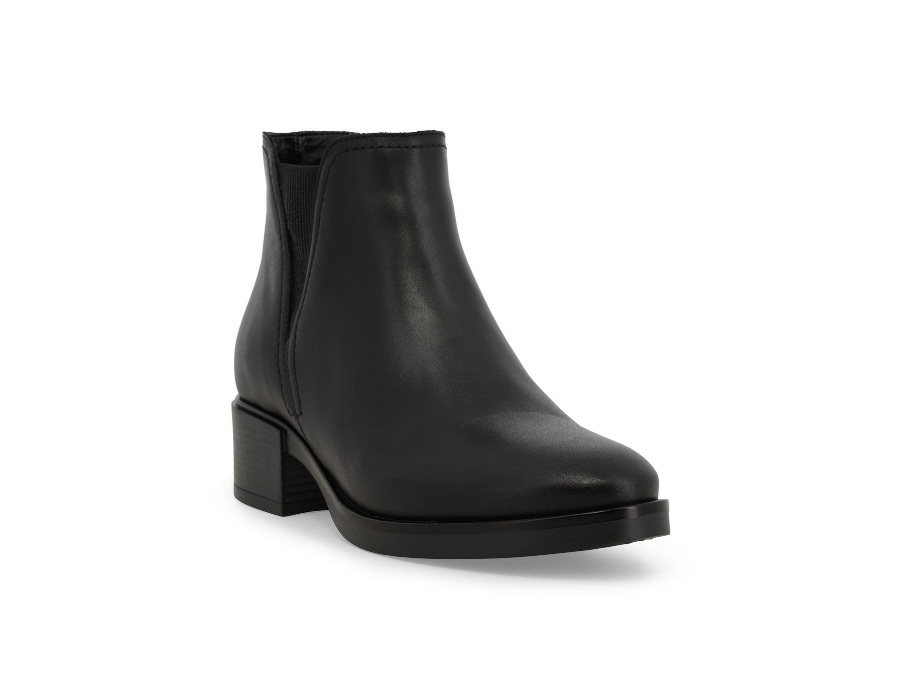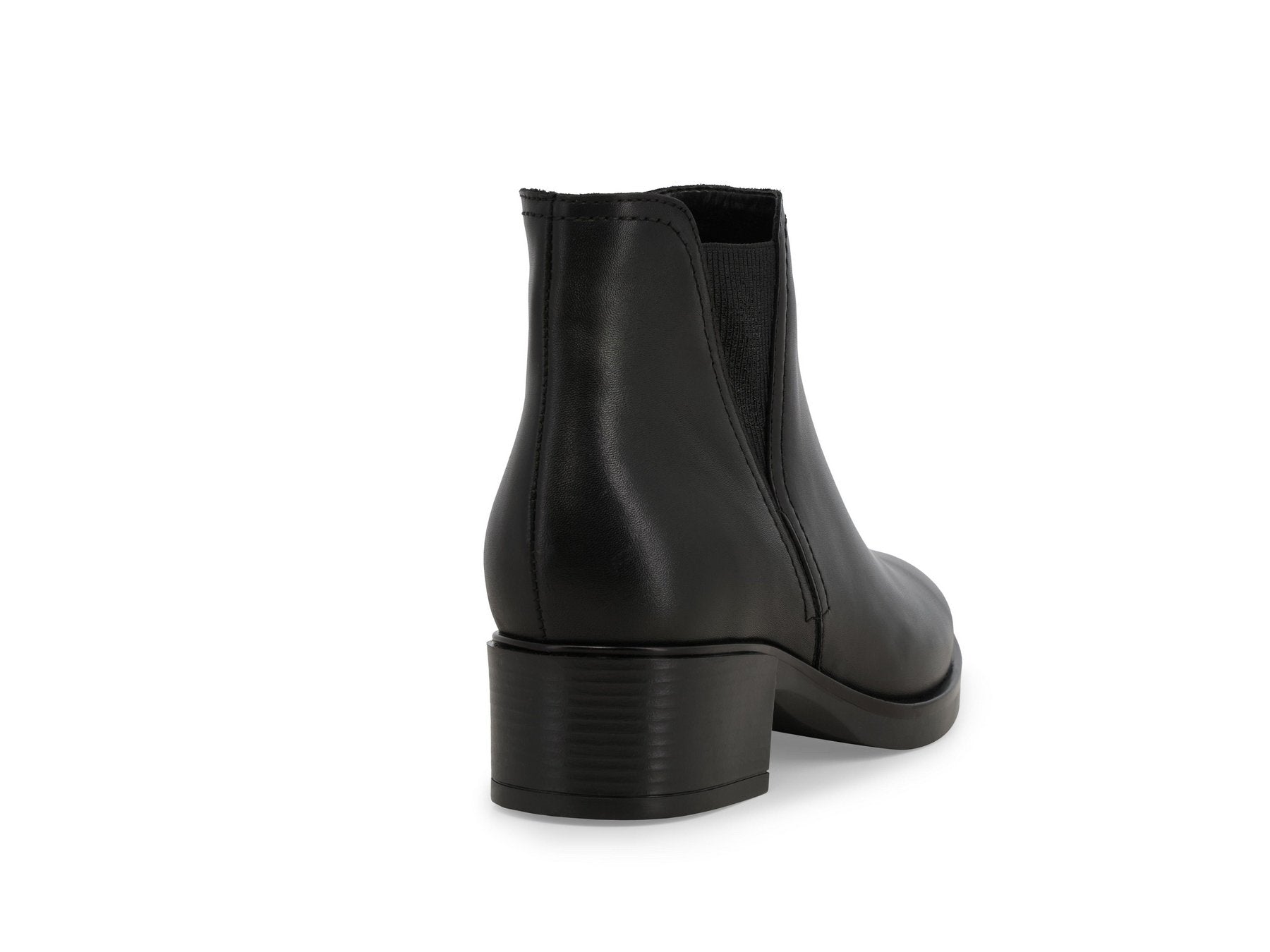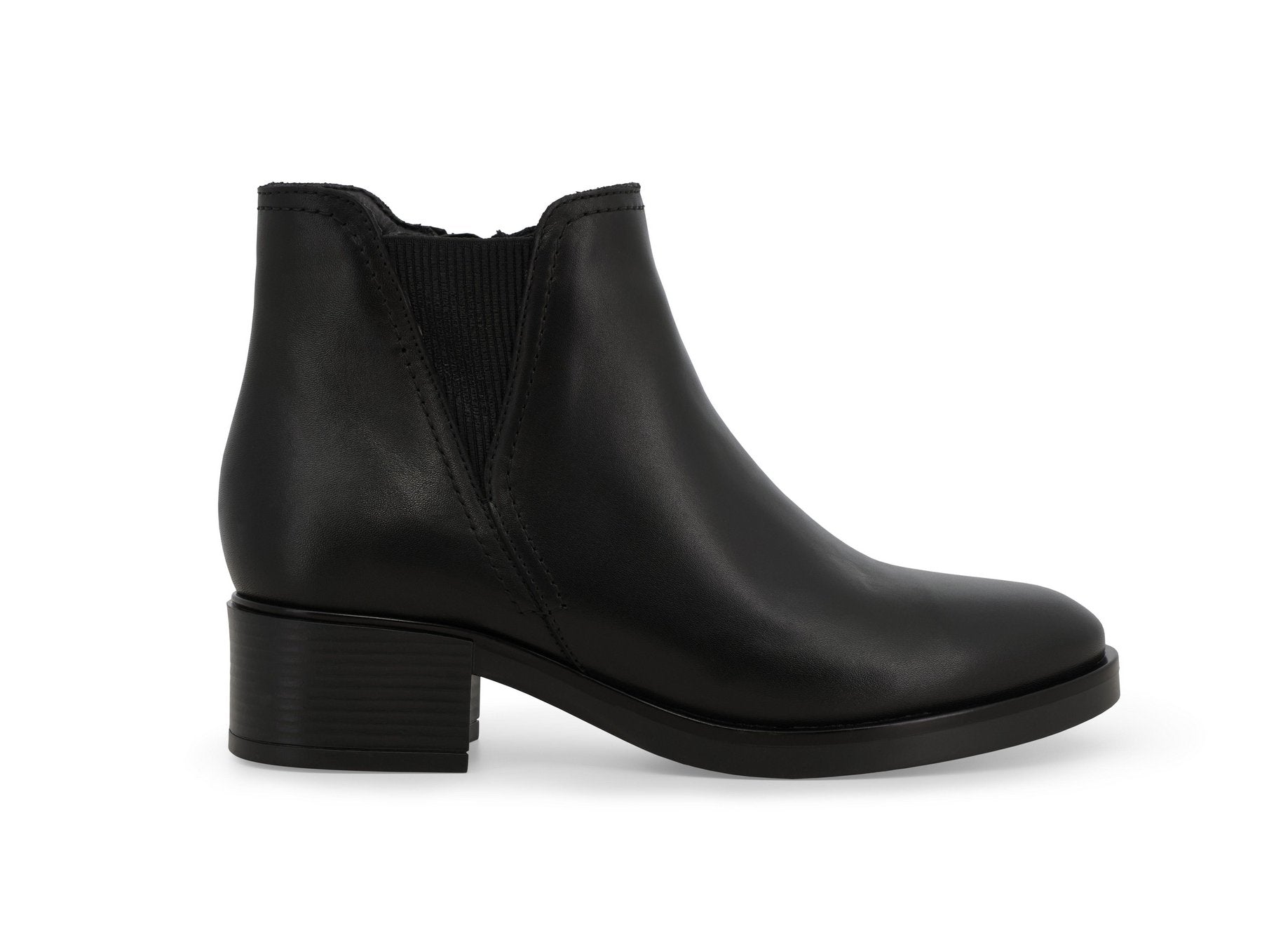 Realizzato in pelle nera liscia di alta qualità, presenta un design sobrio e moderno che lo rende estremamente versatile. Gli inserti elastici laterali garantiscono una calzata facile e adattabile, mentre il tacco basso e stabile assicura comfort e sostegno per tutto il giorno.