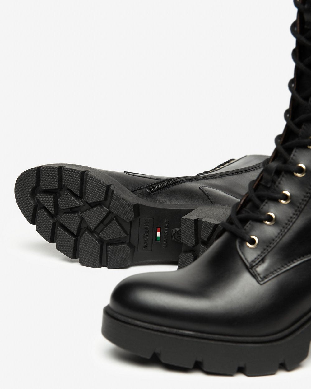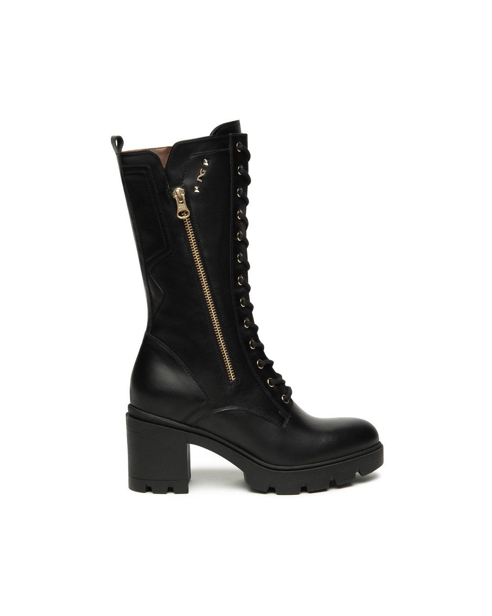 Realizzato in pelle nera di alta qualità, presenta una chiusura frontale con lacci e una zip laterale dorata che facilita la calzata e aggiunge un tocco sofisticato.
