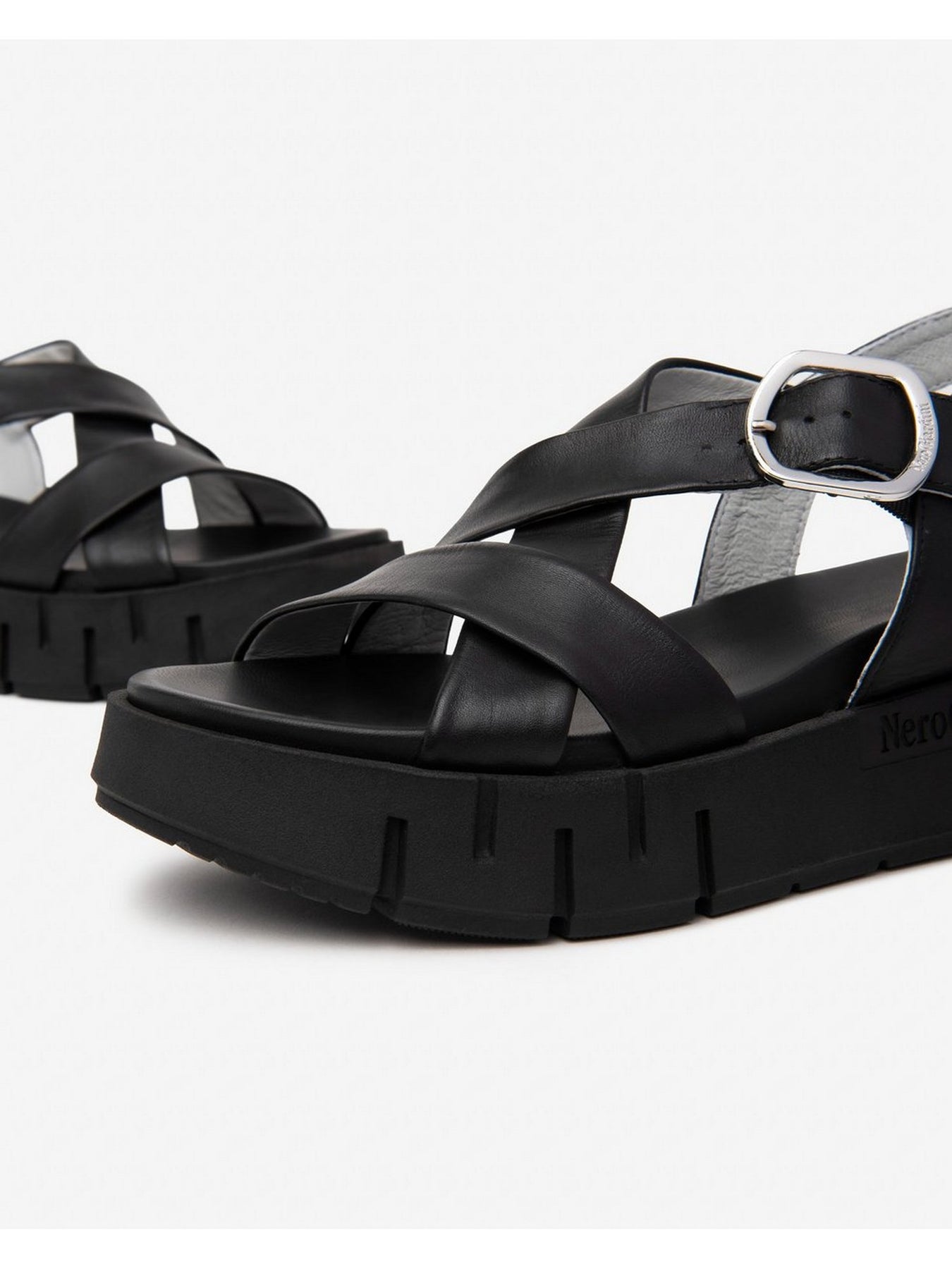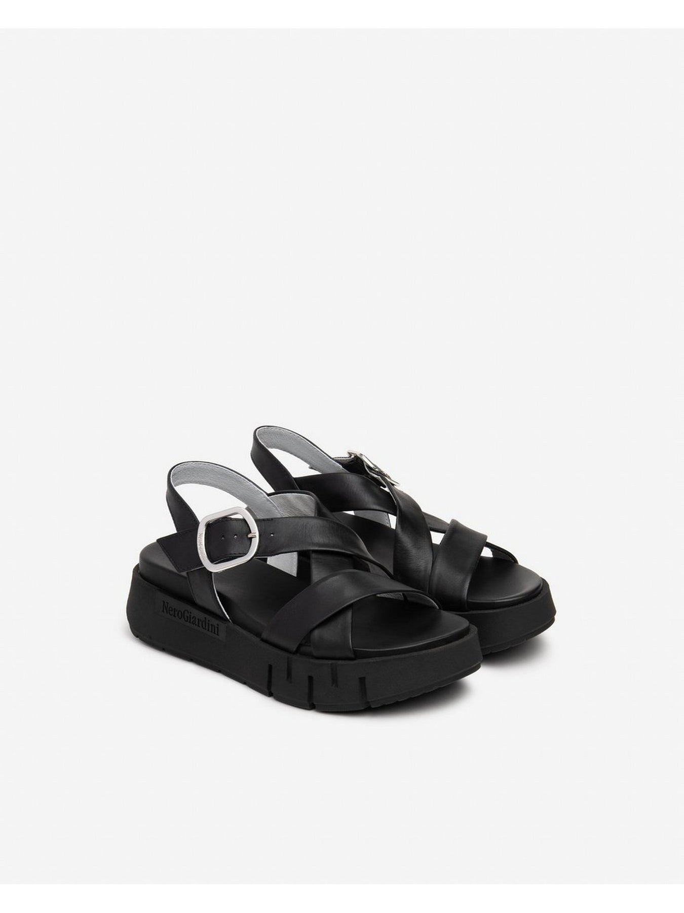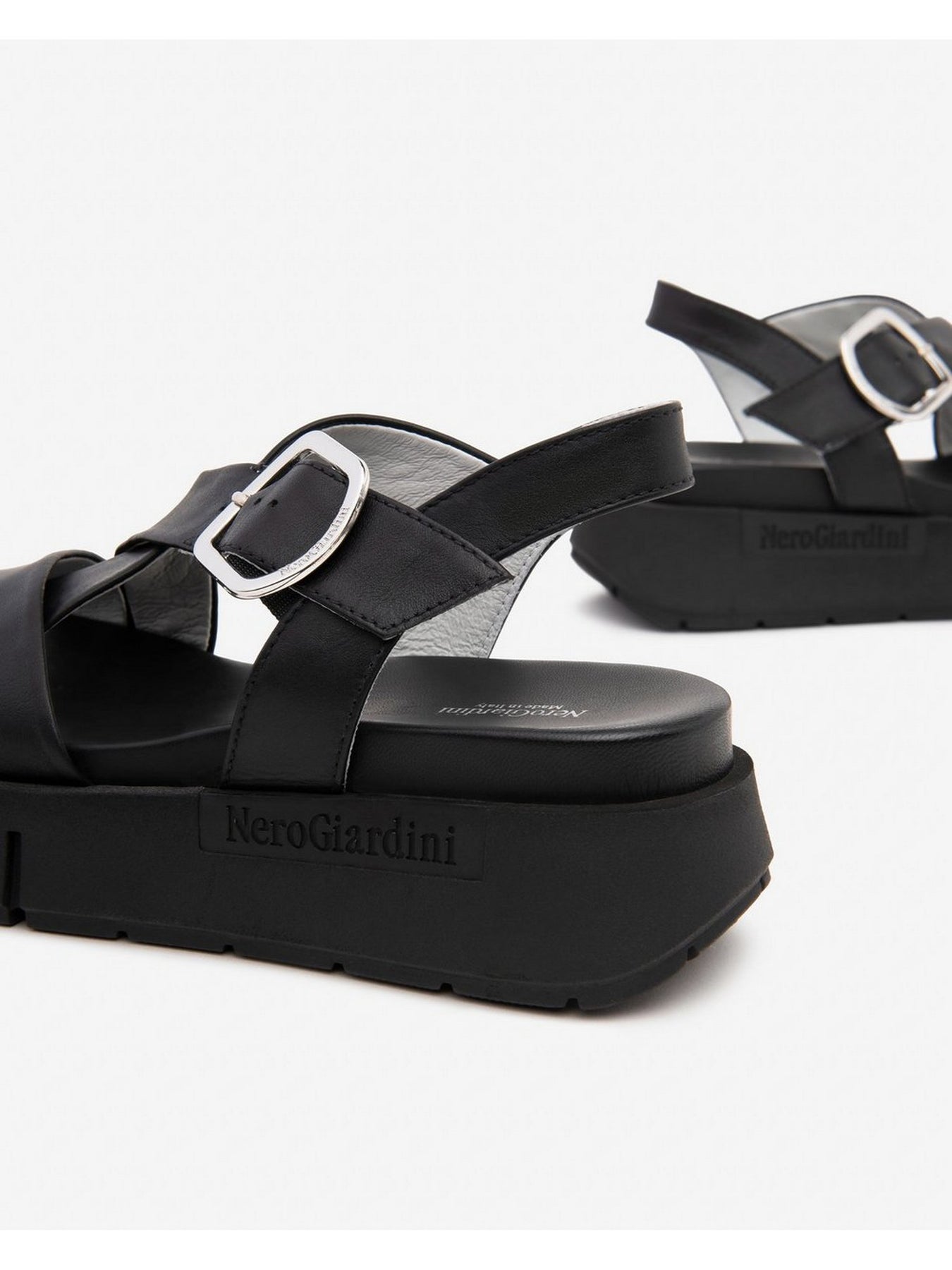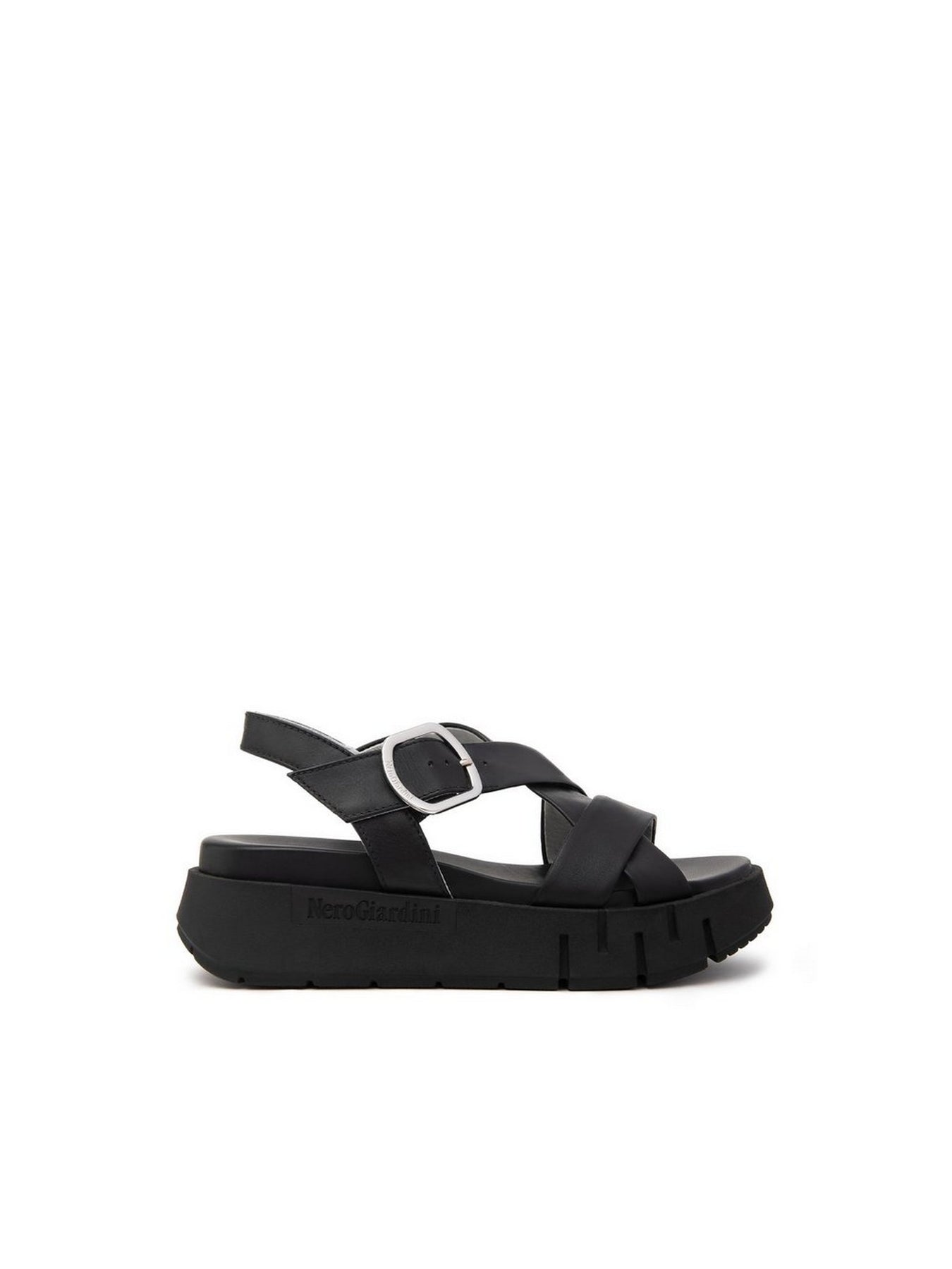 Il sandalo con zeppa NERO GIARDINI E513696D in nero è la scelta ideale per chi cerca uno stile urban grintoso senza rinunciare al comfort. Le fasce incrociate in pelle e la maxi fibbia laterale donano un tocco deciso e contemporaneo, perfetto per la città o il tempo libero.
