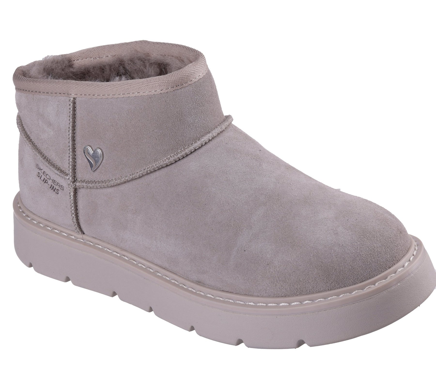 Realizzate in morbida microfibra effetto scamosciato color beige, le Keepsakes Cozy si distinguono per la loro estetica semplice e raffinata. L'interno è foderato in morbido peluche sintetico, che assicura una piacevole sensazione di calore e comfort prolungato. Il piccolo logo a cuore metallico laterale aggiunge un dettaglio femminile e distintivo.